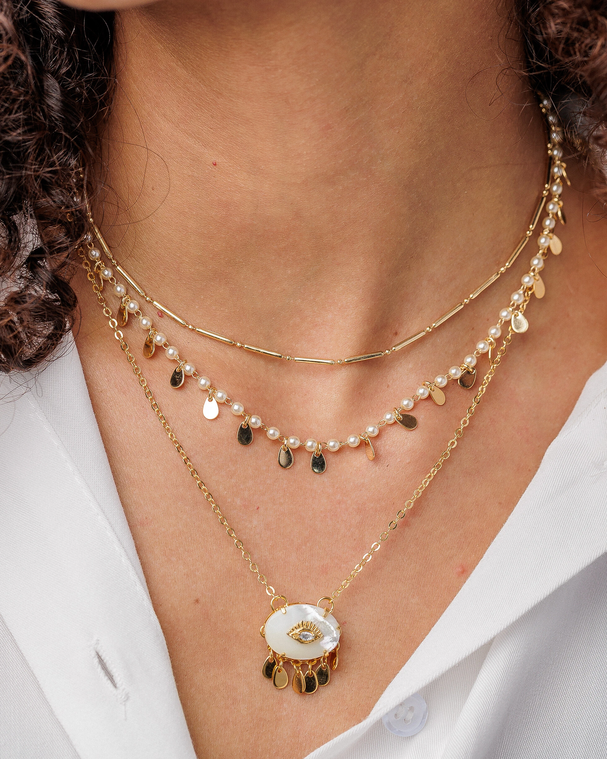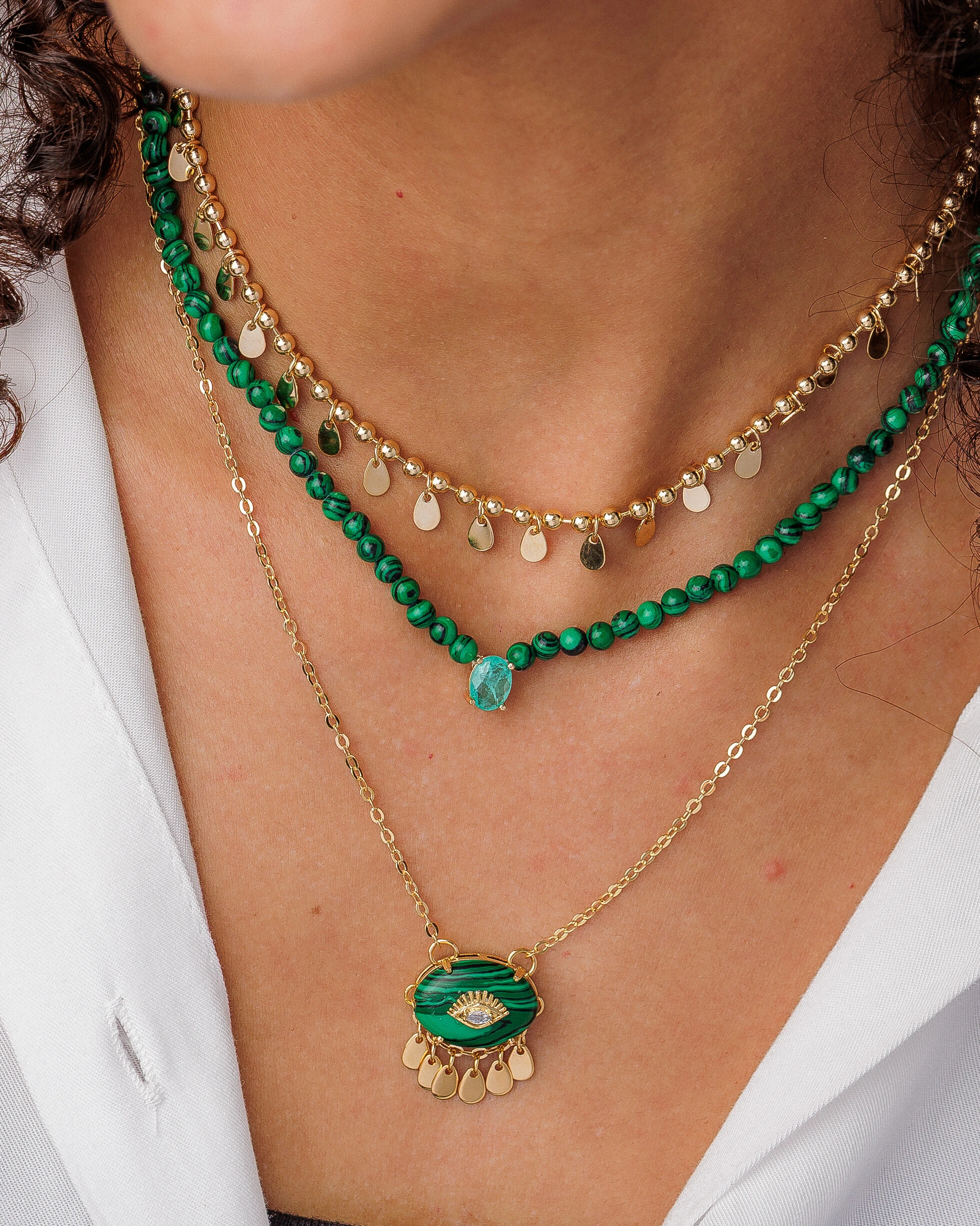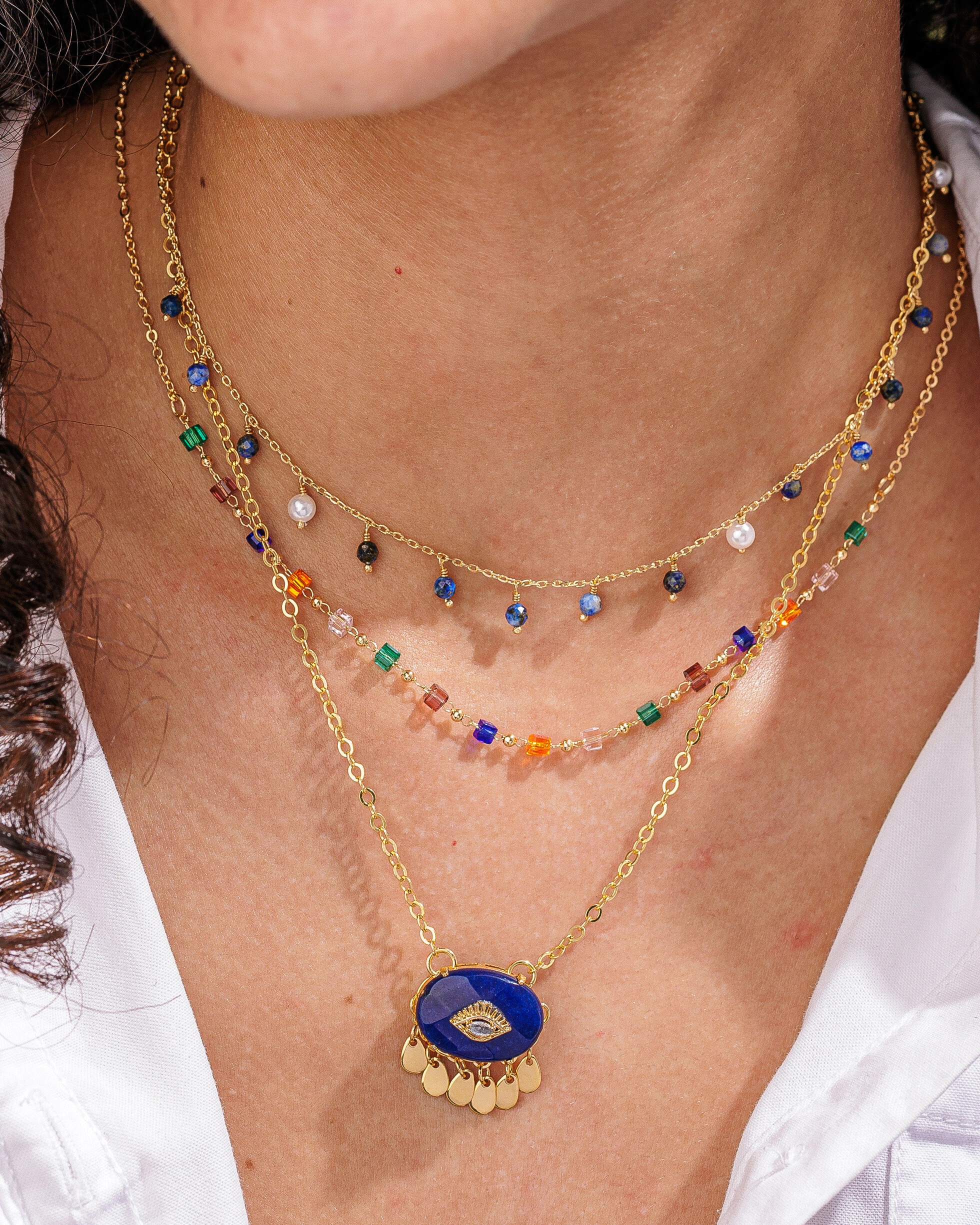 Colar Dhara, com corrente de elos finos e pingente central composto por uma pedra natural com um símbolo de olho grego dourado e brilhante no centro. A base do pingente é adornada com pequenas plaquinhas douradas em formato de gota, trazendo movimento e um toque místico à peça. Com pingentes em pedras naturais, portanto podendo haver variação de tamanhos e cores.