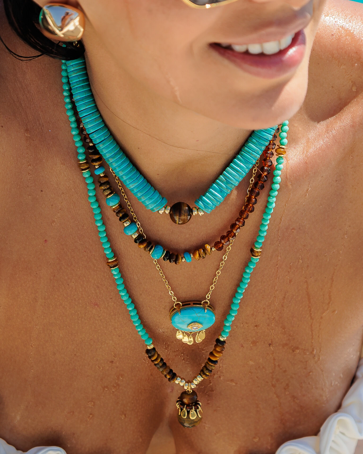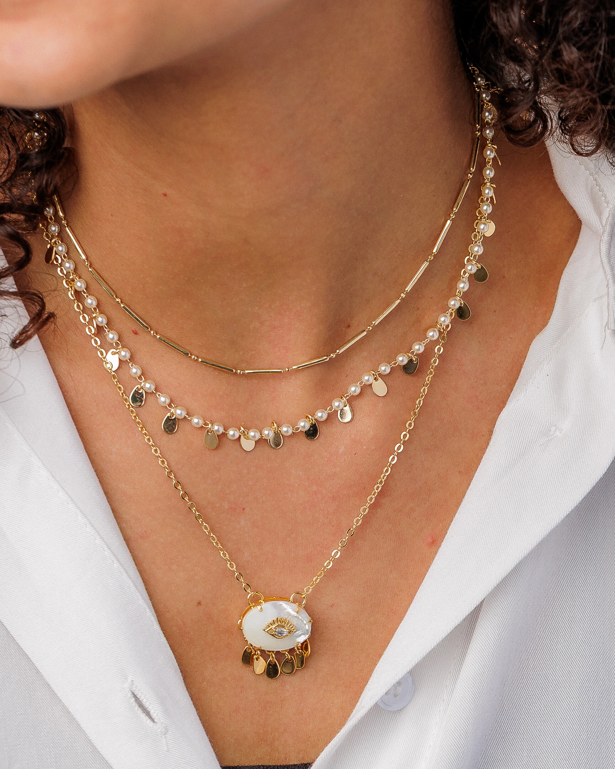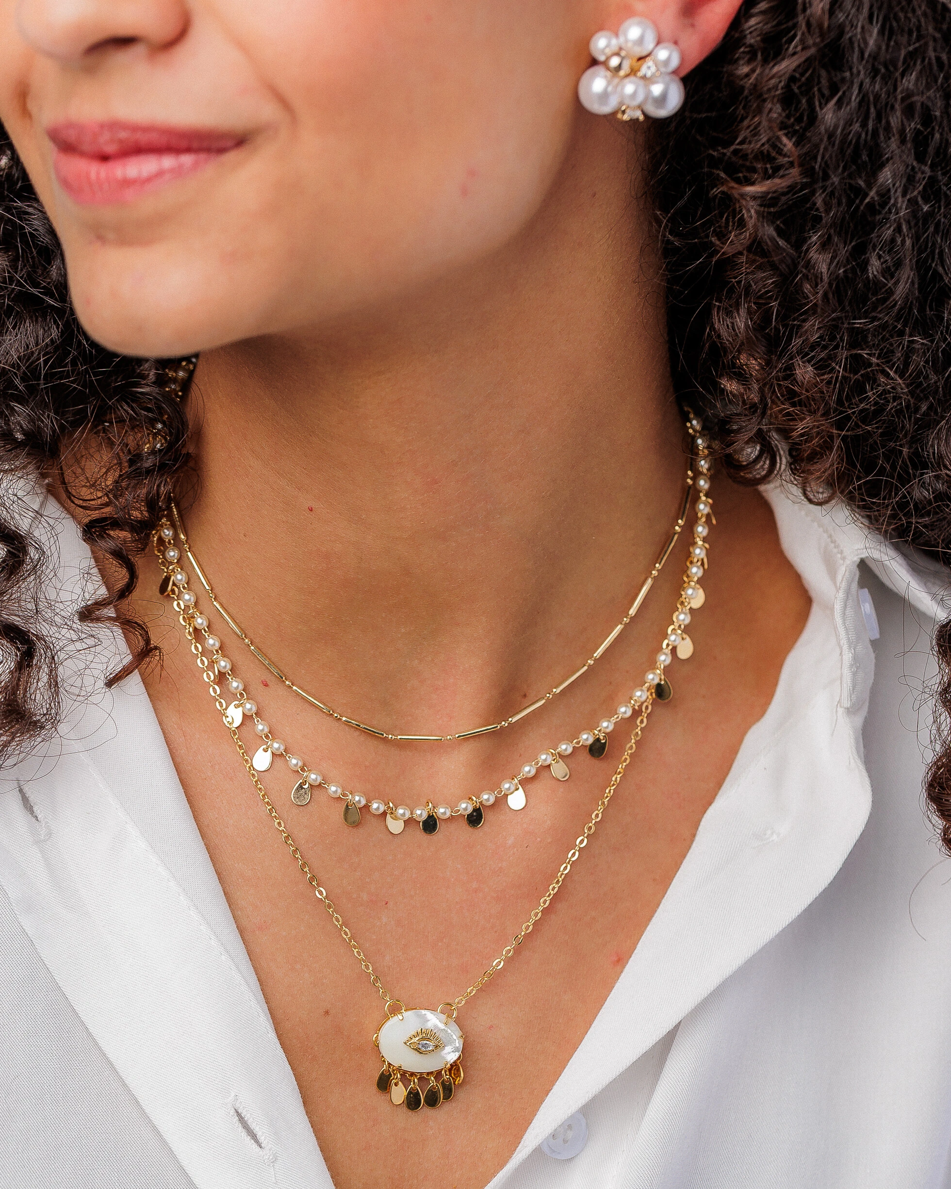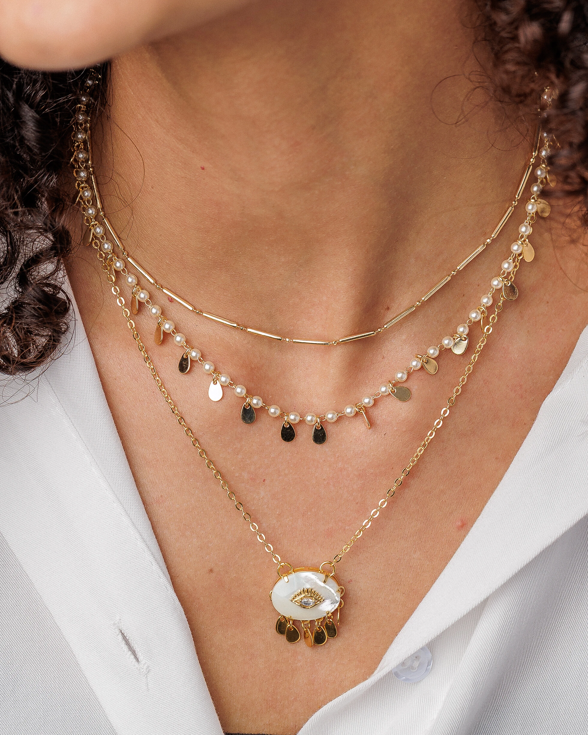 Colar Dhara, com corrente de elos finos e pingente central composto por uma pedra natural com um símbolo de olho grego dourado e brilhante no centro. A base do pingente é adornada com pequenas plaquinhas douradas em formato de gota, trazendo movimento e um toque místico à peça. Com pingentes em pedras naturais, portanto podendo haver variação de tamanhos e cores.