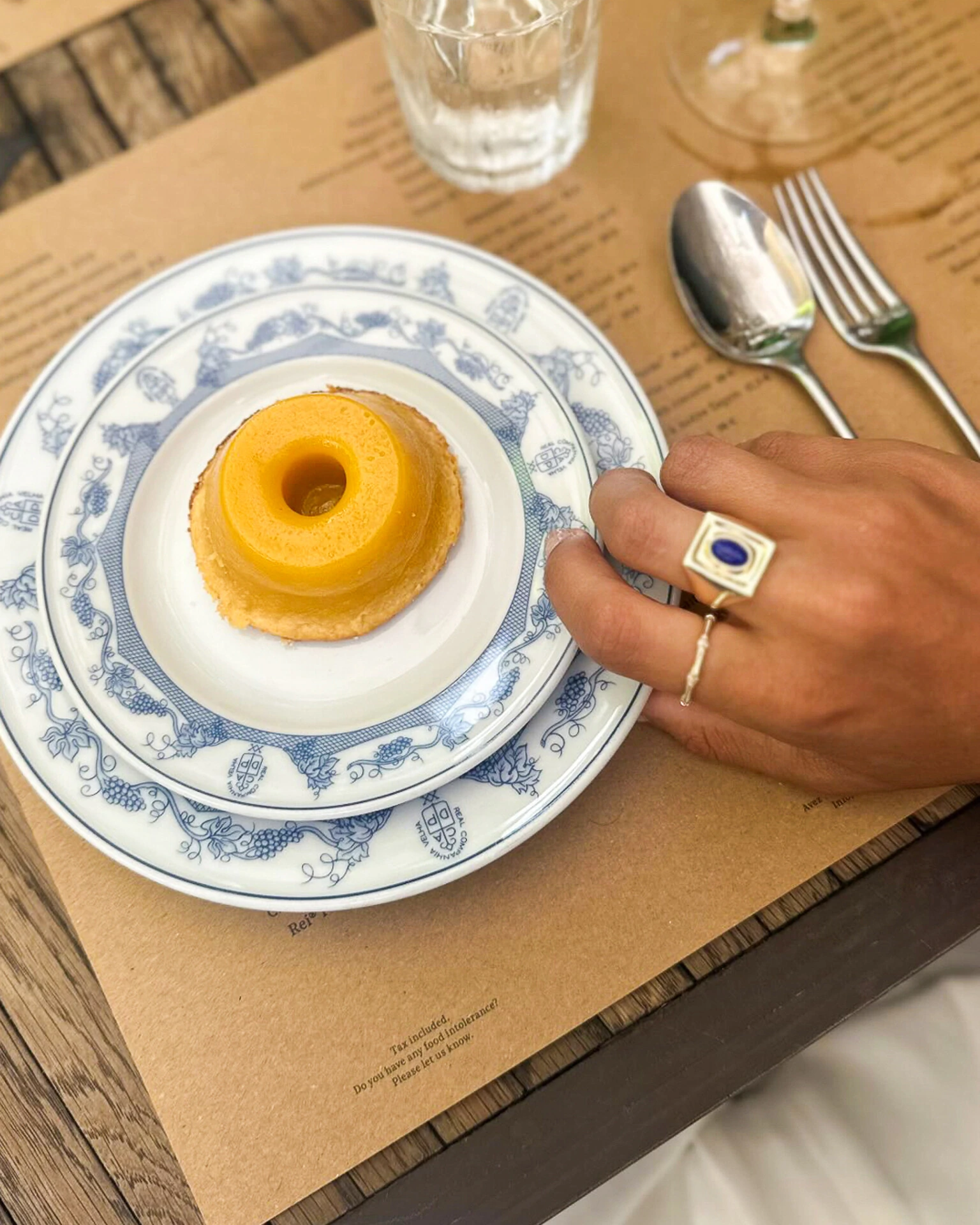 Anel Céu de Capri tem um design imponente e geométrico que transmite sofisticação e presença. Topo quadrado, que abriga ao centro uma pedra oval lisa em tom azul profundo, criando um contraste marcante com o dourado.