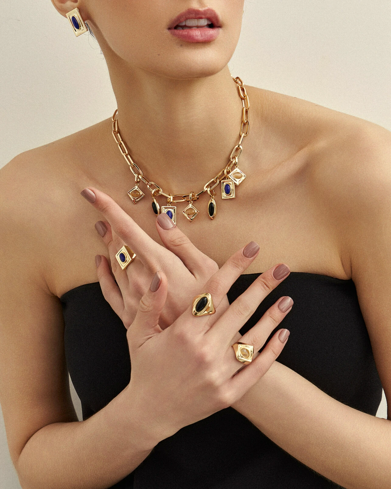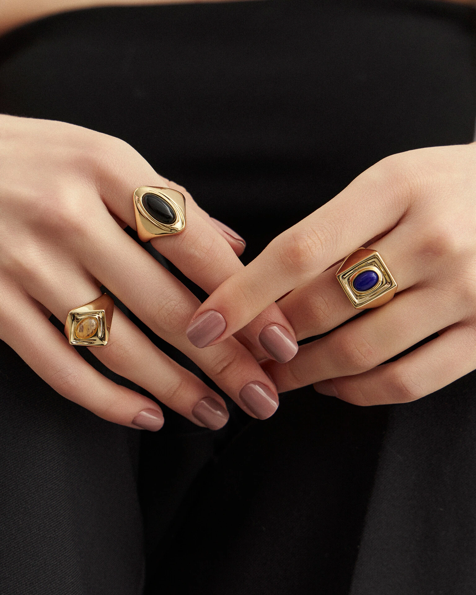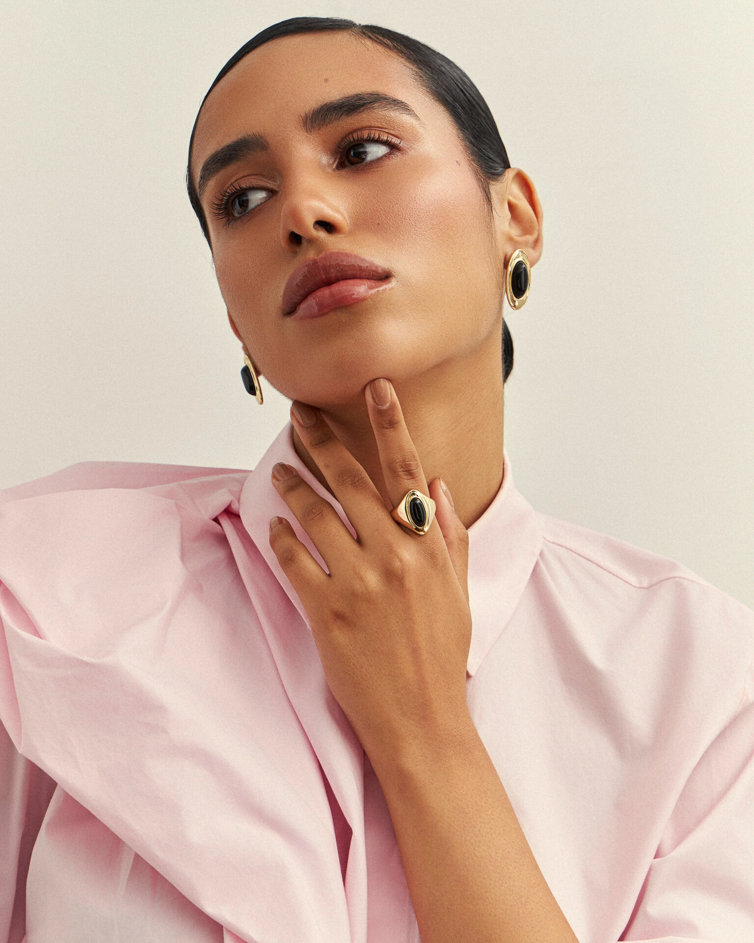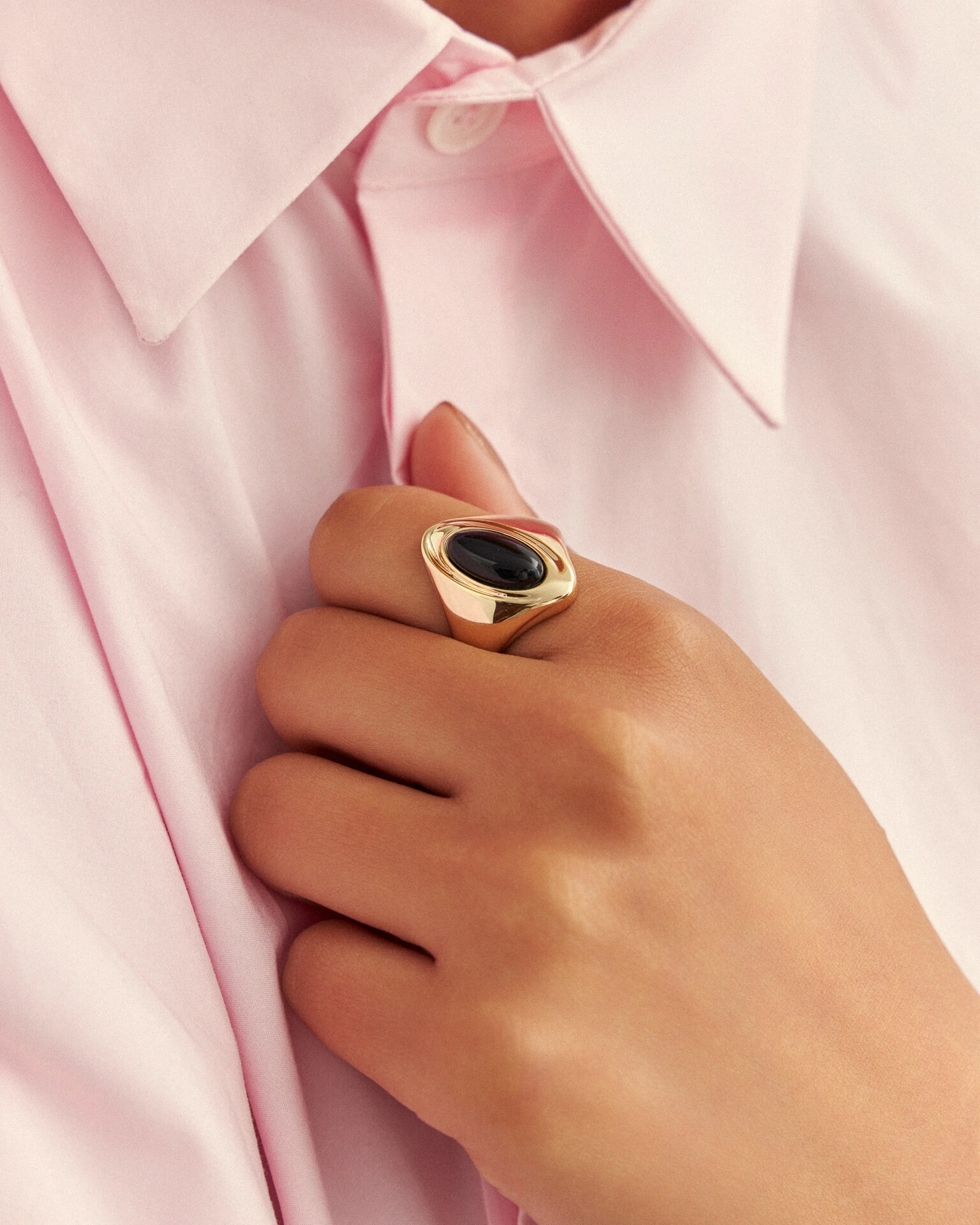 Anel Ônix Eclipse, Um anel sofisticado e moderno, com design arredondado em banho de ouro e uma pedra preta oval que remete à elegância do eclipse. Perfeito para quem busca uma peça marcante e cheia de personalidade, capaz de complementar tanto looks casuais quanto formais. Historicamente, o ônix é celebrado por suas propriedades protetoras e estabilizadoras, atuando como um escudo contra energias negativas e promovendo equilíbrio emocional. Este anel não apenas enriquece sua coleção com elegância atemporal, mas também serve como um amuleto de força e serenidade, ideal para quem busca aliar estilo e simbolismo em uma única peça.