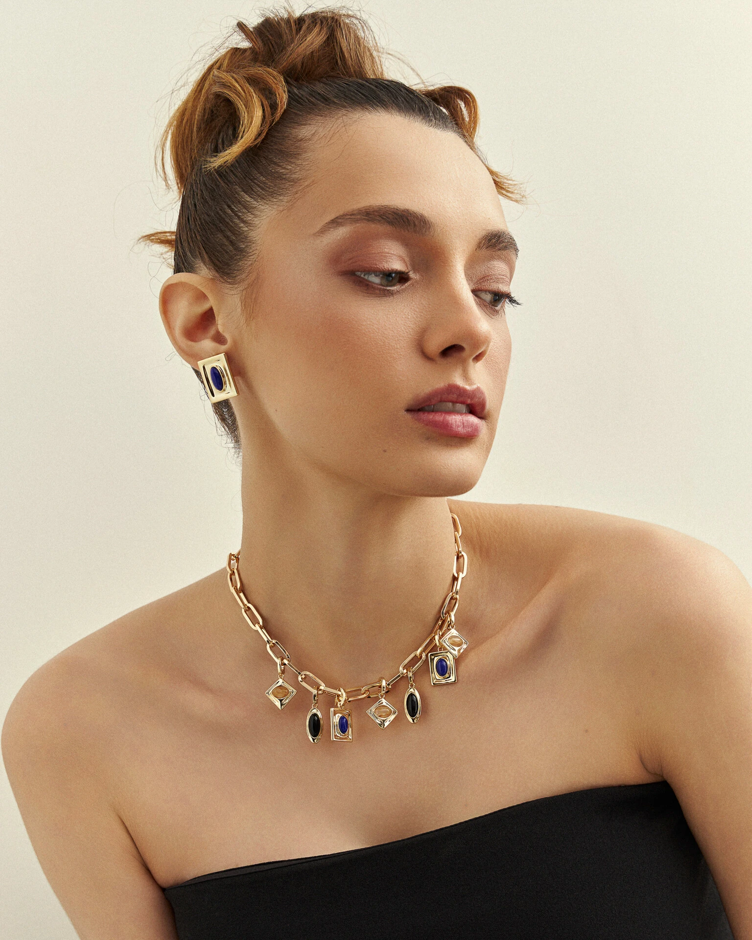 Brinco Céu de Capri tem um design marcante e geométrico que transmite sofisticação e presença. Brinco retangular, que abriga ao centro uma pedra oval lisa em tom azul profundo, criando um contraste marcante com o dourado. Leve e confortável, acomoda-se facilmente na orelha.