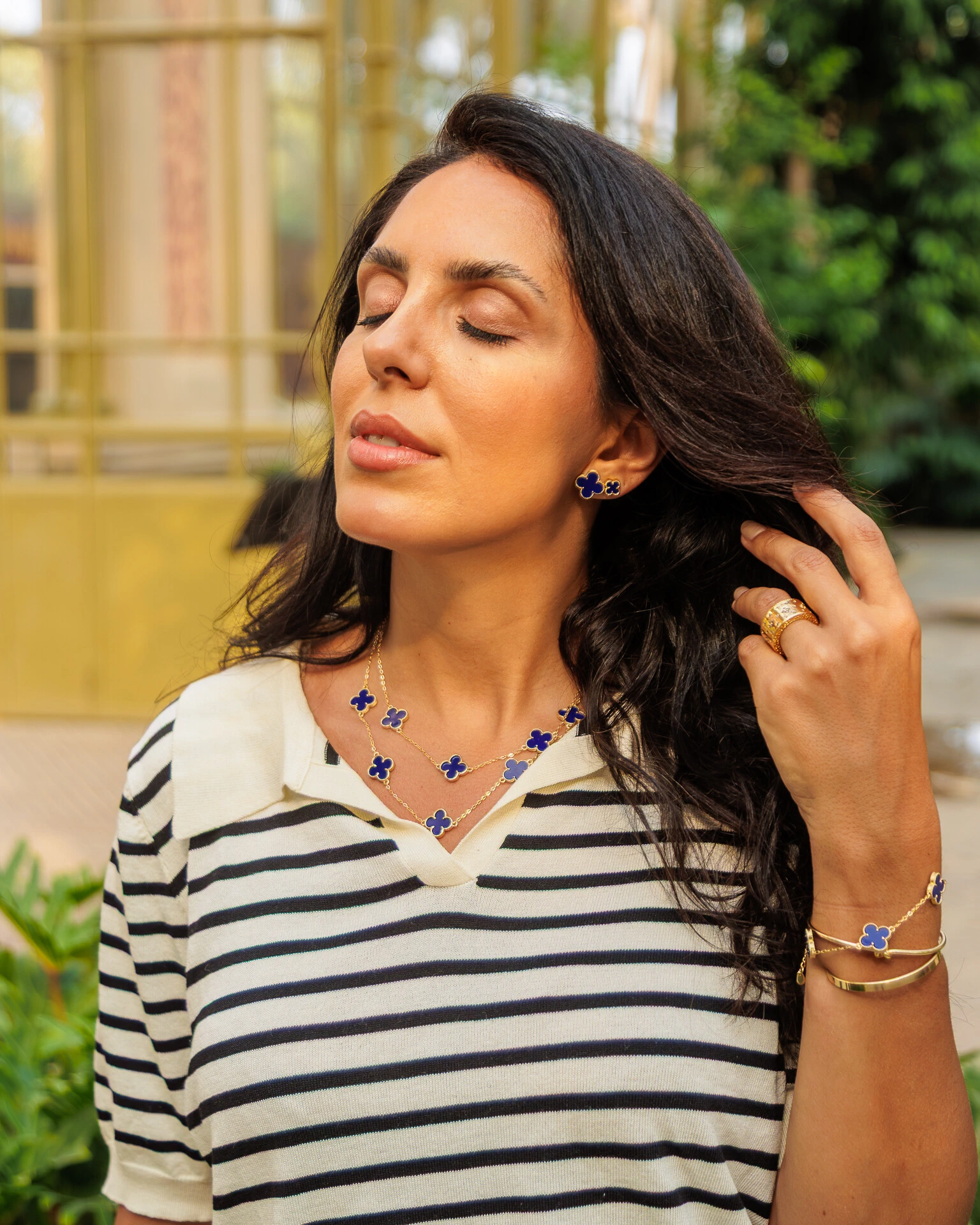 O irresistível design de trevo, Colar Três Trevos Lize , em banho de ouro 18k, lapidados em acrilíco, surpreendem com a beleza e suavidade do tons de azul, que transmite elegância e sofisticação. O toque de requinte fica por conta de suas molduras delicadamente trabalhadas em relevo.