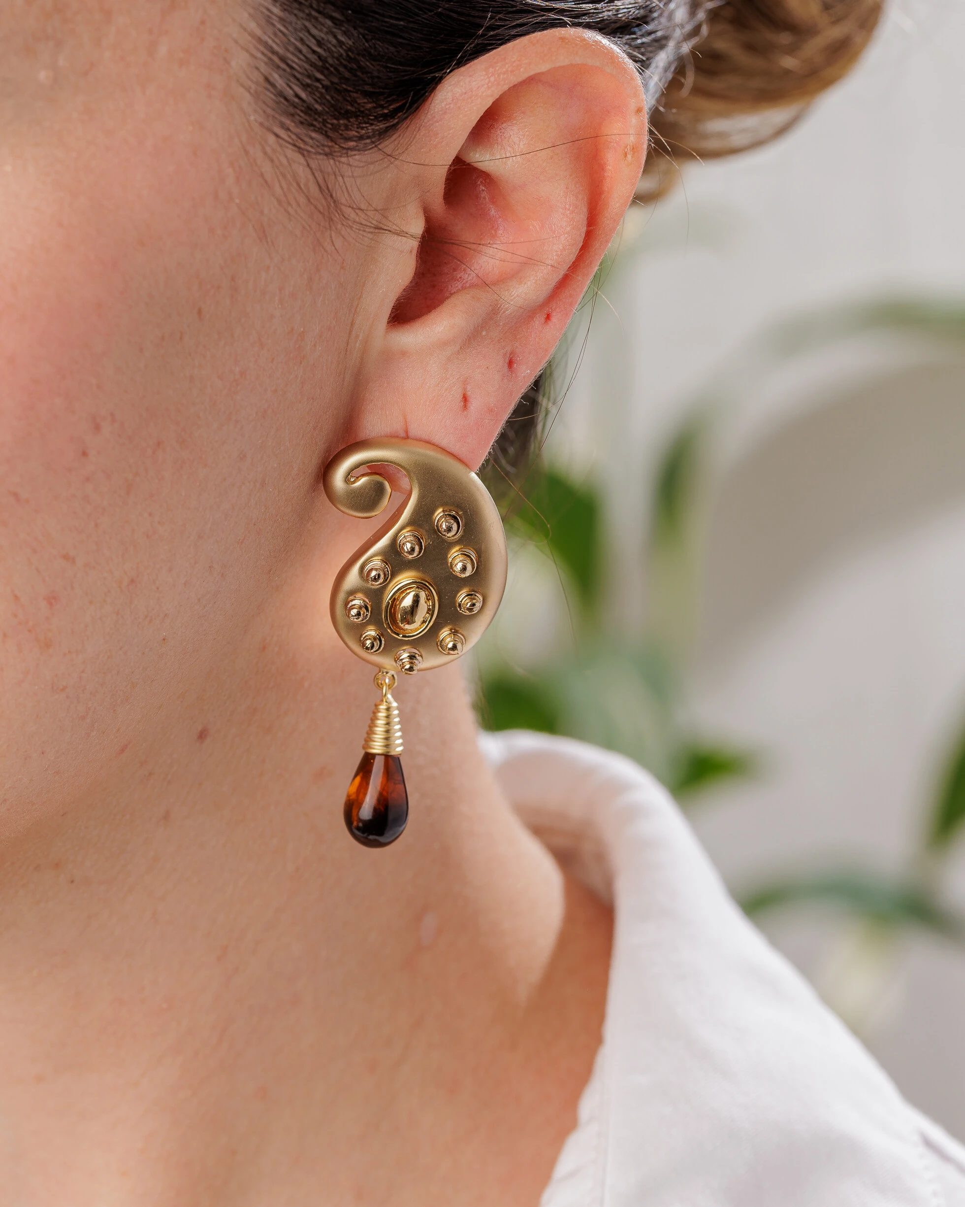 Brinco em banho de Ouro 18k, com base em formato orgânico que remete à clássica estampa paisley. Decorado com aplicações em relevo e finalizado com pingente em gota. Uma peça elegante e sofisticada, que une inspiração atemporal a um design moderno.