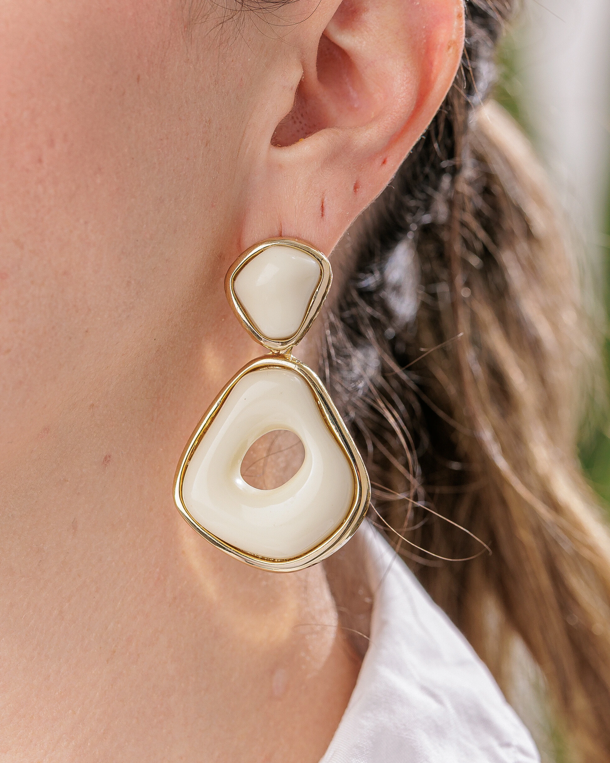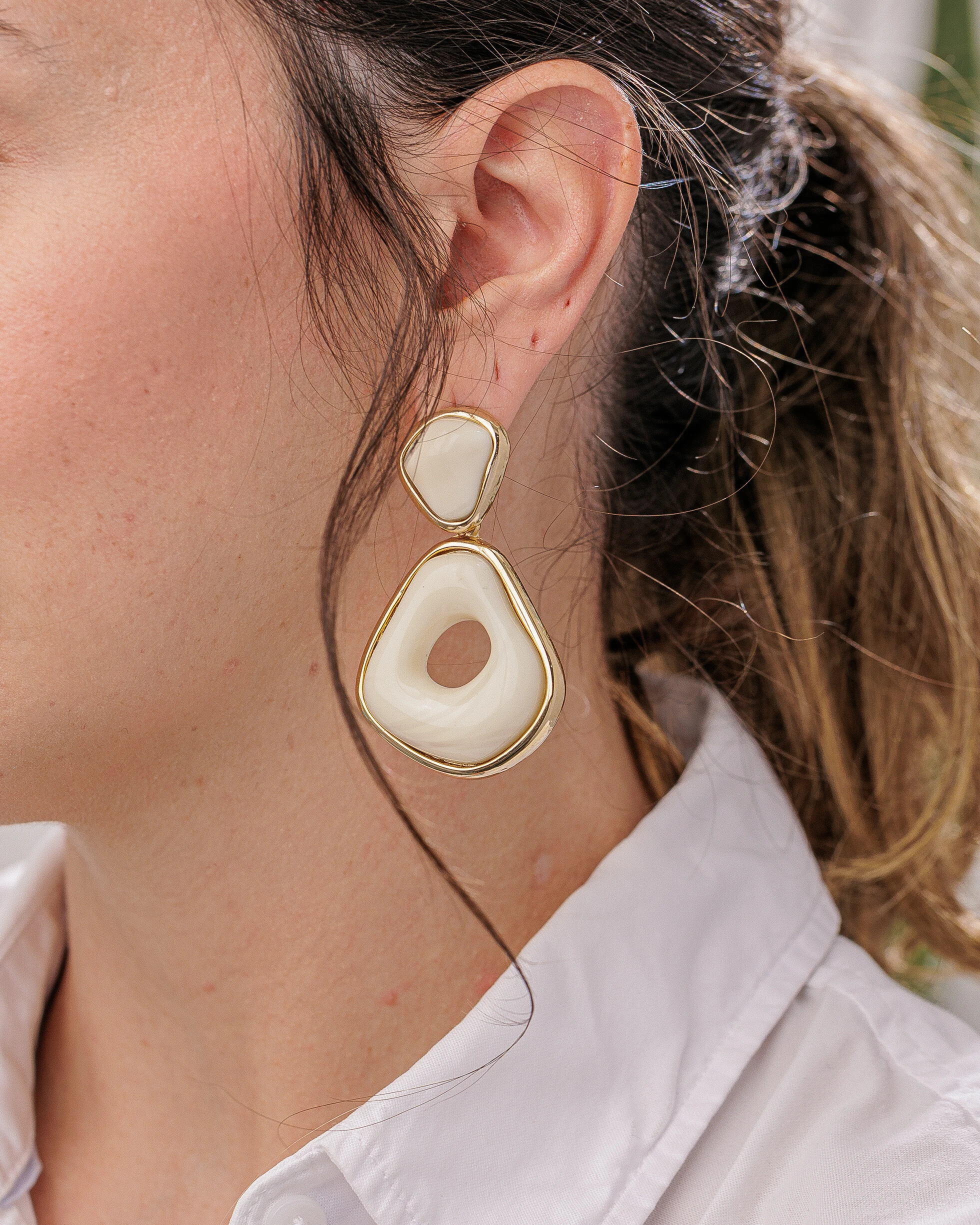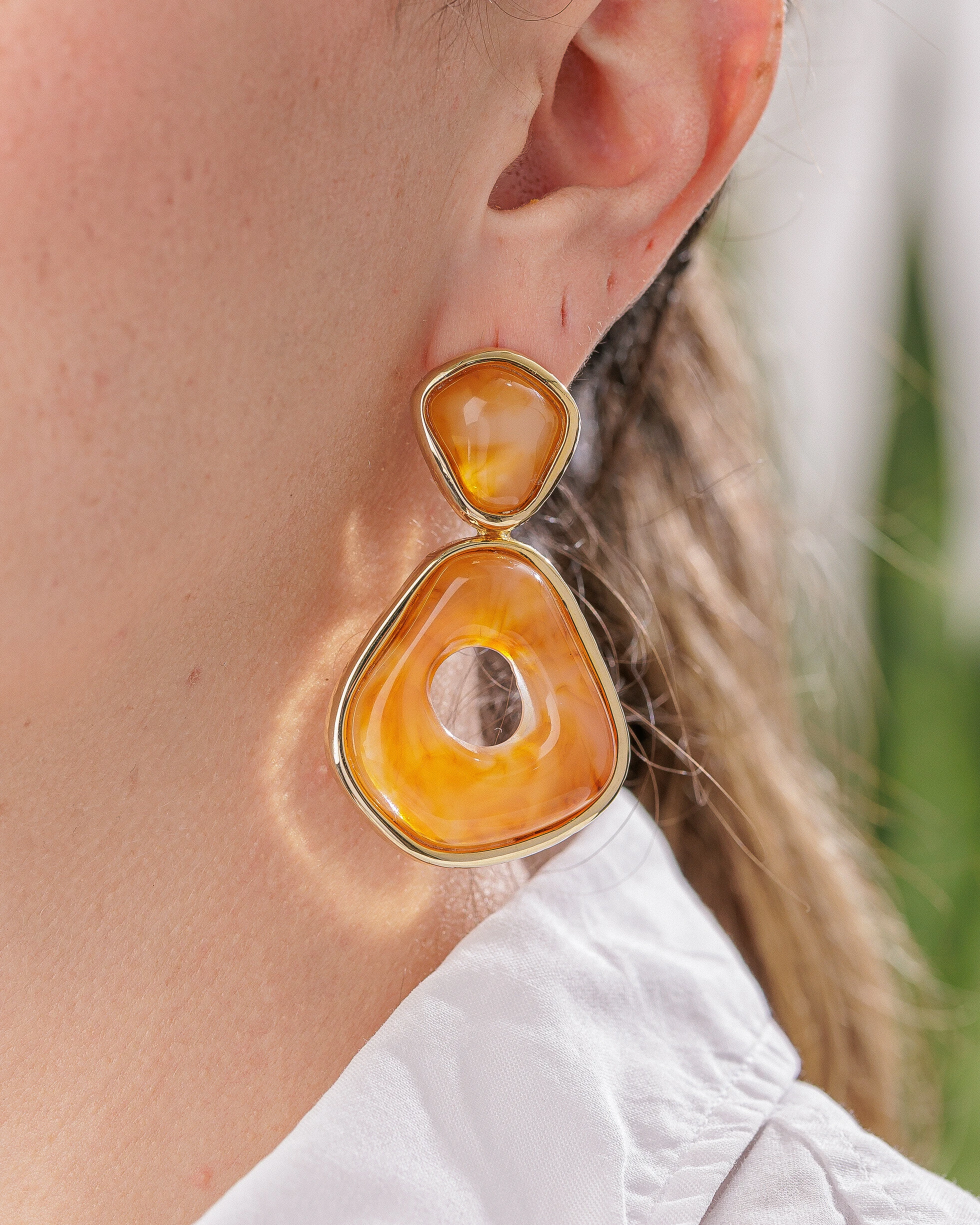 Brinco em banho de Ouro 18k com design orgânico e vazado, e acabamentos em resina. Leveza e modernidade em uma peça de impacto.