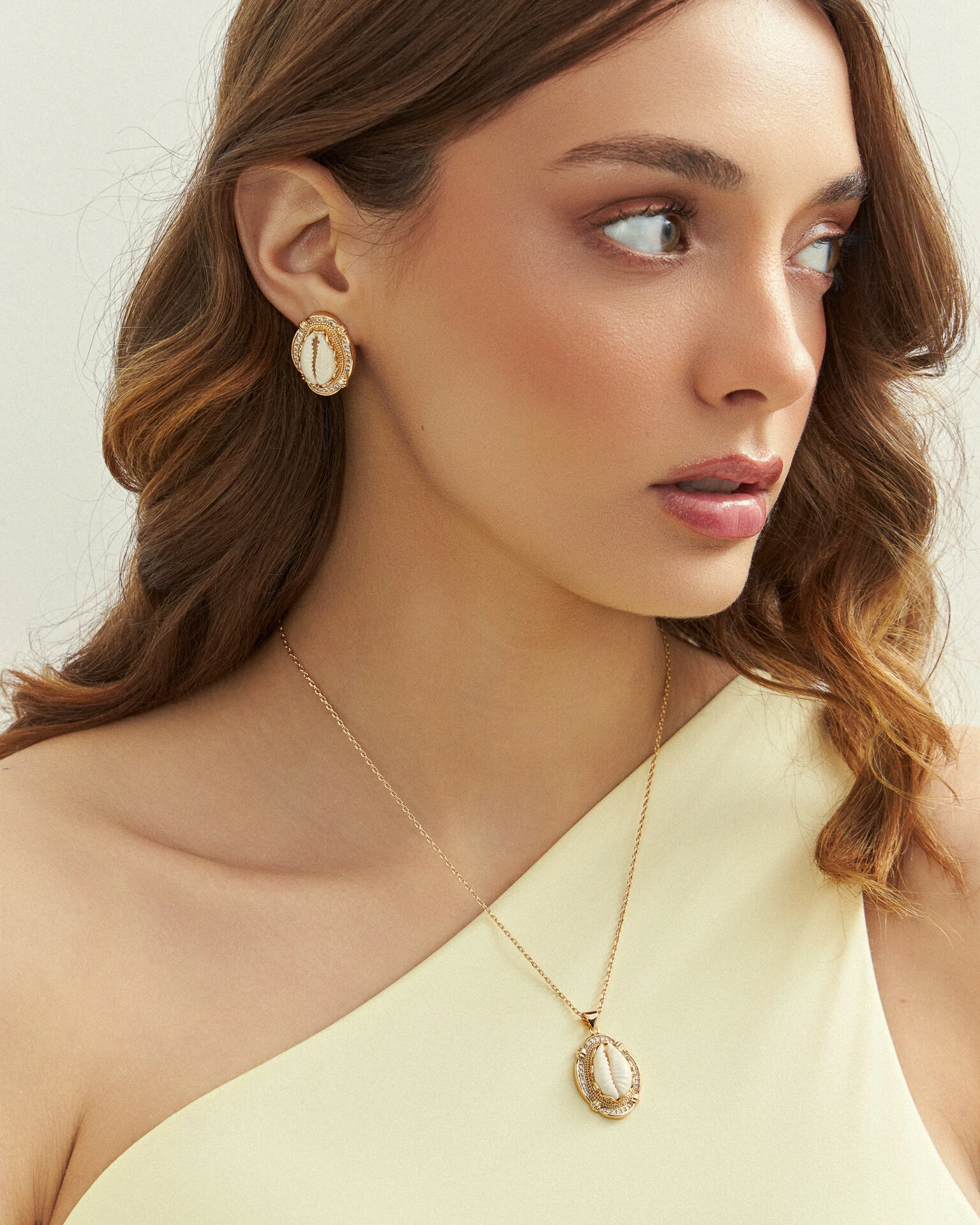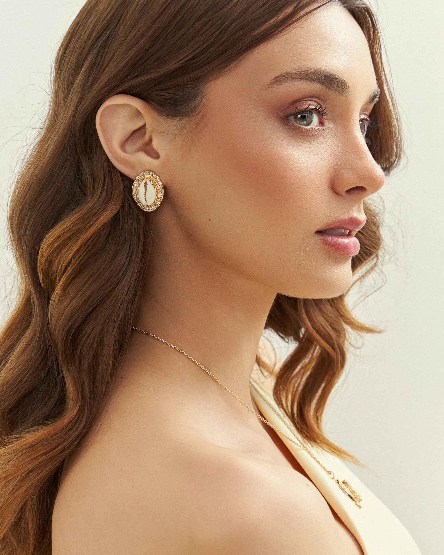 Brinco Búzio em banho ouro 18k, a peça central sendo um búzio (concha de cauri), com formato natural. A moldura é contornada por pequenas zicônias cristias, criando um contorno brilhante ao redor da concha. O design da peça harmoniza a beleza natural e orgânica do búzio com o brilho e a elegância de um acabamento dourado e cravejado das pedras, criando um acessório versátil que pode ser usado tanto em um visual casual de verão quanto em uma ocasião mais formal.