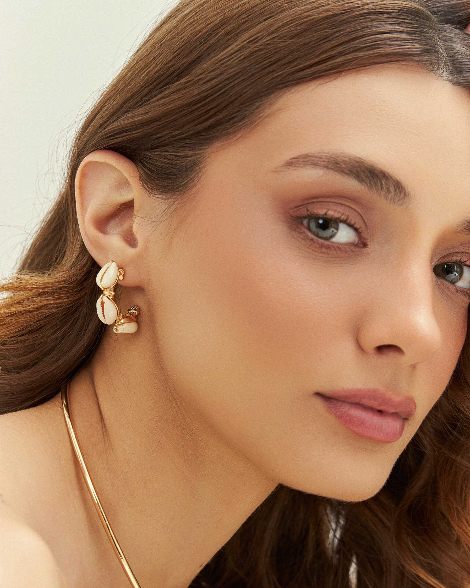 Meia Argola Búzio, a peça é composta por uma estrutura curva, um semicírculo, com banho de ouro 18k. Três búzios (conchas de cauri) brancos, com sua forma natural, são fixados na estrutura. O design combina a beleza orgânica e litorânea das conchas com uma estética contemporânea, resultando em um acessório marcante e cheio de personalidade.