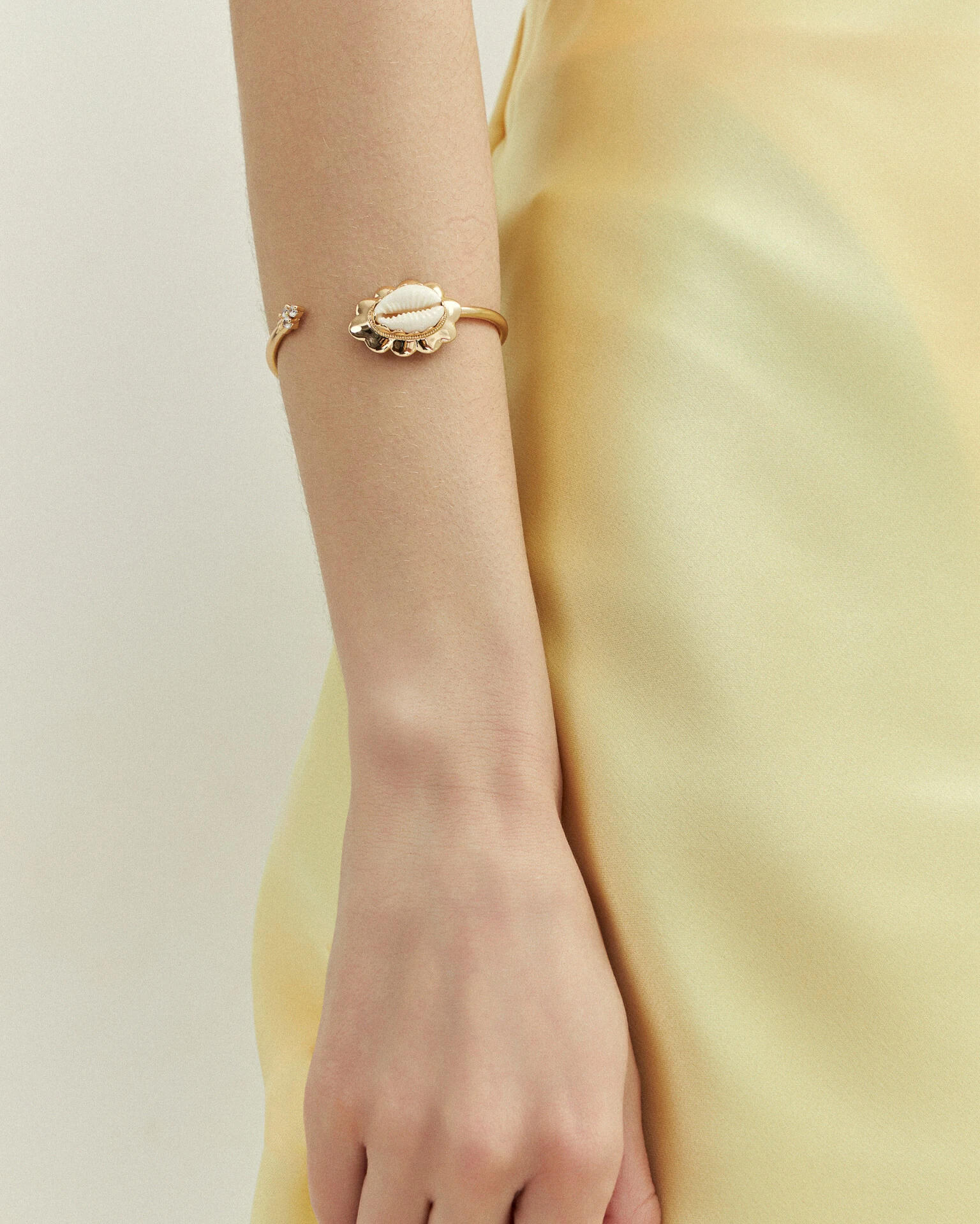 O Bracelete Búzio, em uma ponta, há um búzio (concha de cauri) de cor branca, inserido em uma base maior que tem um formato de flor ou de pétala, com um acabamento liso e polido. Uma peça sofisticada, que contrasta a beleza orgânica do búzio com o brilho e a delicadeza de um detalhe geométrico e das pedras, resultando em um acessório único e equilibrado.