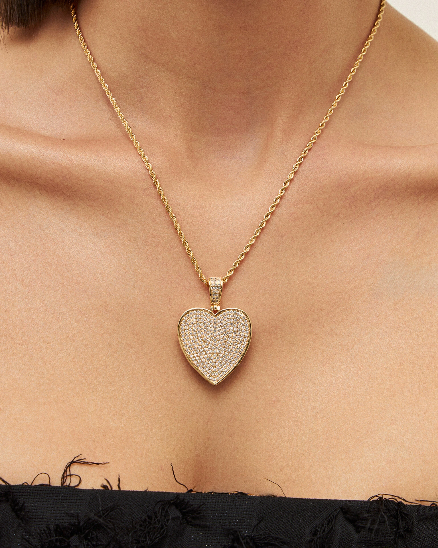 Colar possui uma corrente em estilo torcido (ou corda), com banho de ouro 18k que realça seu brilho sofisticado. O destaque fica por conta do pingente em formato de coração, totalmente cravejado com pequenas cristais zircônia, que criam um efeito cintilante e luxuoso. A base dourada contrasta, conferindo à peça um ar moderno e glamouroso. É um acessório versátil, que pode ser usado tanto em produções mais casuais para dar um toque de charme, quanto em ocasiões especiais para complementar um look mais sofisticado.