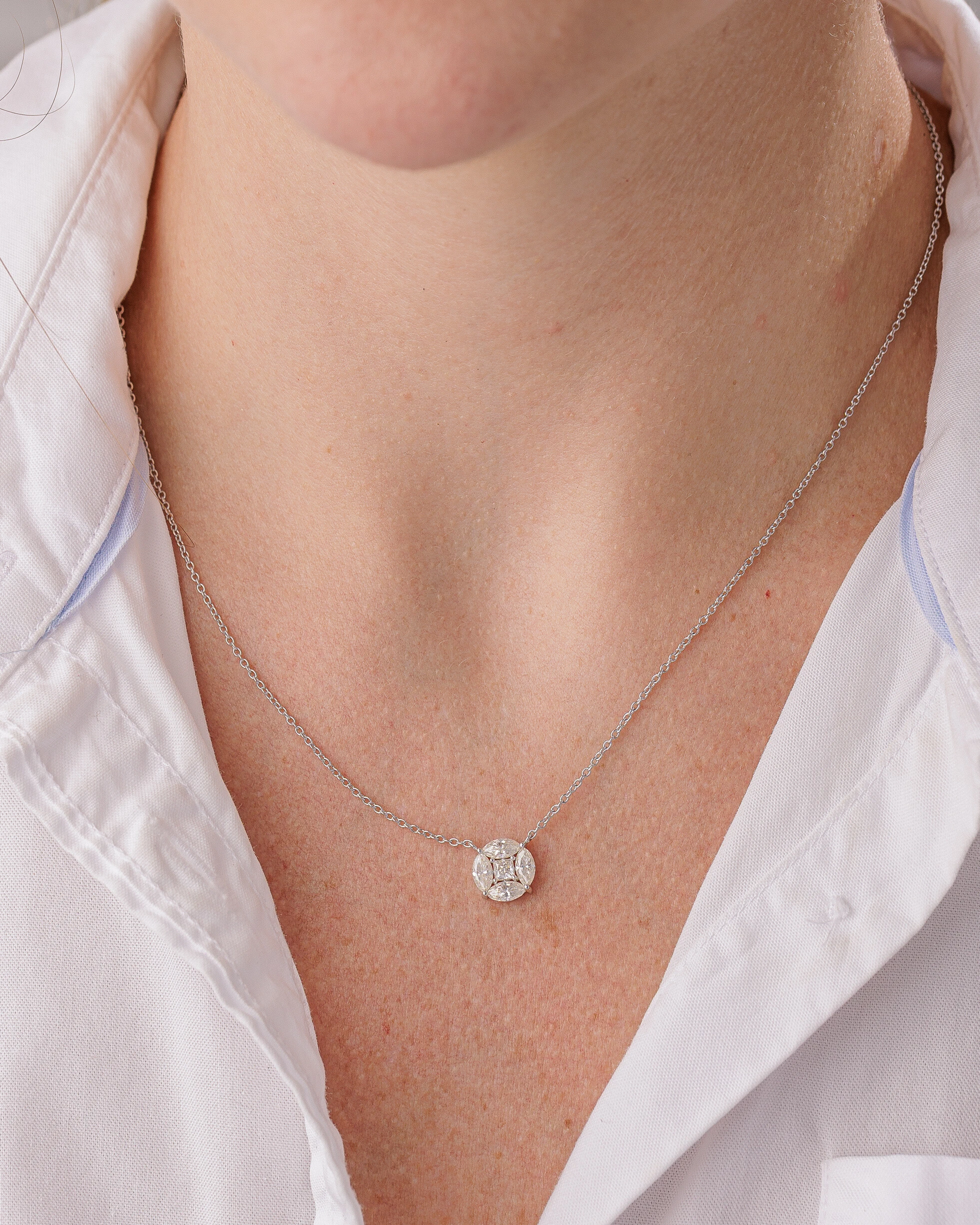 Na obra Noite estrelada, Van Gogh transmitiu em pinceladas seu estado emocional, criando um efeito visual apaixonante e repleto de sentimentos inexplorados. O Colar Noite & Luz, uma joia única e apaixonante, em prata 925 e banho de ródio branco, busca reproduzir emoções através da maravilhosa composição em Moissanites 3,3 mm, que emitem um brilho fascinante.
