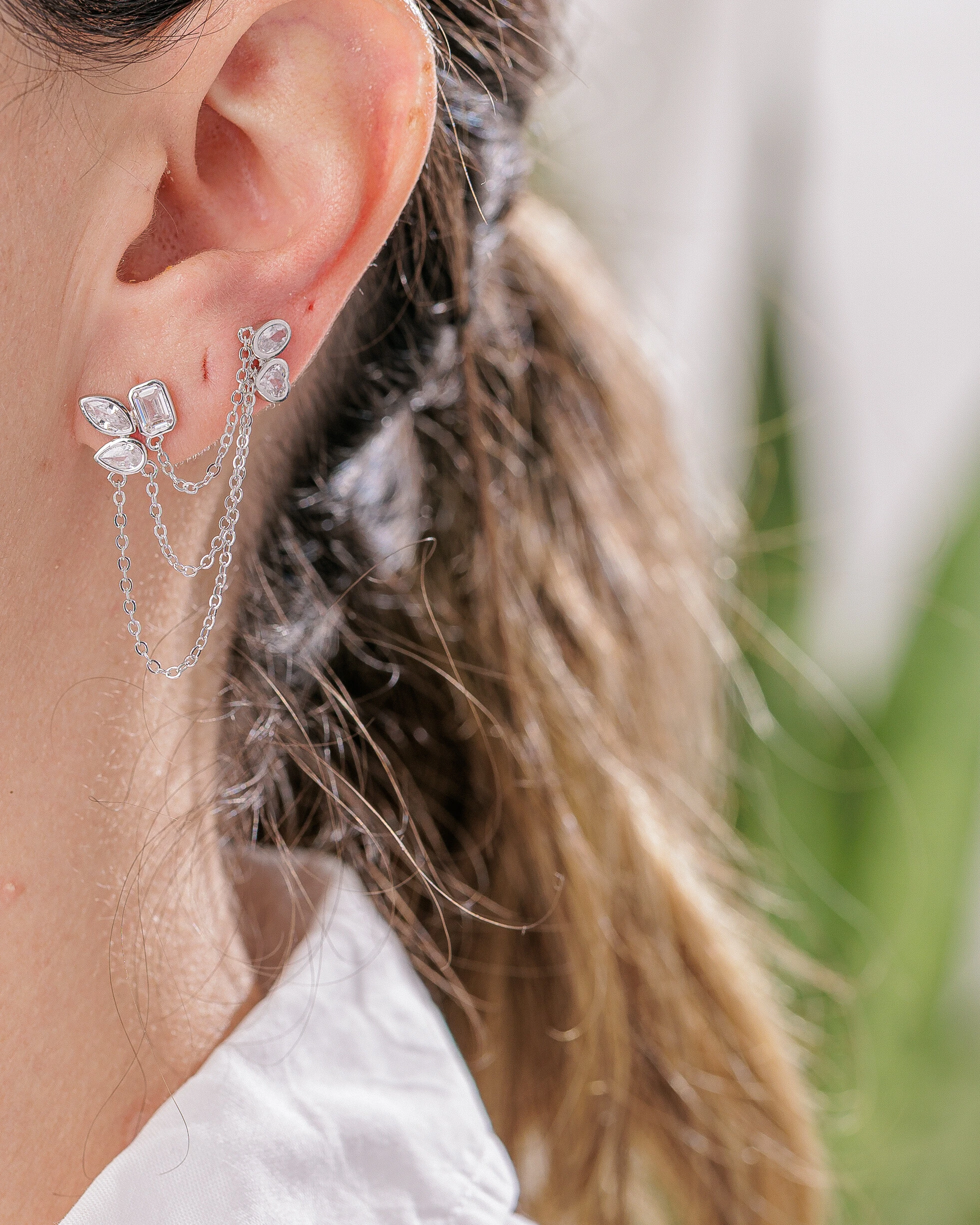 Brinco delicado em banho de Ródio com cravação em Zircônias cristais em diferentes lapidações.