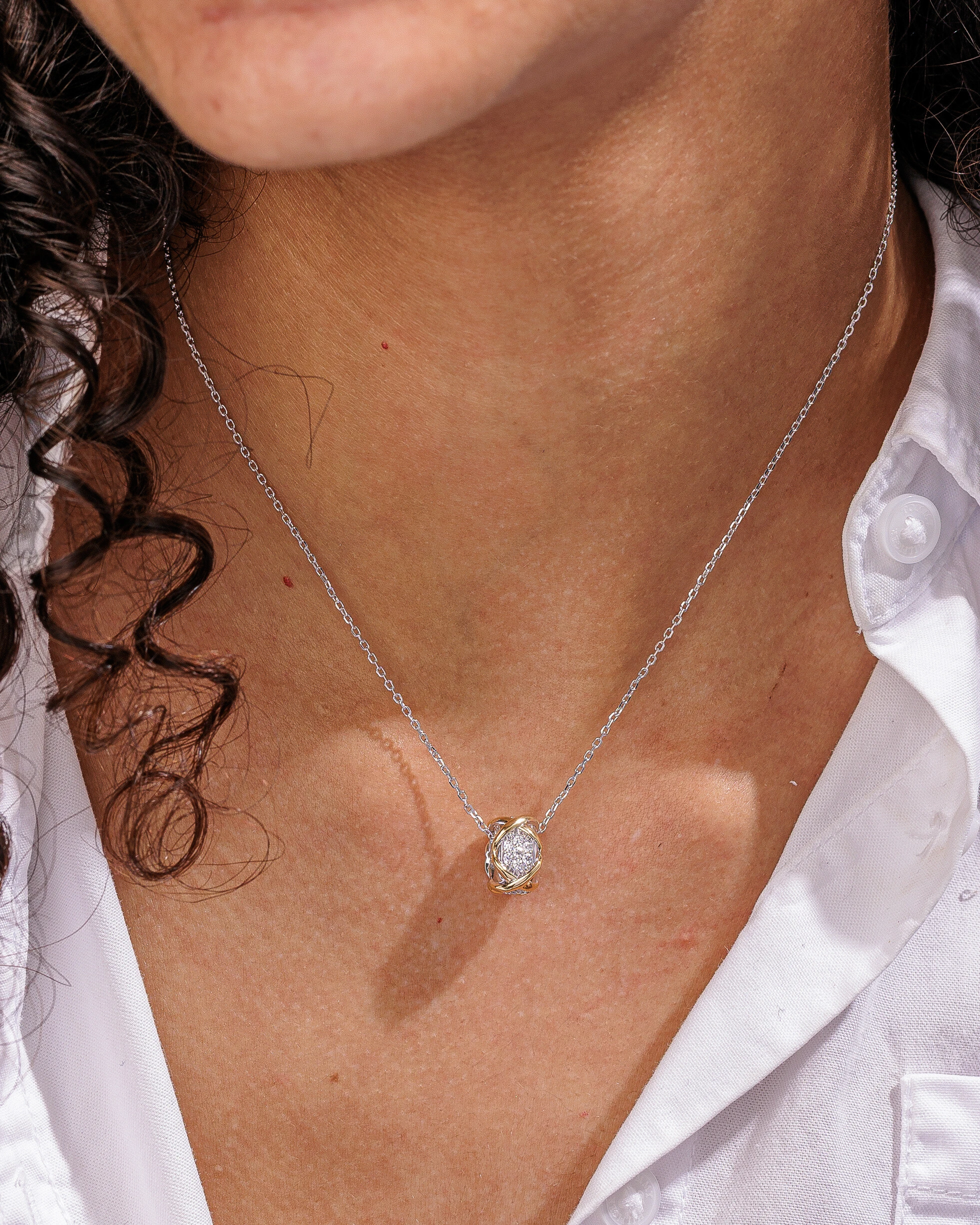 Colar Celeste Esfera se destaca por seu elegante pingente com design que combina a beleza do duo de banhos e a composição de Zircônias Cristais. Com banho de ródio branco e intercalado por um X em banho de ouro 18k.