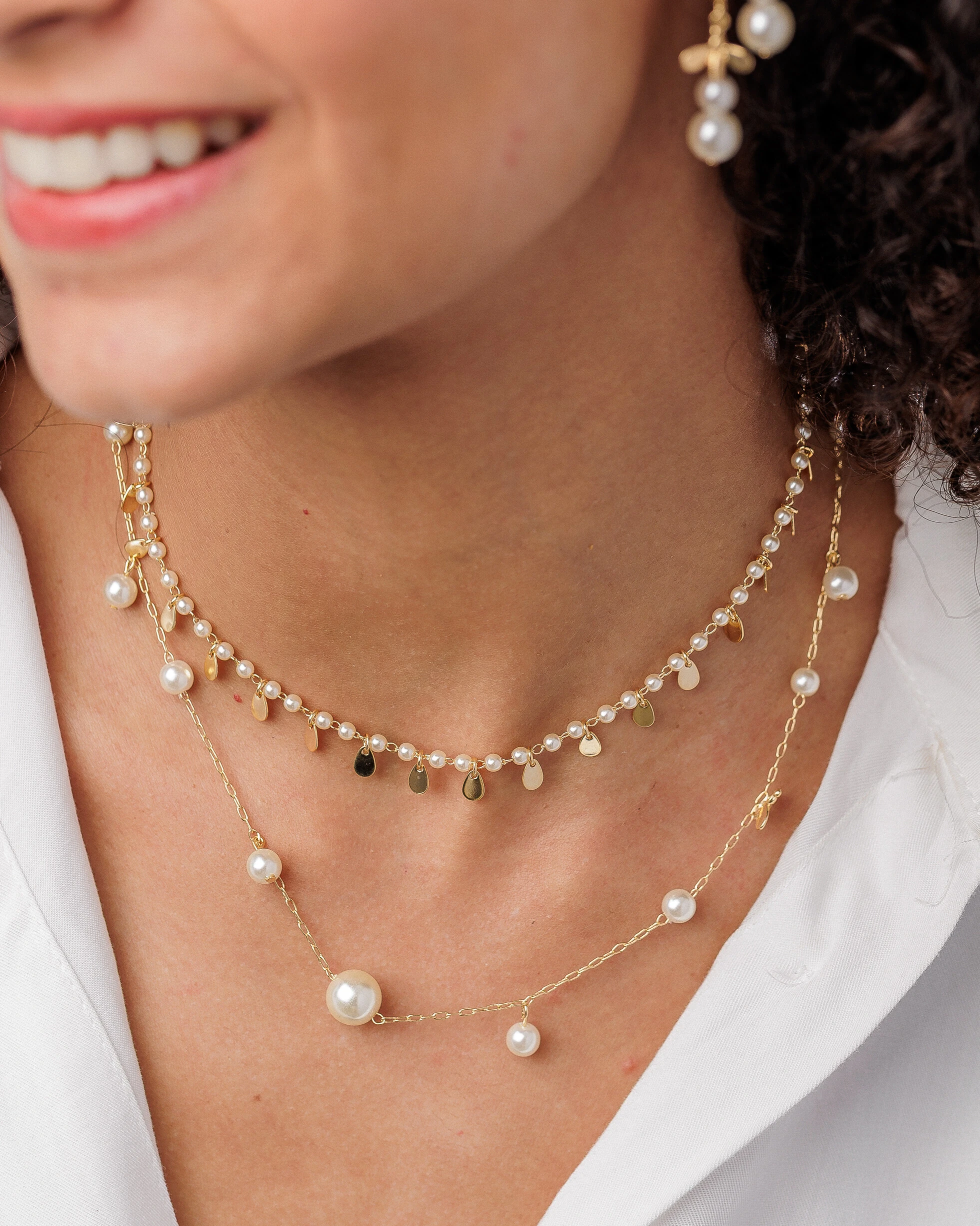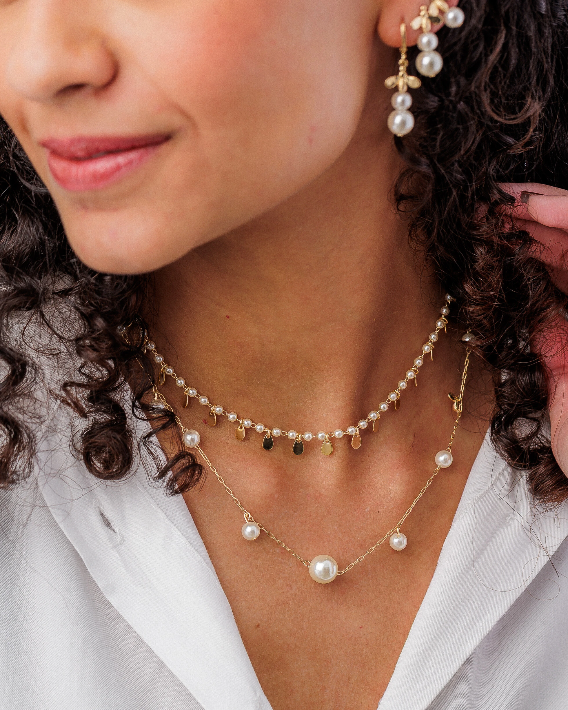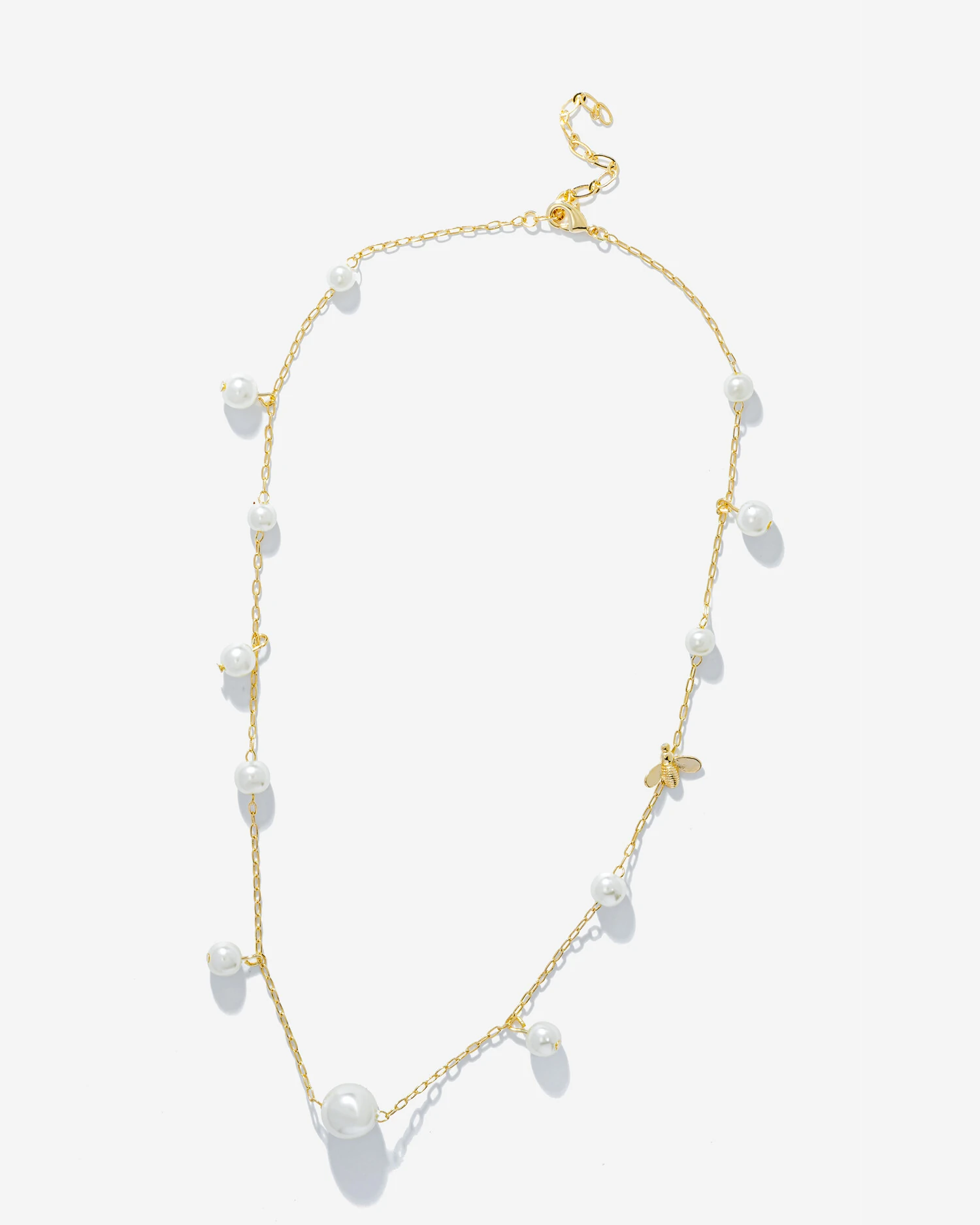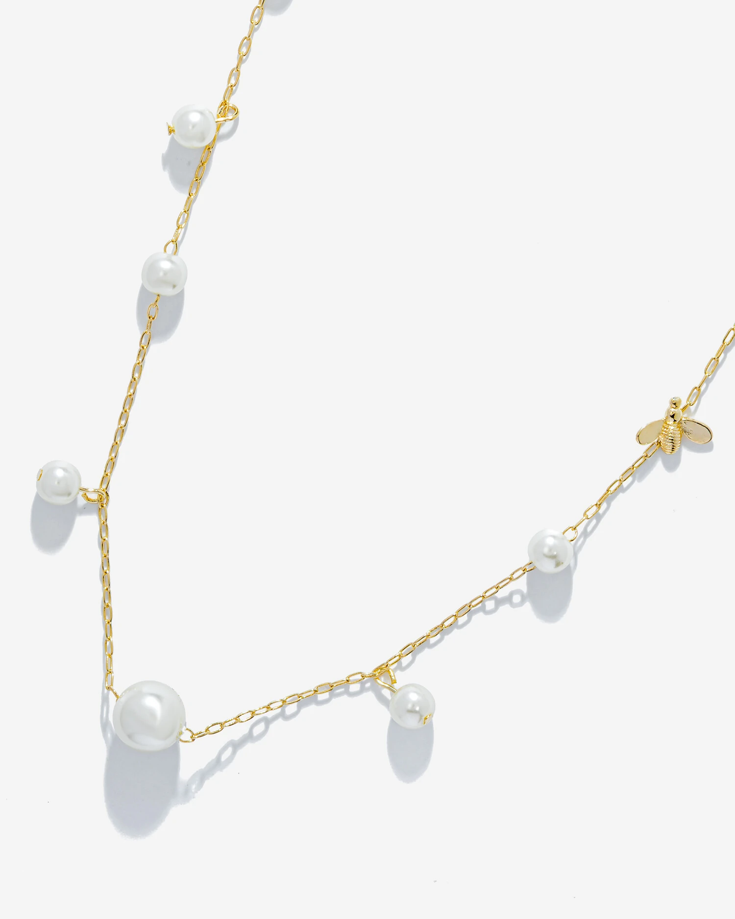 A elegante delicadeza da corrente de elos Cartier, em banho de ouro 18k, apresenta uma adorável combinação de pérolas shell, que se alternam junto aos elos ou presentes na forma de pequenos penduricalhos, repousando no meio desta combinação de brilhos uma graciosa abelhinha confere leveza e feminilidade ao acessório.