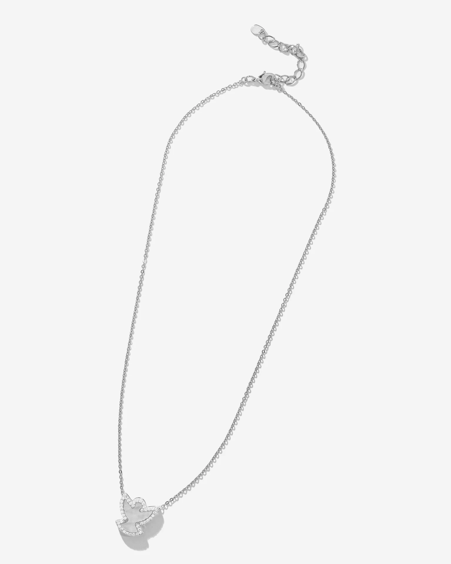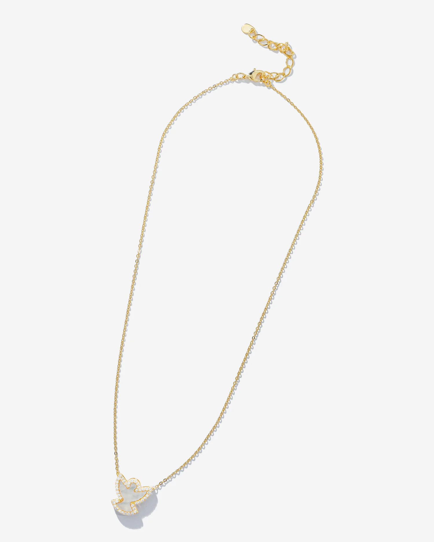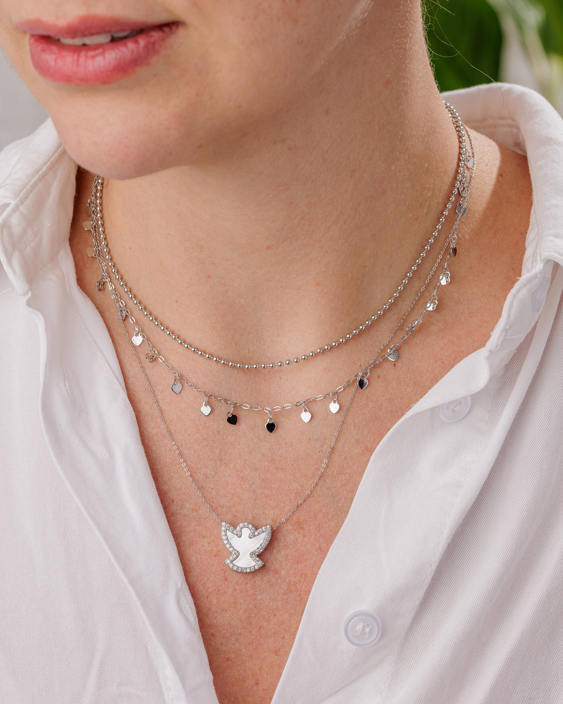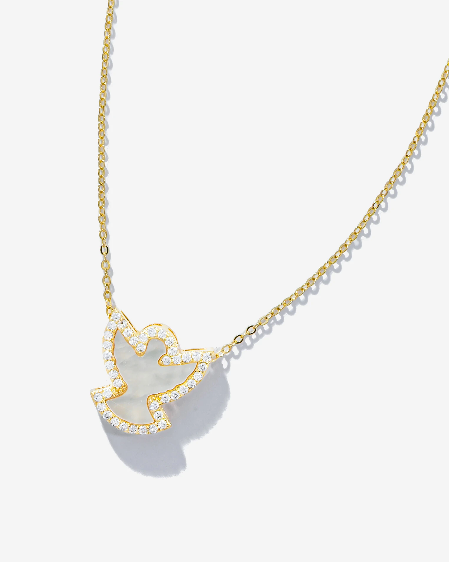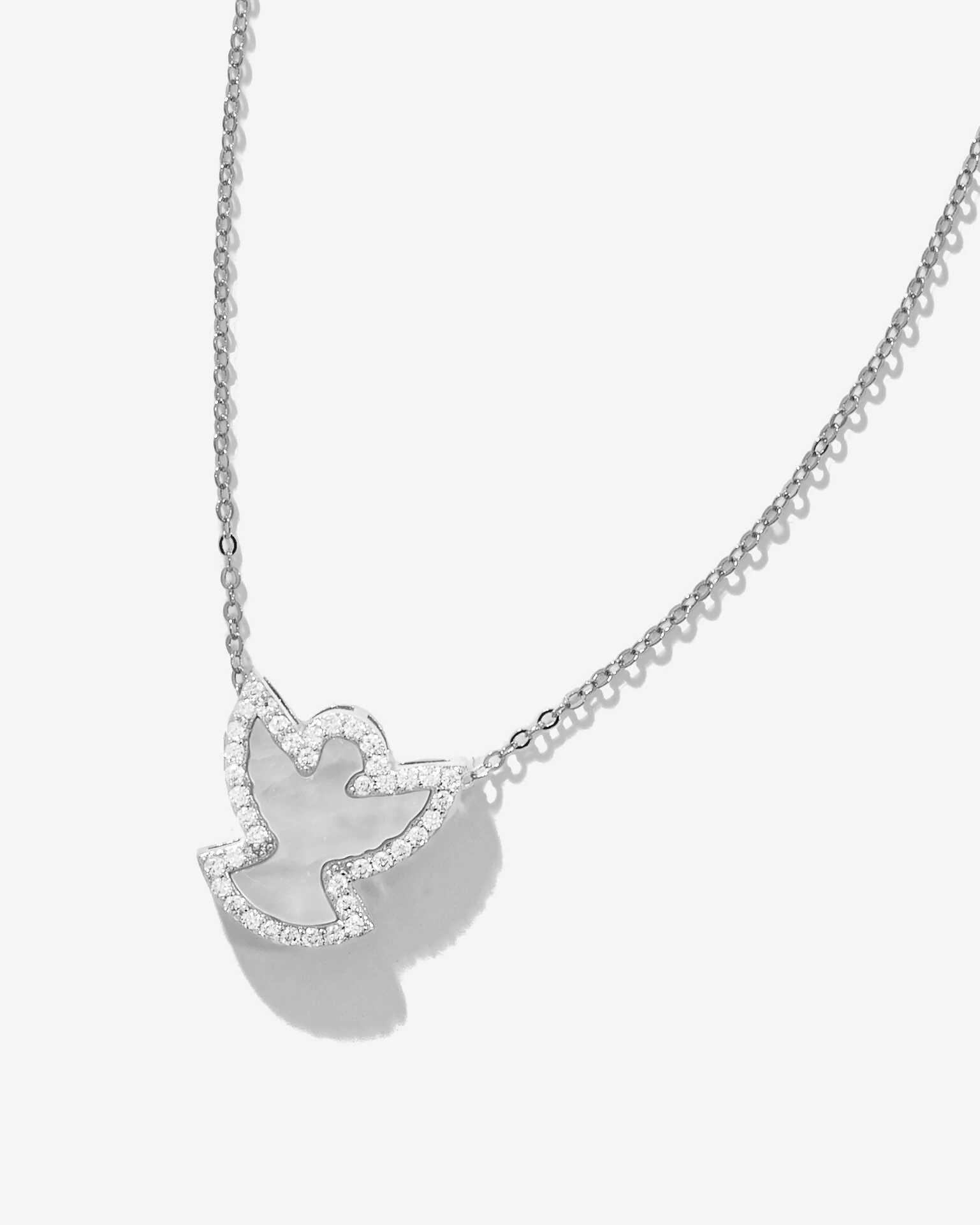 A beleza do design deste delicado colar, surpreende com a elegância e requinte que envolvem a figura do Espírito Santo, envolvida cuidadosamente pelo brilho de zircônias cristais que se esparcem em seu contorno, no centro encontrasse uma linda madrepérola, criando um toque sublime e etéreo.