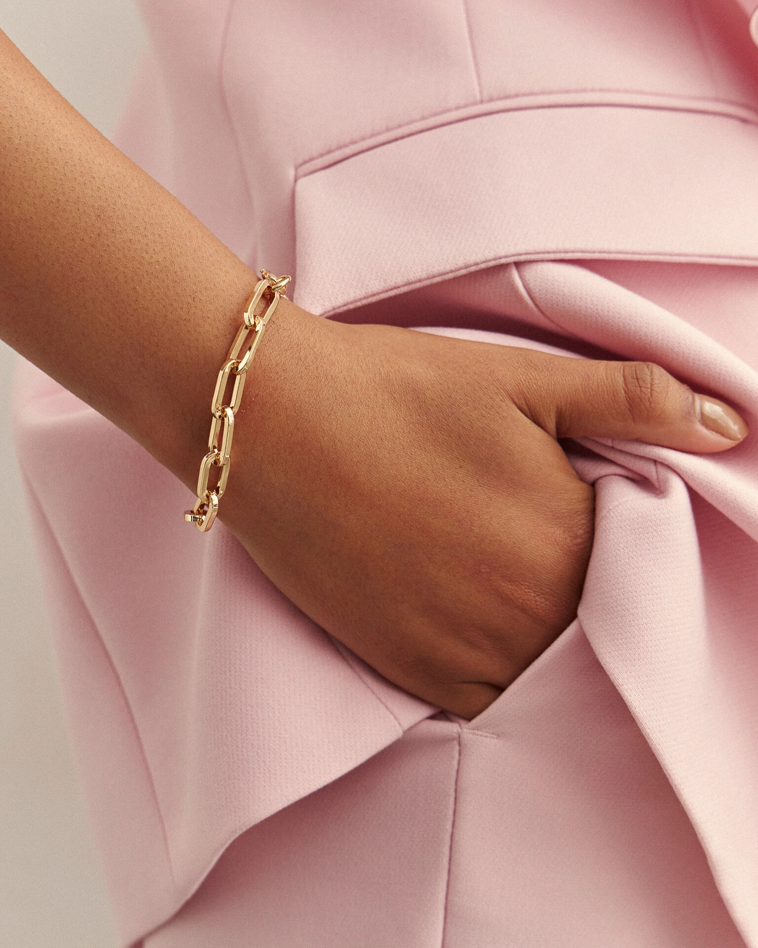 Modelo imprescíndivel por sua versatilidade e beleza, a Pulseira Althea, com sua atemporal corrente de elos alongados, é um acessório que irá imprimir um toque de elegância e fluidez ao seu look. Disponível em banho de ouro 18k.