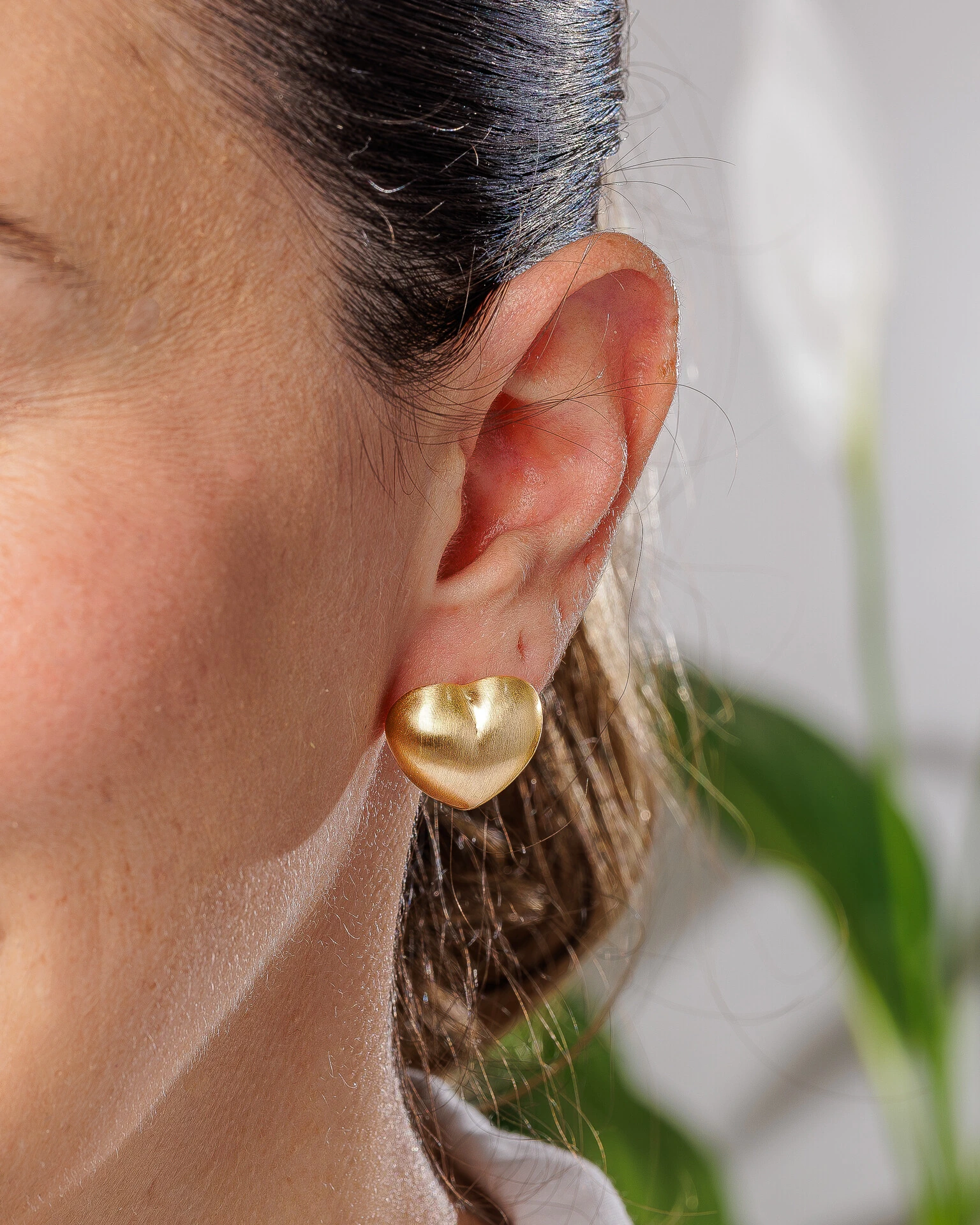 As formas abauladas e tridimensionais do Brinco Coração, criam um envolvente ar de romantismo, enquanto que o banho em ouro 18k com acabamento acetinado, oferece um visual mais moderno e refinado, seu brilho muito mais suave complementa a delicadeza do acessório.