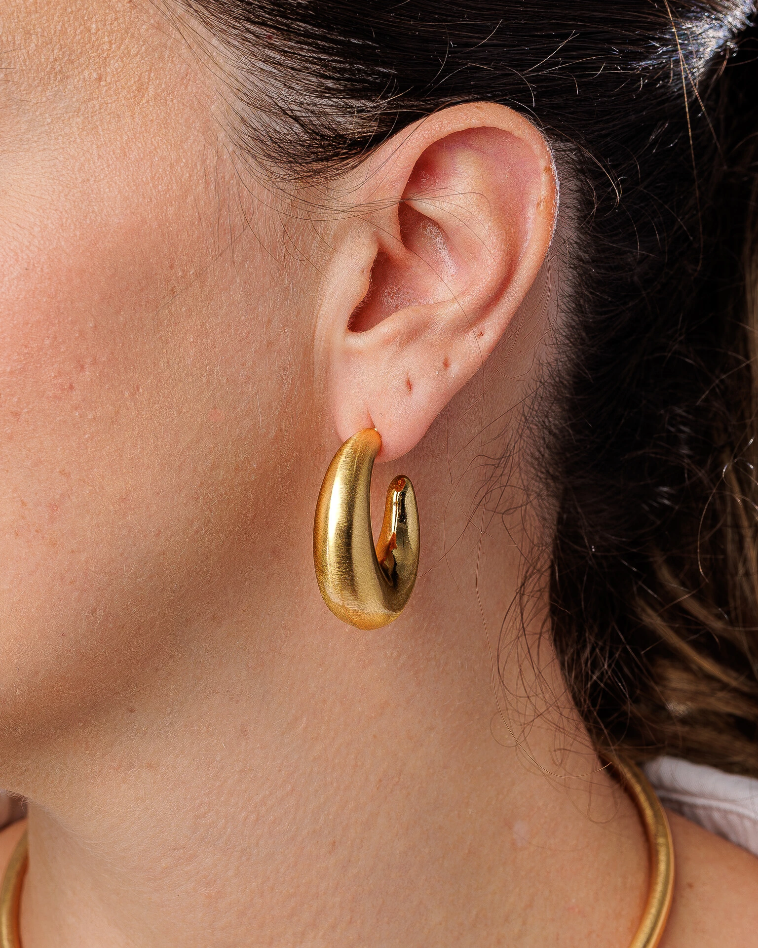 O Brinco Argola Orbe traz um design moderno e marcante, seu banho em ouro 18k e textura acetinada, deixa a peça ainda mais elegante, perfeita para quem busca estilo com personalidade