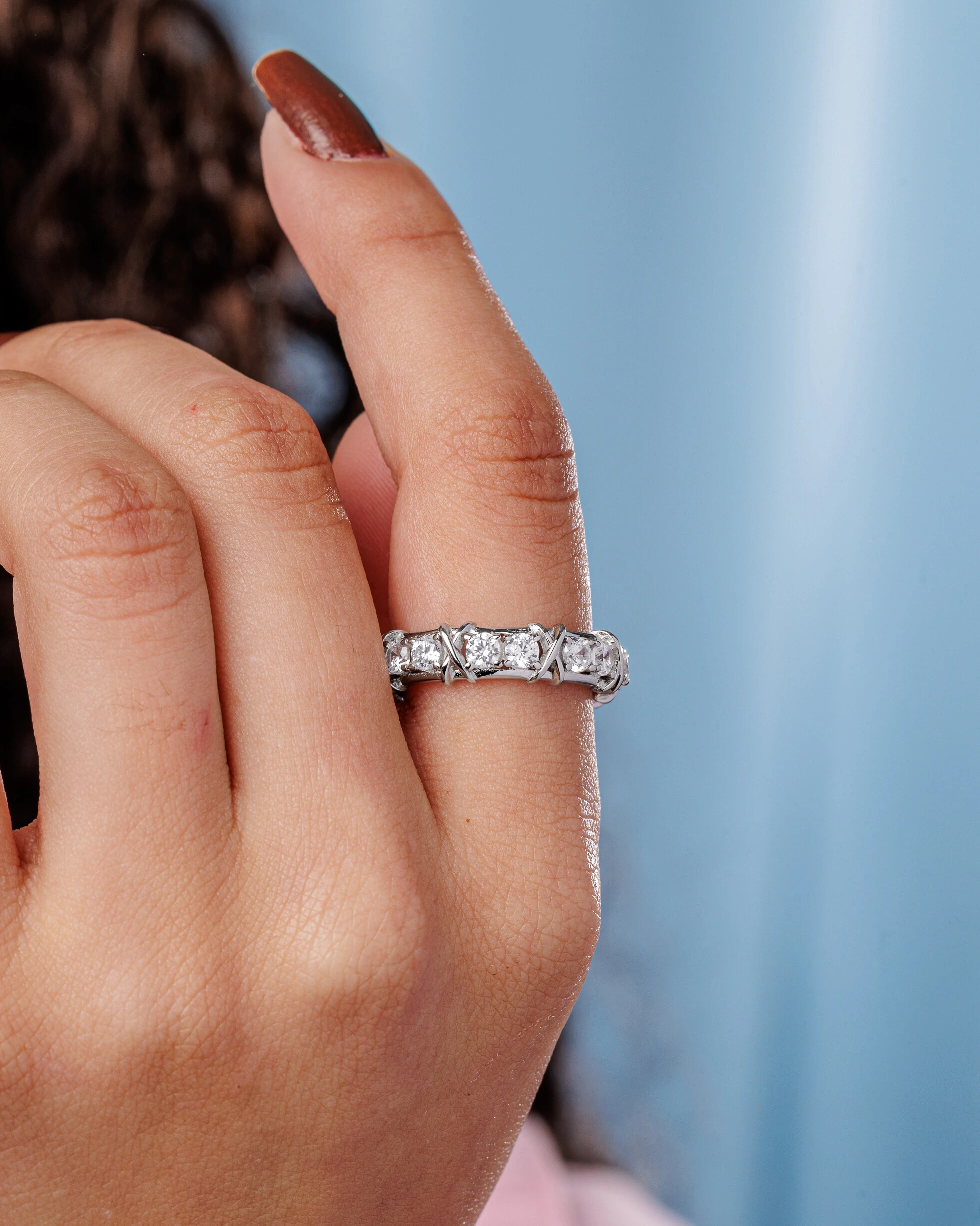 Anel Celeste se destaca por seu elegante design que combina a beleza do banho em ródio e a composição de Zircônias Cristais. Seu aro possui banho de ródio branco e a dupla composição de zircônias é intercalada por um X.