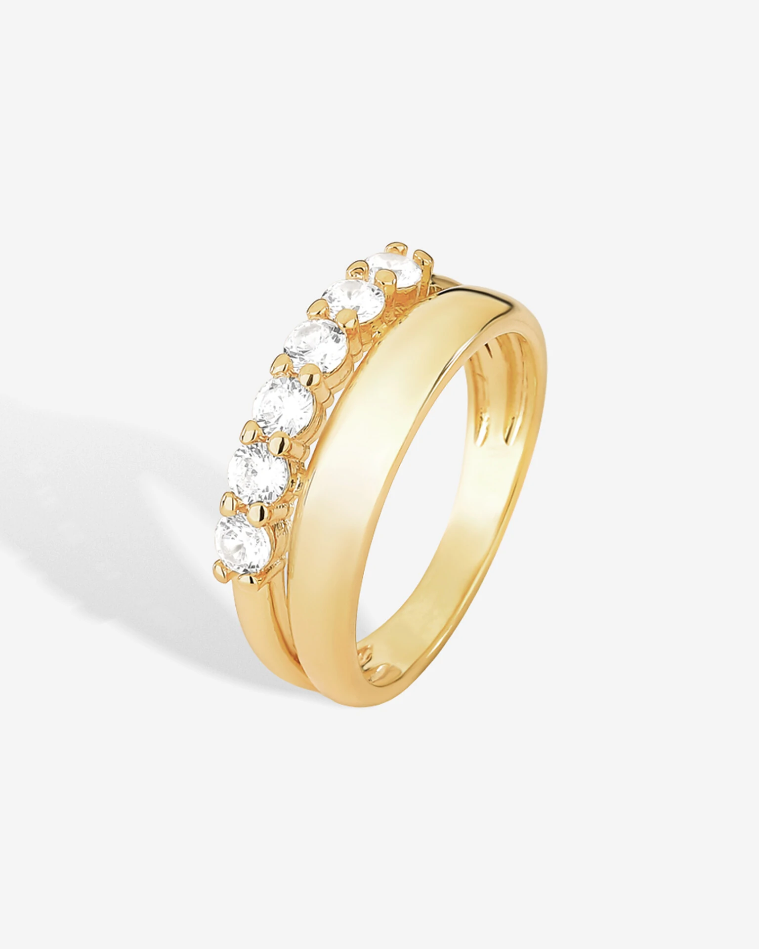 O Anel Cinderela, com design de dois aros sendo um liso e outro cravejado, refletindo a luz de forma intensa e harmoniosa, criando um brilho único a cada movimento. Banho em ouro 18k e cravação delicada garantem um acabamento sofisticado e atemporal.