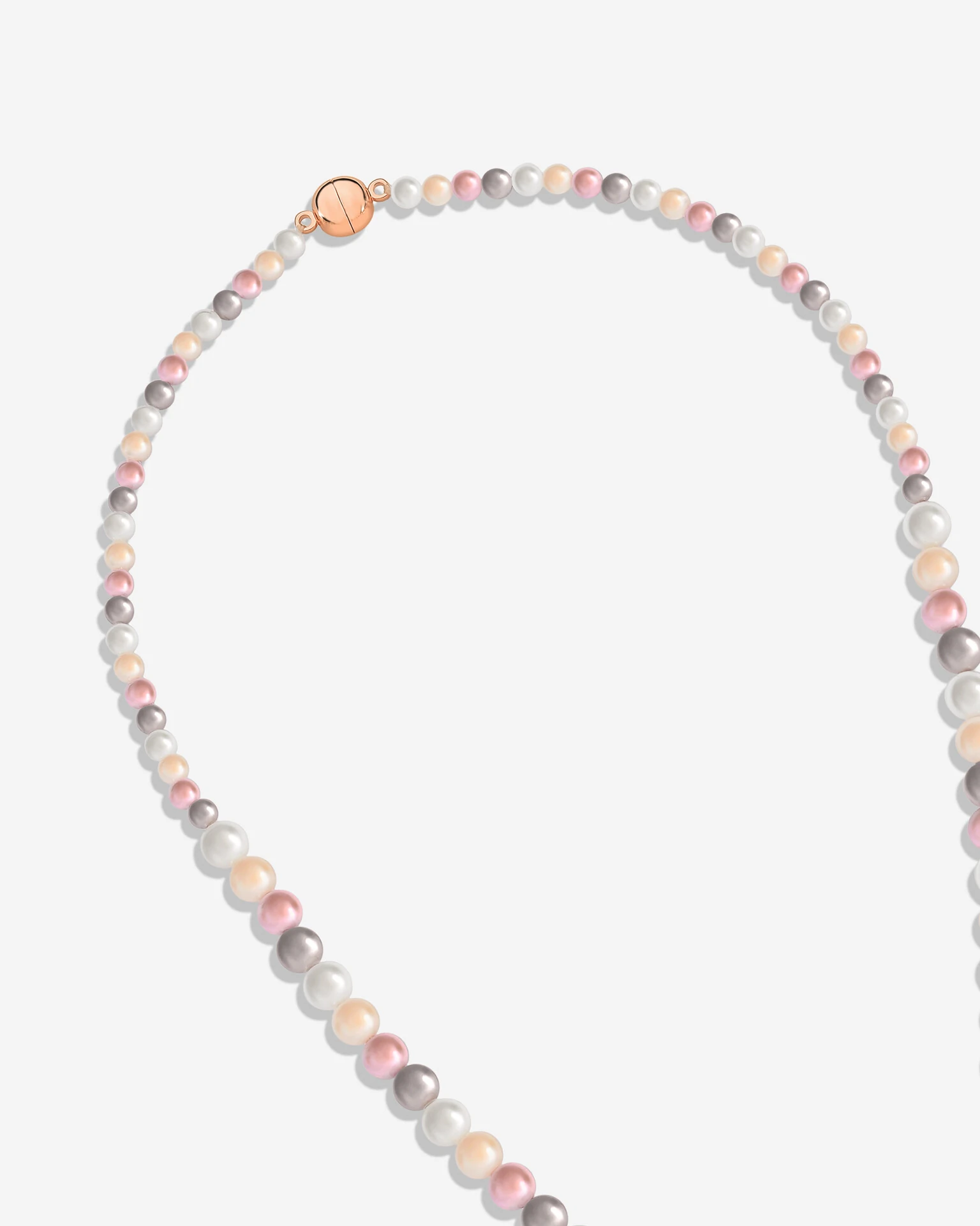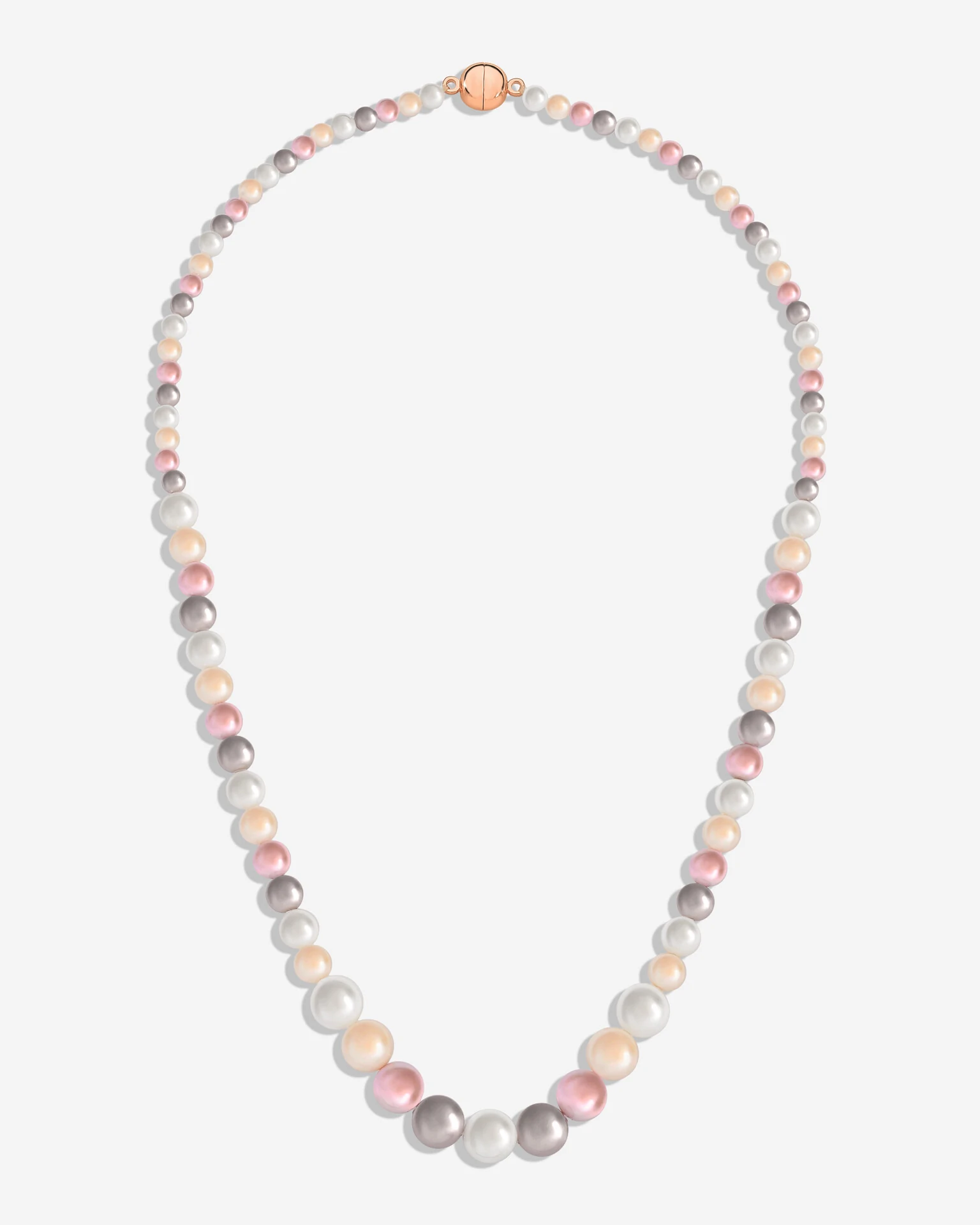 Esse colar é uma peça delicada e sofisticada, composta por pérolas em tons suaves de branco e rosê. As nuances se alternam de forma harmoniosa, criando um degradê elegante e romântico. O fecho em metal dourado adiciona um toque moderno e refinado, equilibrando a leveza das cores com um ar de luxo discreto.