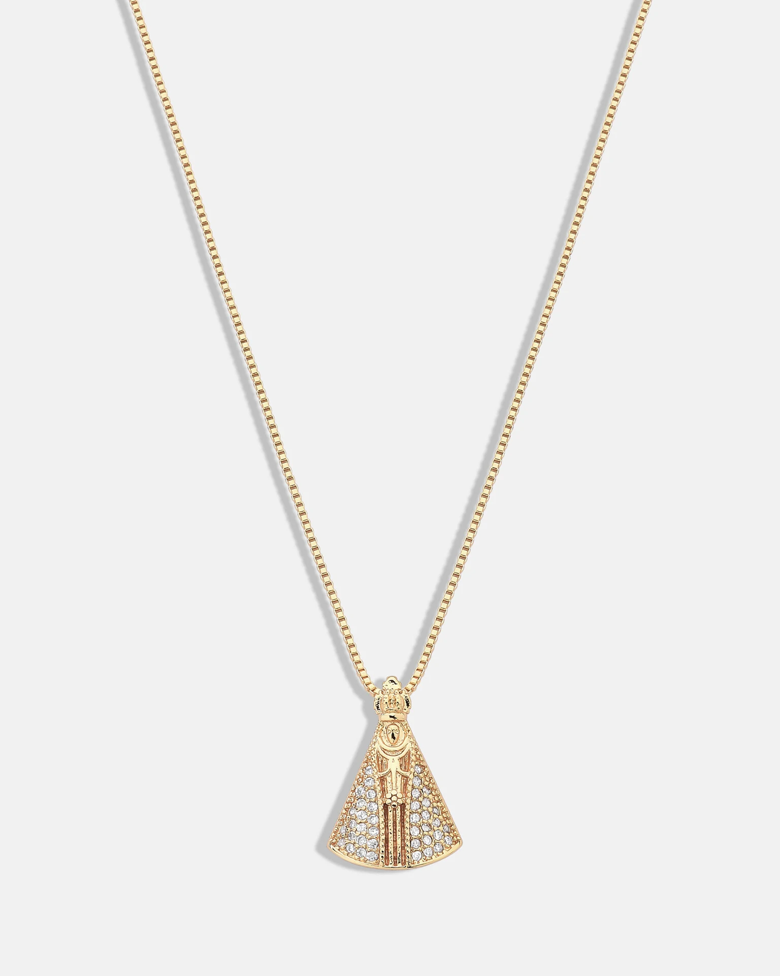 Colar com corrente fina e pingente de Nossa Senha Aparecida cravejado com microzircônias cristal.