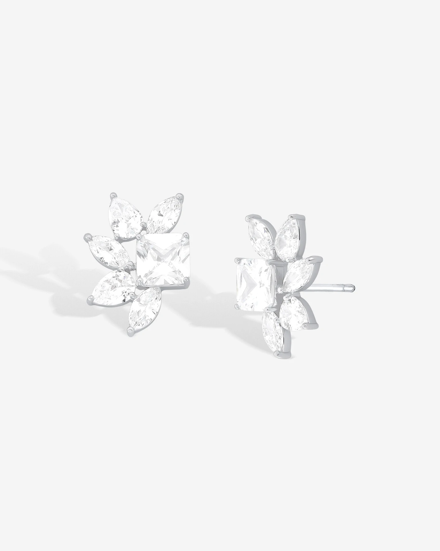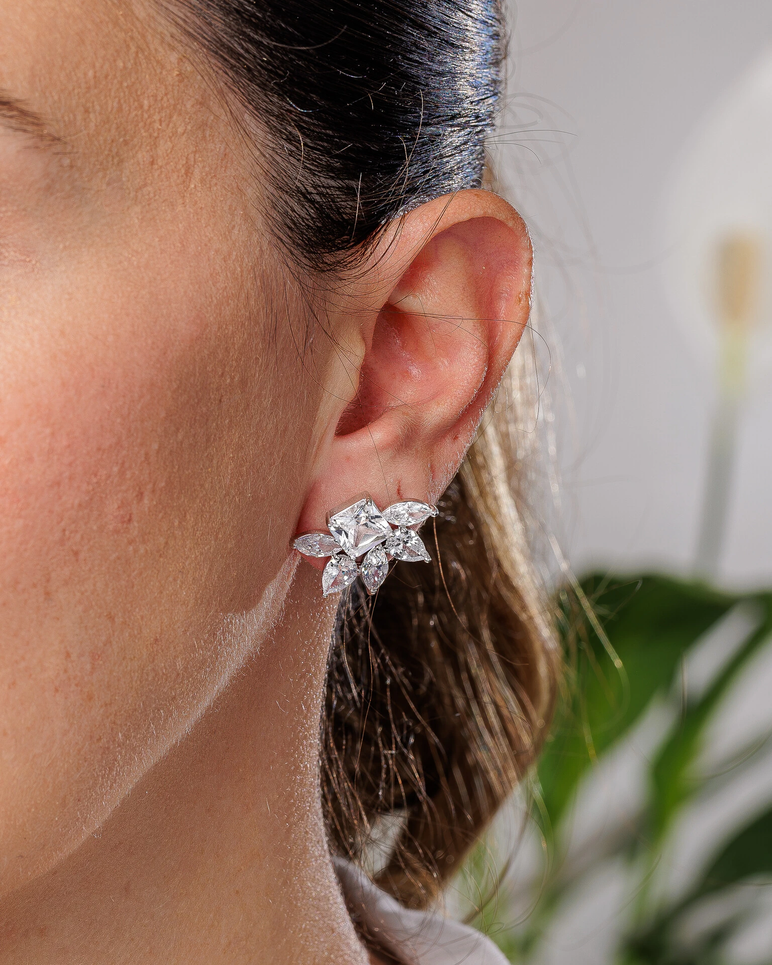 O Brinco Cristalina com design delicado e sofisticado, ele combina zircônias em lapidação navete e quadrada, formando um arranjo que reflete a luz de maneira encantadora. O banho em ródio realça ainda mais o brilho das pedras.