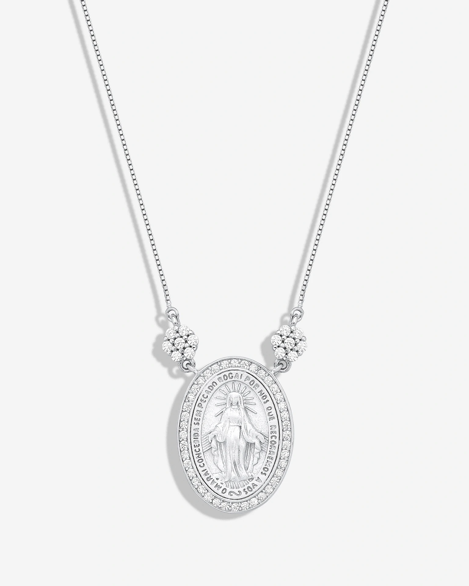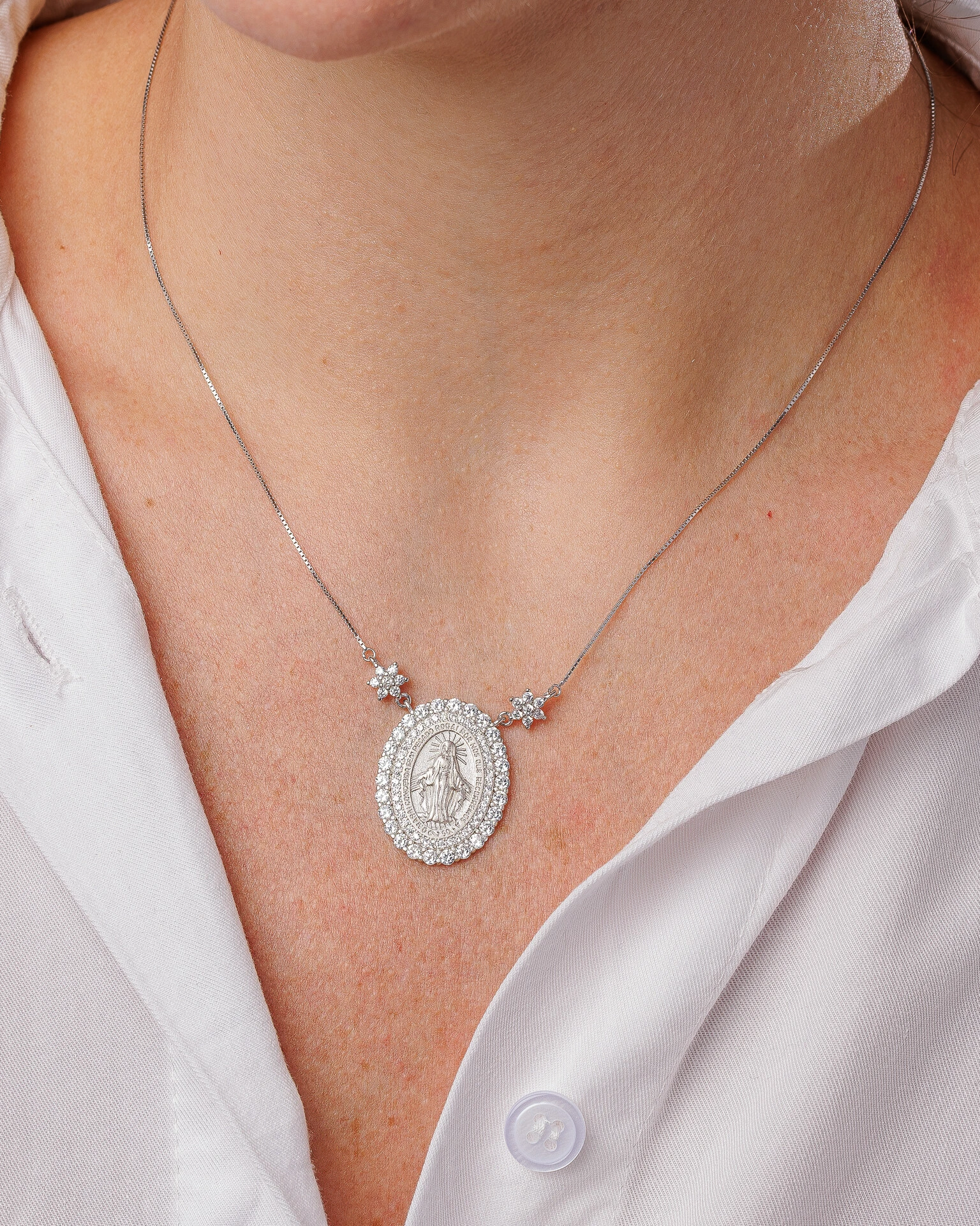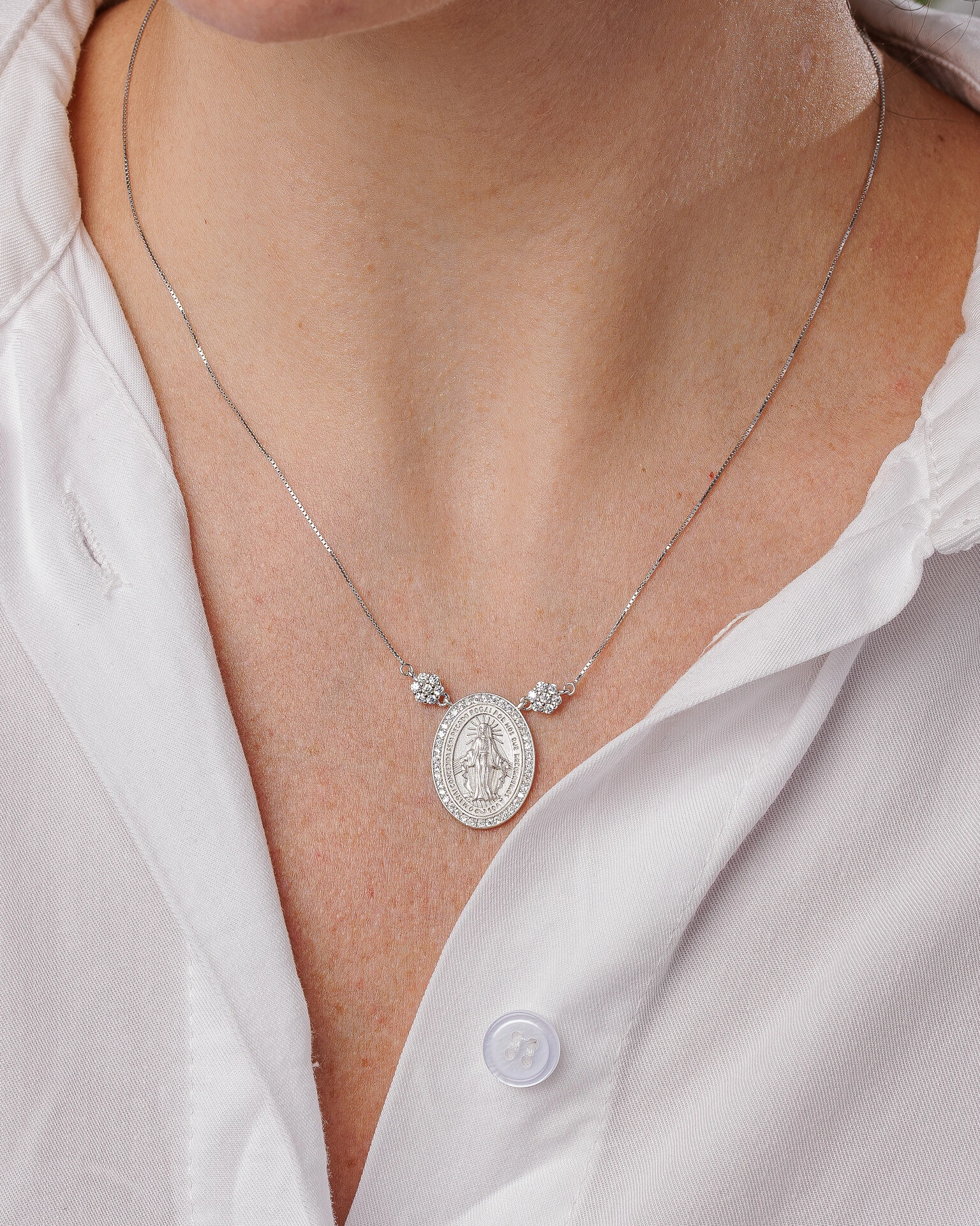 Colar modelo religioso, em prata 925 corrente com duas mini flores em Zircônias Cristais, Medalhão com a imagem da Santa em alto relevo, contornos com oração e em micro Zircônias Cristais.