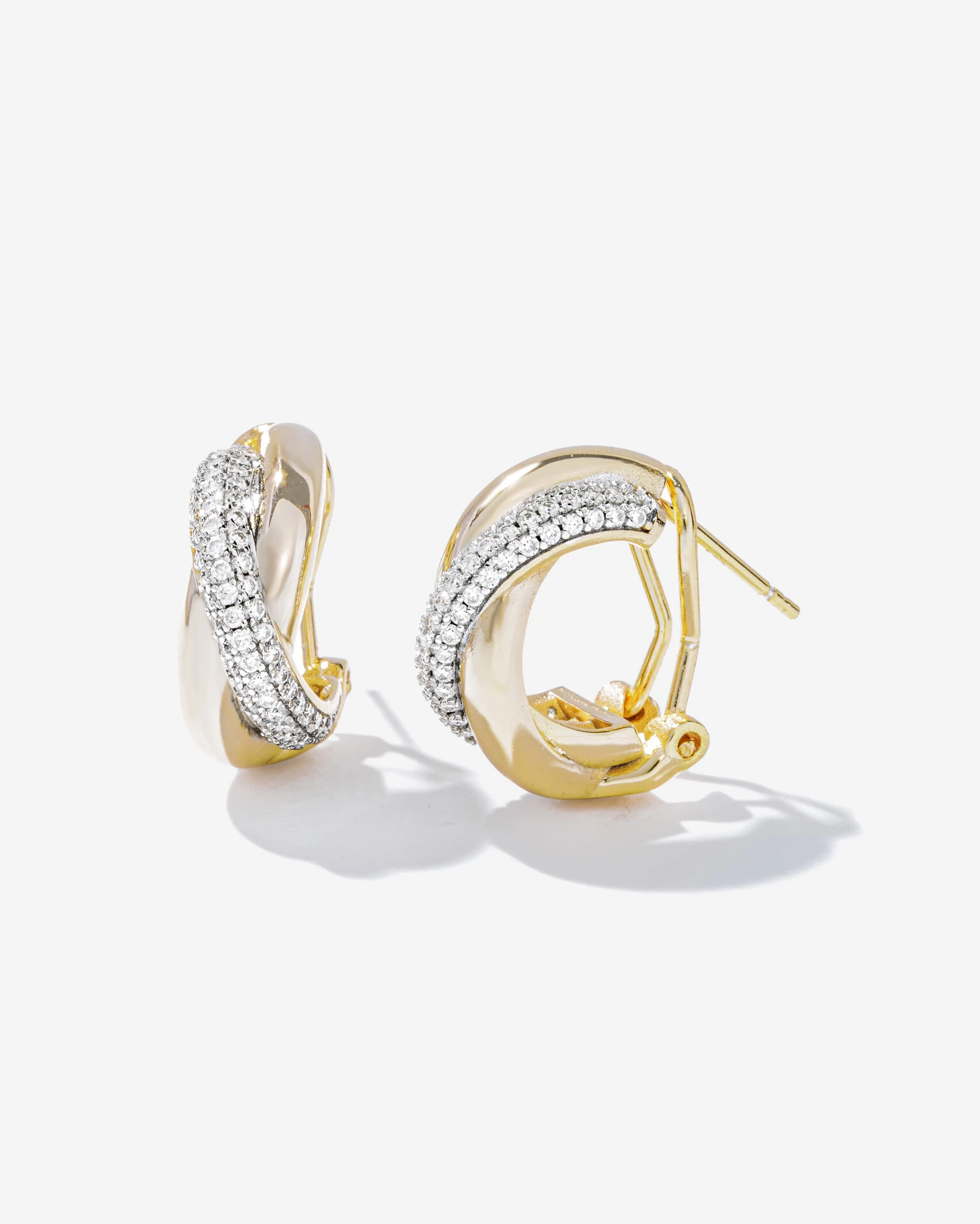 Em uma composição sofisticada, a clássica argola abaulada é entrelaçada por um aro recoberto pelo maravilhoso Pavê em Moissanites, caneteadas em banho de ródio branco. O contraste vibrante entre o duo de banhos e os intensos reflexos de Moissanites, valoriza esta maravilhosa joia confeccionada em prata 925 e banho de ouro 18k. Modelo brinco de Pressão.