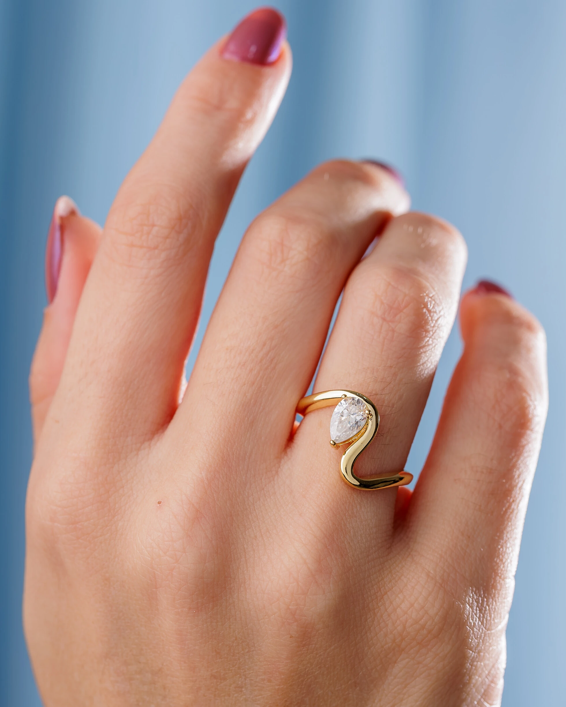 O aro sinuoso do Anel Orgânico envolve suavemente a maravilhosa Moissanite 5,8 mm na lapidação Gota, produzindo um espetáculo sedutor de nuances irradiadas por seus intensos e elegantes reflexos. Joia em prata 925, disponível em banho de ouro 18k e ródio branco.