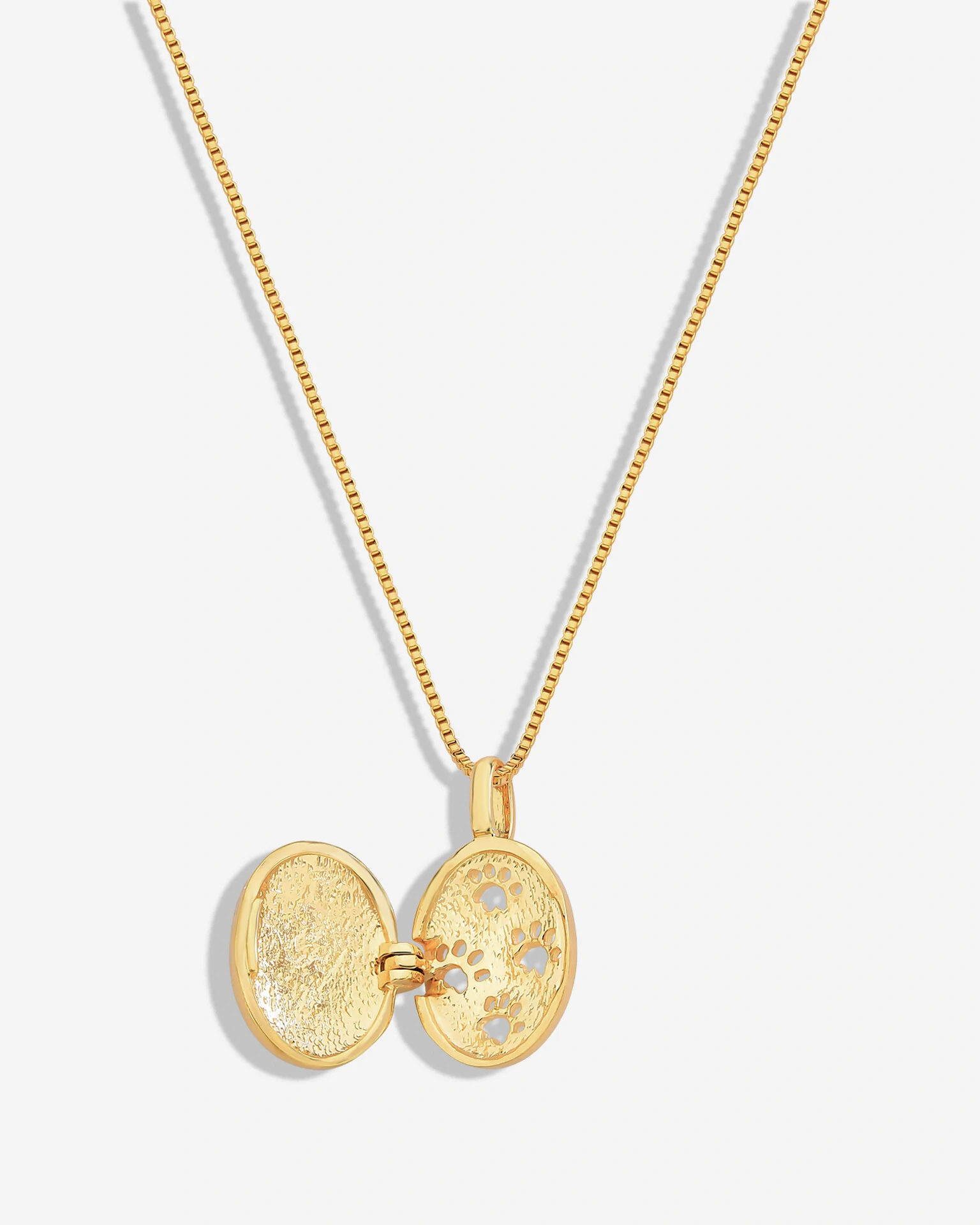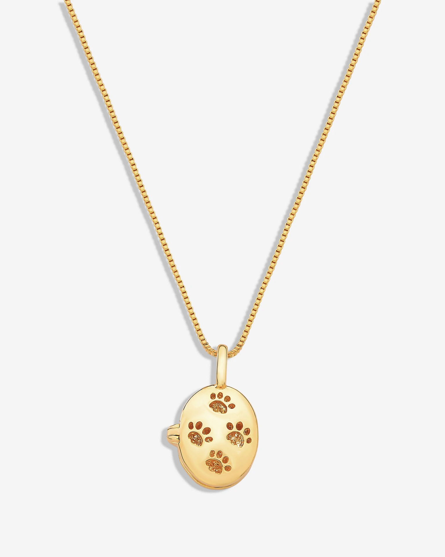 Colar relicário banhado a ouro18k gravado com pequenas patas, celebrando o amor incondicional que te acompanha em todos os passos. Perfeito para carregar seu melhor amigo sempre por perto.