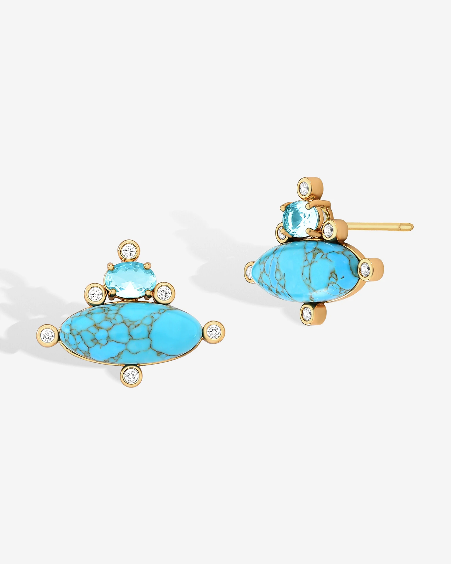 A impactante beleza do Brinco Soline, se deve as maravilhosas nuances de azul que recobrem suas formas, seja na delicada zircônia água marinha ou na imponente Turquesa Reconstituida, arrematadas por pequenos pontos de luz que conferem um must de refinamento ao conjunto. Disponível em banho de ouro 18k.