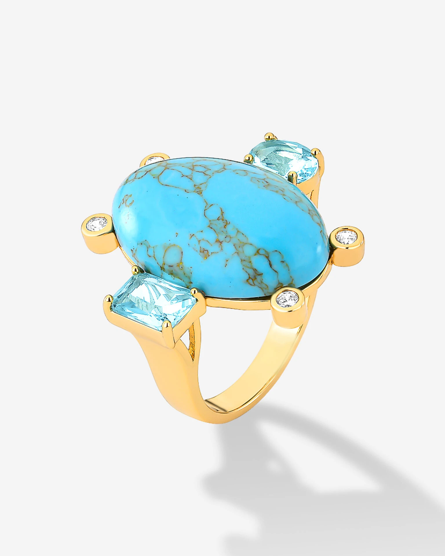 A impactante beleza do Anel Bright Soline, se deve as maravilhosas nuances de azul exibidas nos diferentes formatos que recobrem seu topo; em zircônias no tom água marinha cravejadas em formas geométricas ou na imponente Turquesa Reconstituida, arrematada por pequenos pontos de luz que conferem um must de refinamento ao conjunto. Disponível em banho de ouro 18k.