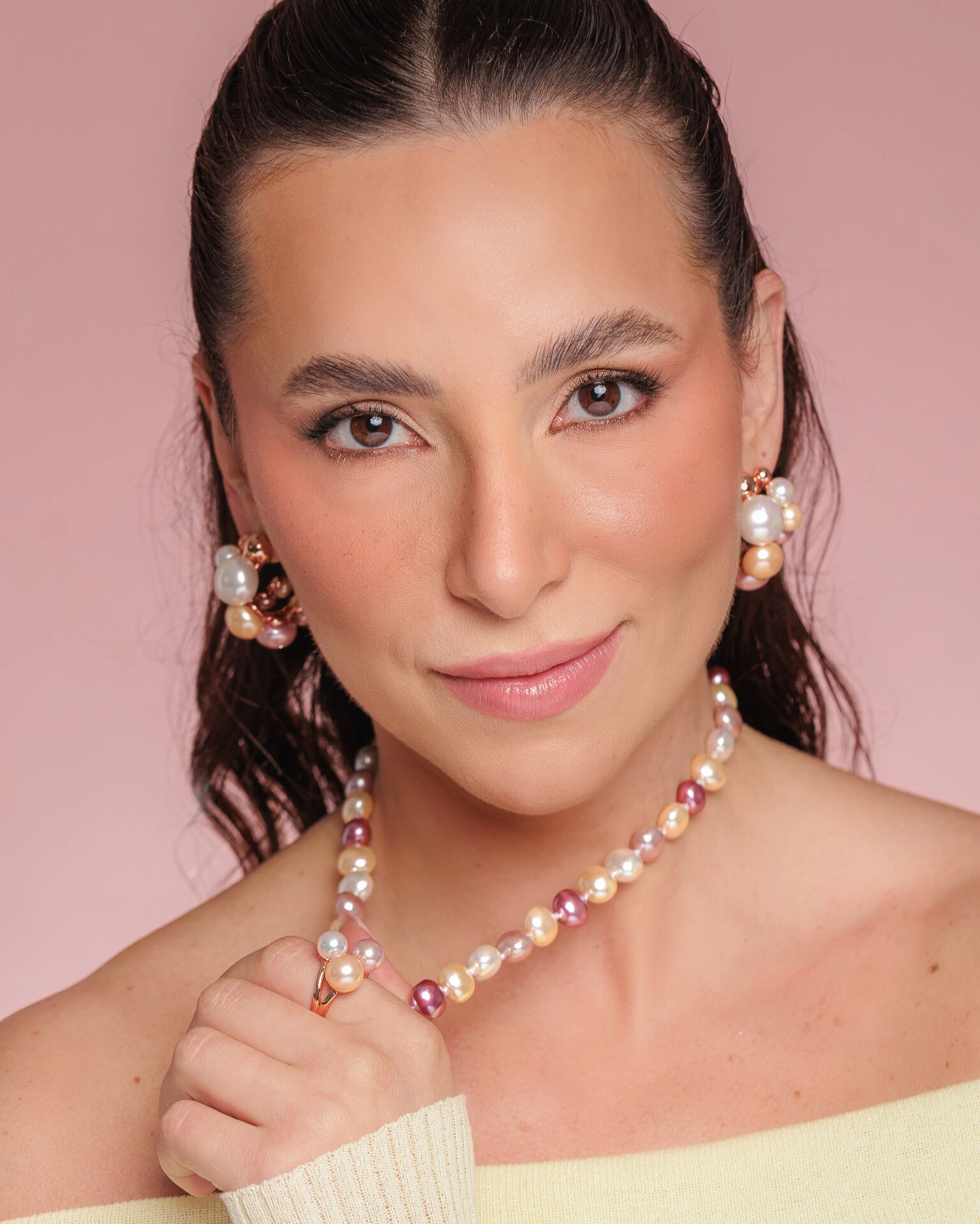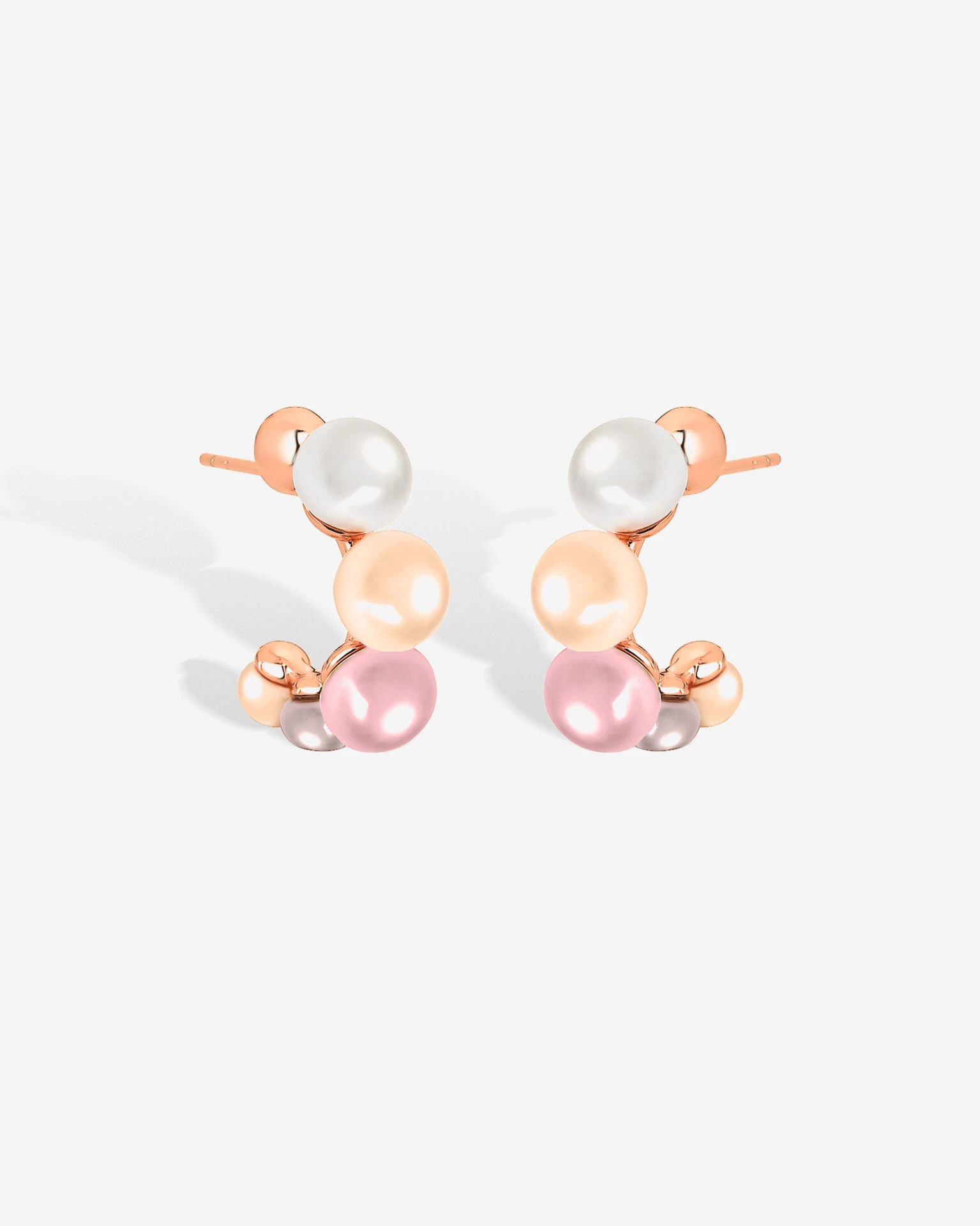 Brinco Argola Rose, formado por pérolas shell em tons de branco, beje e rosa e com o banho de Ouro Rosé