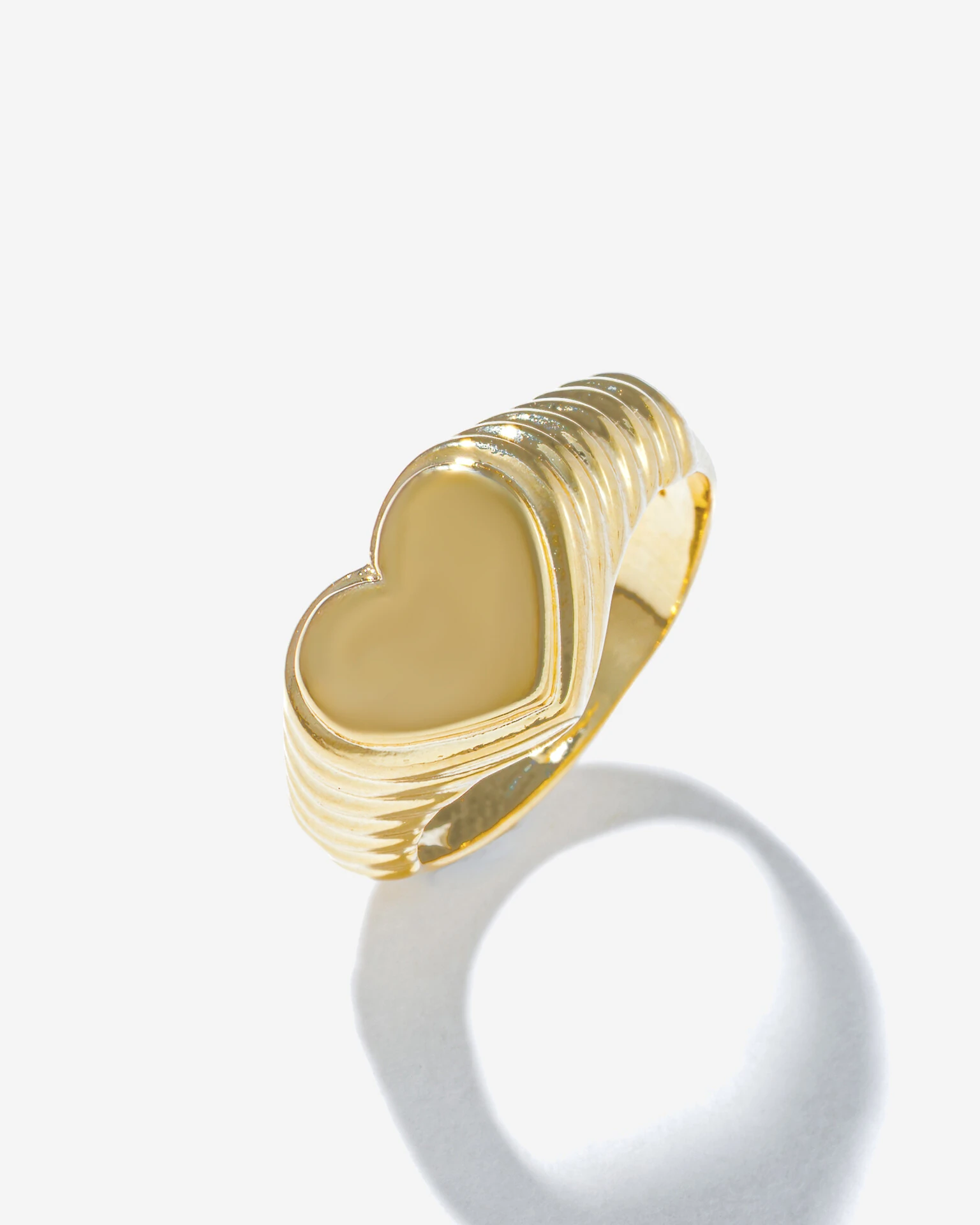 Romântico e imponente, este anel apresenta um design marcante com coração central em acabamento polido e estrutura robusta com detalhes em relevo em banho de ouro 18k