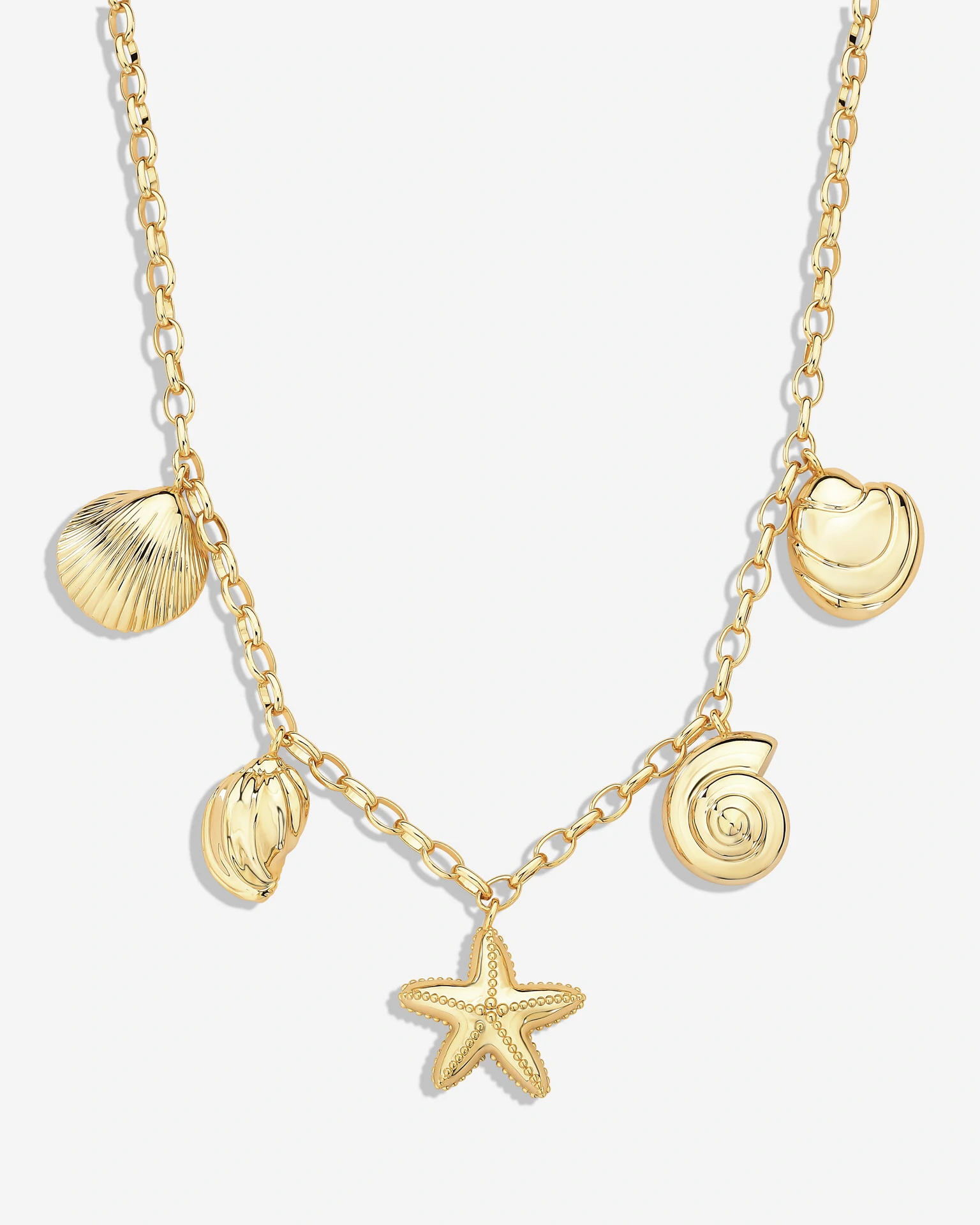 Colar em elos com pingentes temáticos de verão, com conchas e estrela em banho de ouro 18k, perfeito para montar um mix para o seu verão.