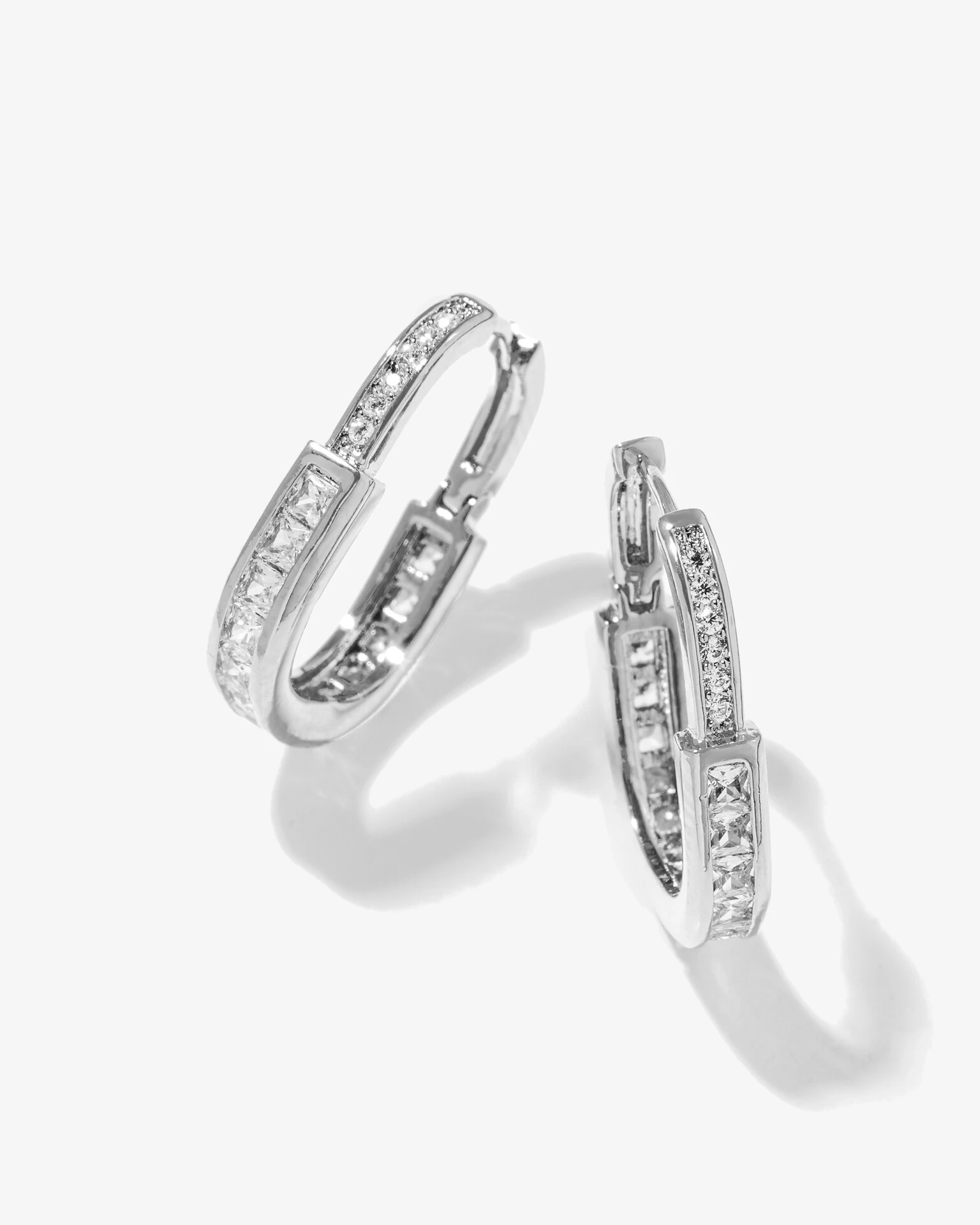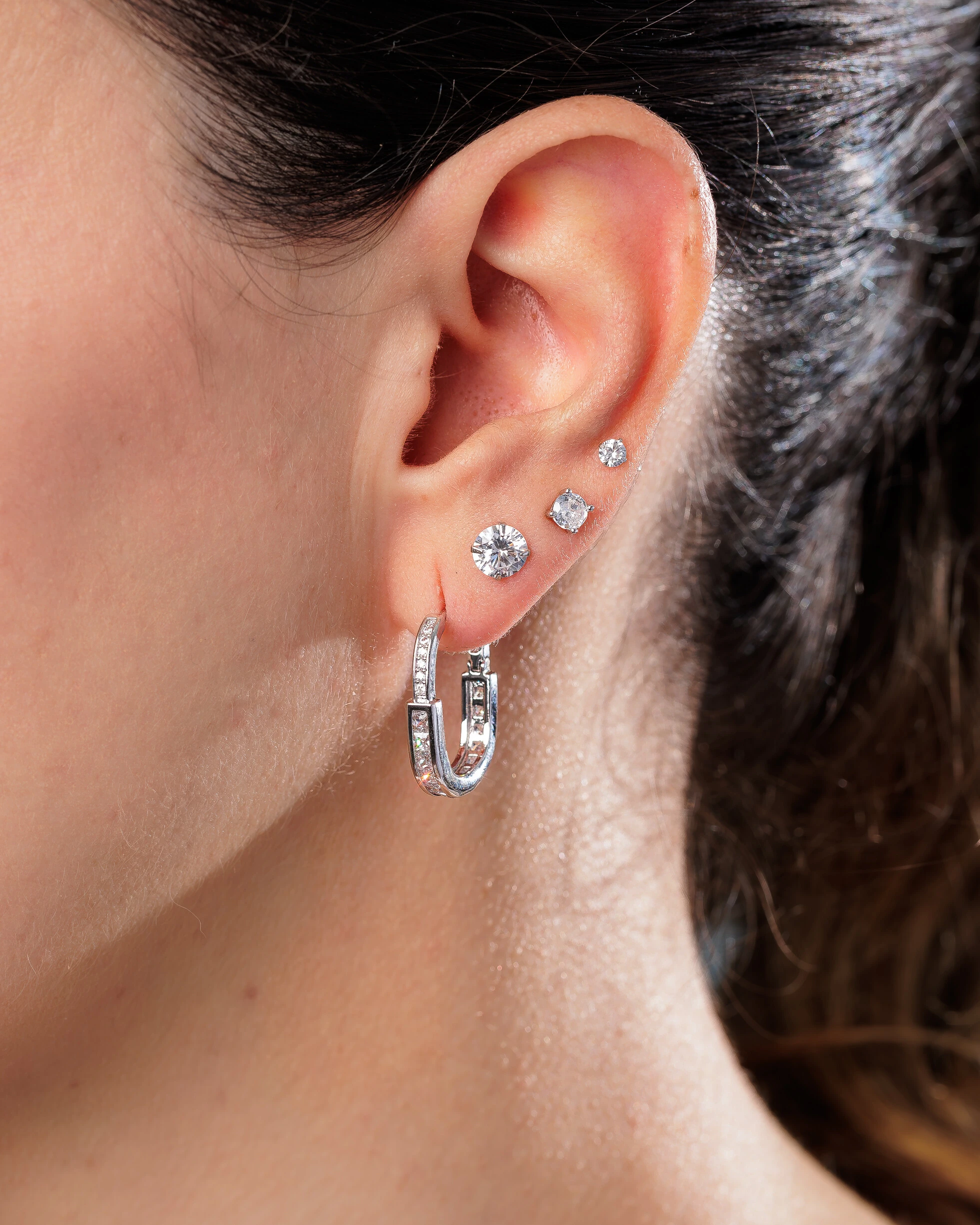 A argola Mariana é uma combinação de sofisticação e charme, com banho em ródio e ouro 18k cravejado em dois tamanhos de zircônia.