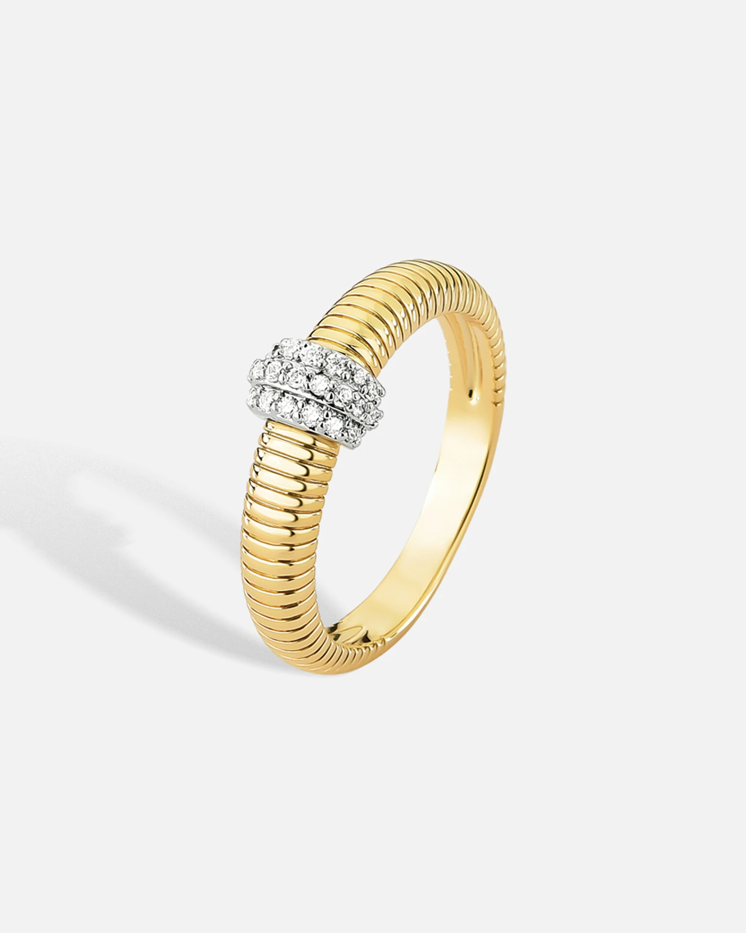 Com design minimalista de linhas suaves e textura canelada, o Anel Cora, é a prova de que menos pode ser mais, quando buscamos elegância em pequenos detalhes. O aro tubular canelado em banho de ouro 18k, contrasta delicadamente com 3 argolinhas caneteadas em ródio branco, repletas de brilhantes zircônias cristais, resultando em um modelo sutilmente divino.