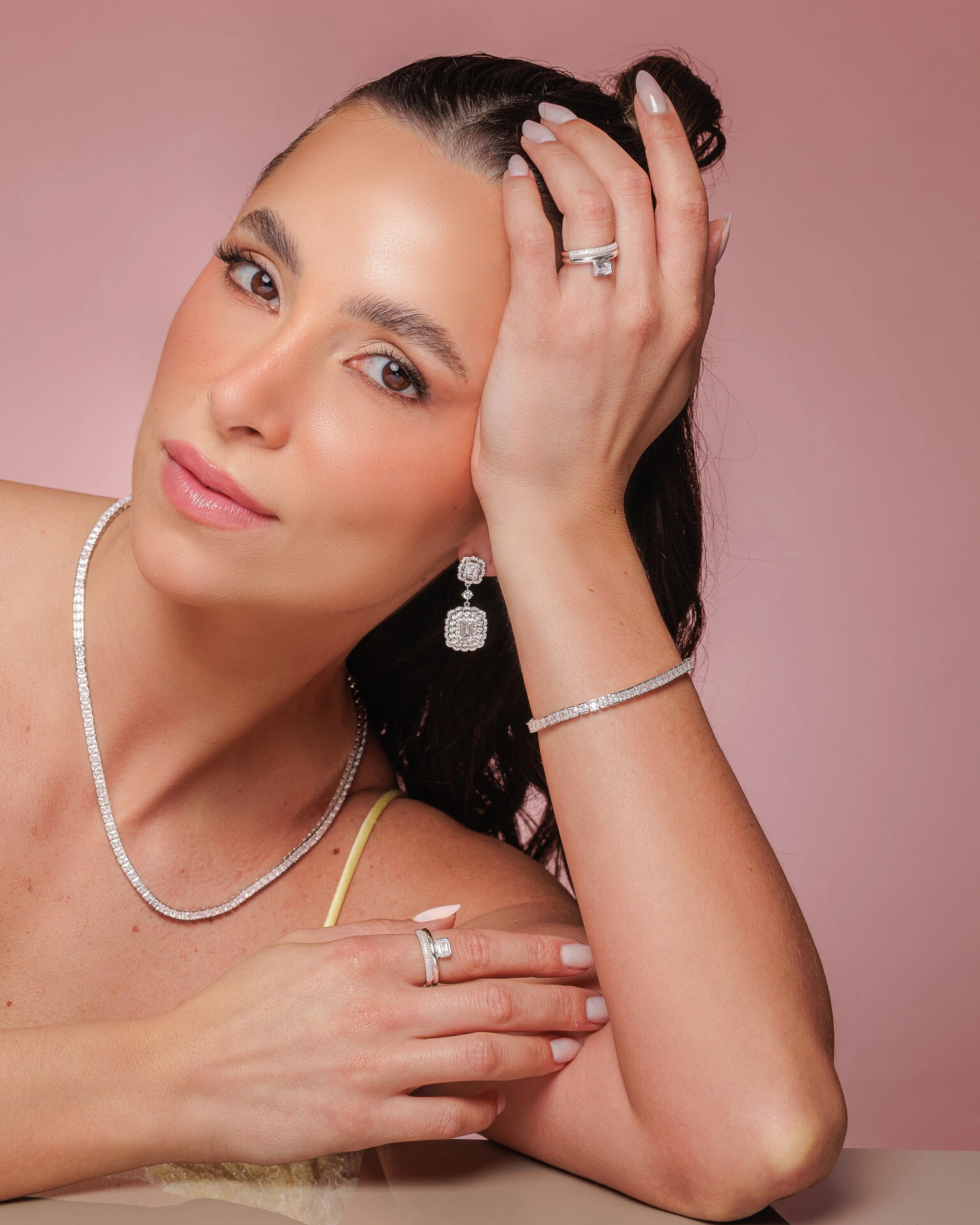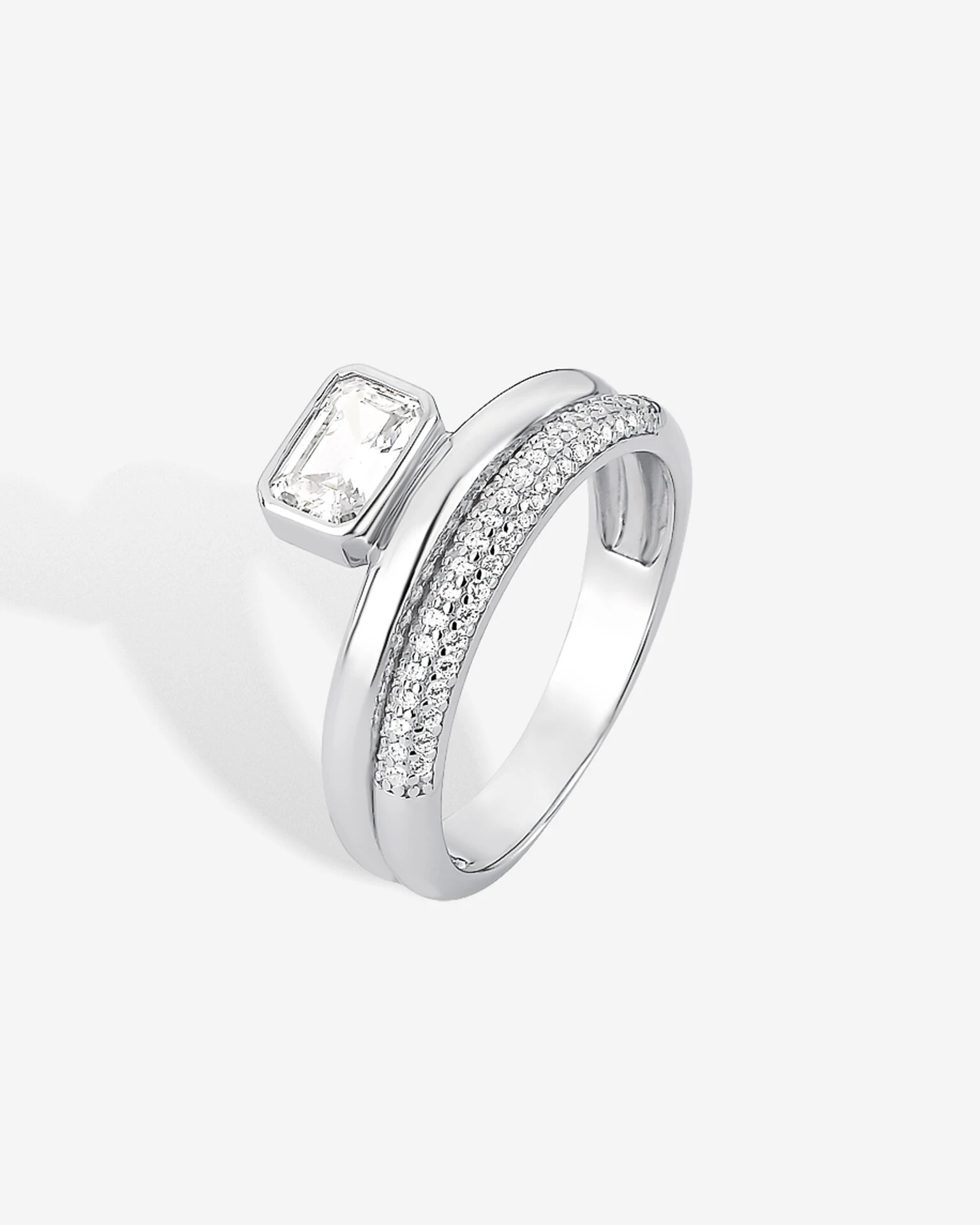 Anel Cibelle, uma bela joia em prata 925 e em banho de ródio, com duplo aro sendo um cravejado com microzorcônias e acima uma Zircônia cristal em corte Baguette, tendo uma peça sofisticada e delicada.