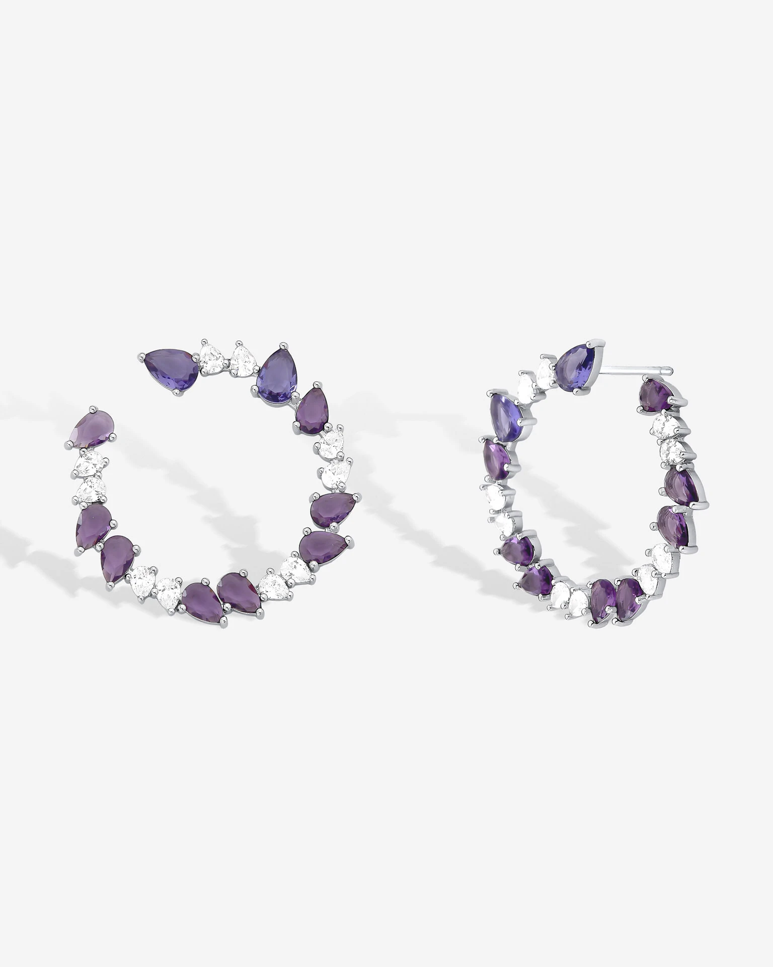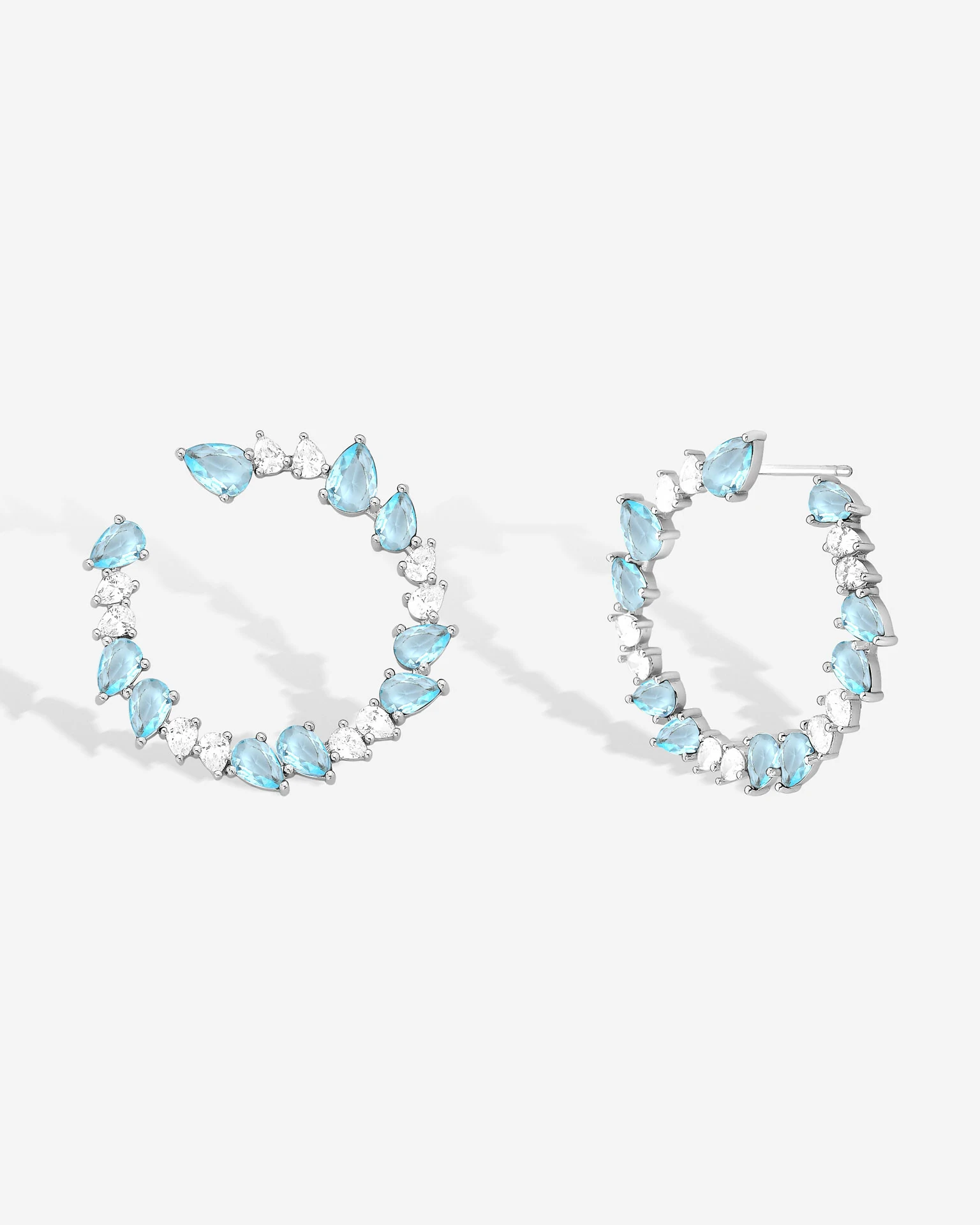 Argola frontal com zircônias em lapidação gota e banho de ródio branco. Design elegante que ilumina o rosto com leveza.
