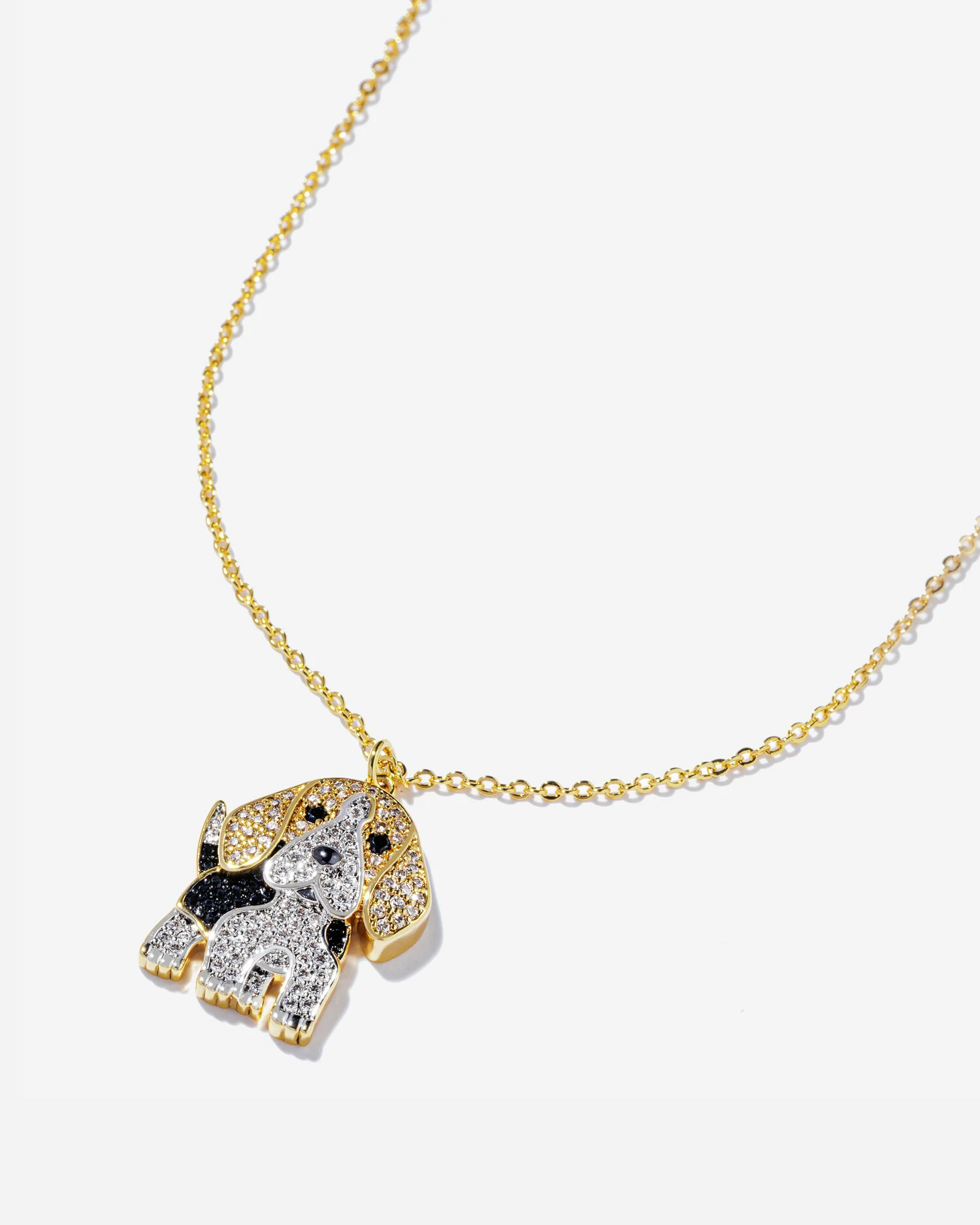 Para os apaixonados por pets, será difícil resistir ao Colar Beagle. Um adorável cachorrinho de manchas recobertas de zircônias nos tons Cristal e Ônix, em um jogo de banhos que realçam a beleza de seus brilhos e criam um ar de fofura irresistível. Em banho de ouro 18k e detalhes caneteados em banho de ródio.