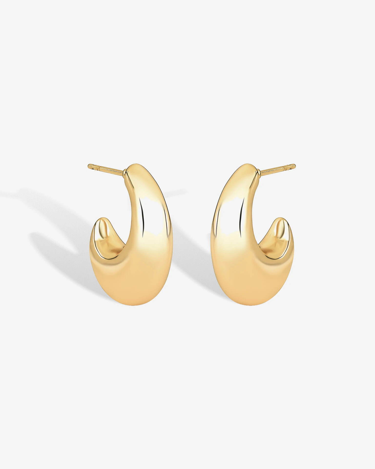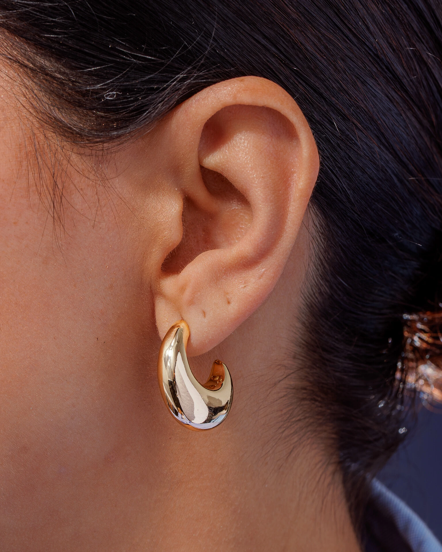 Brinco Argola moderna em banho de Ouro 18k com formato meia lua e brilho intenso. Leve, elegante e perfeita para usar no dia a dia ou em produções mais sofisticadas.