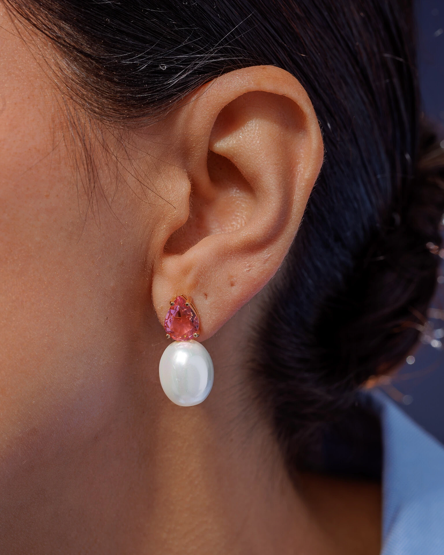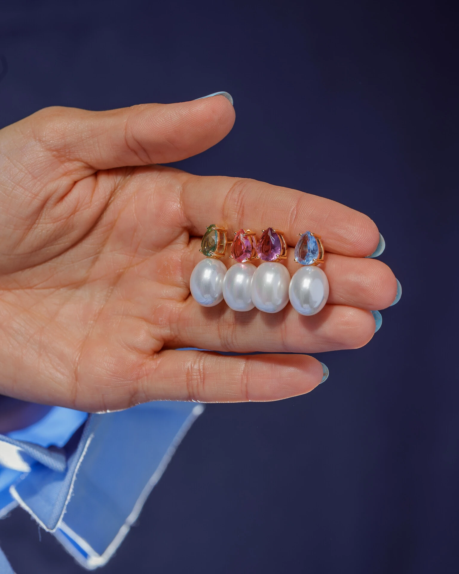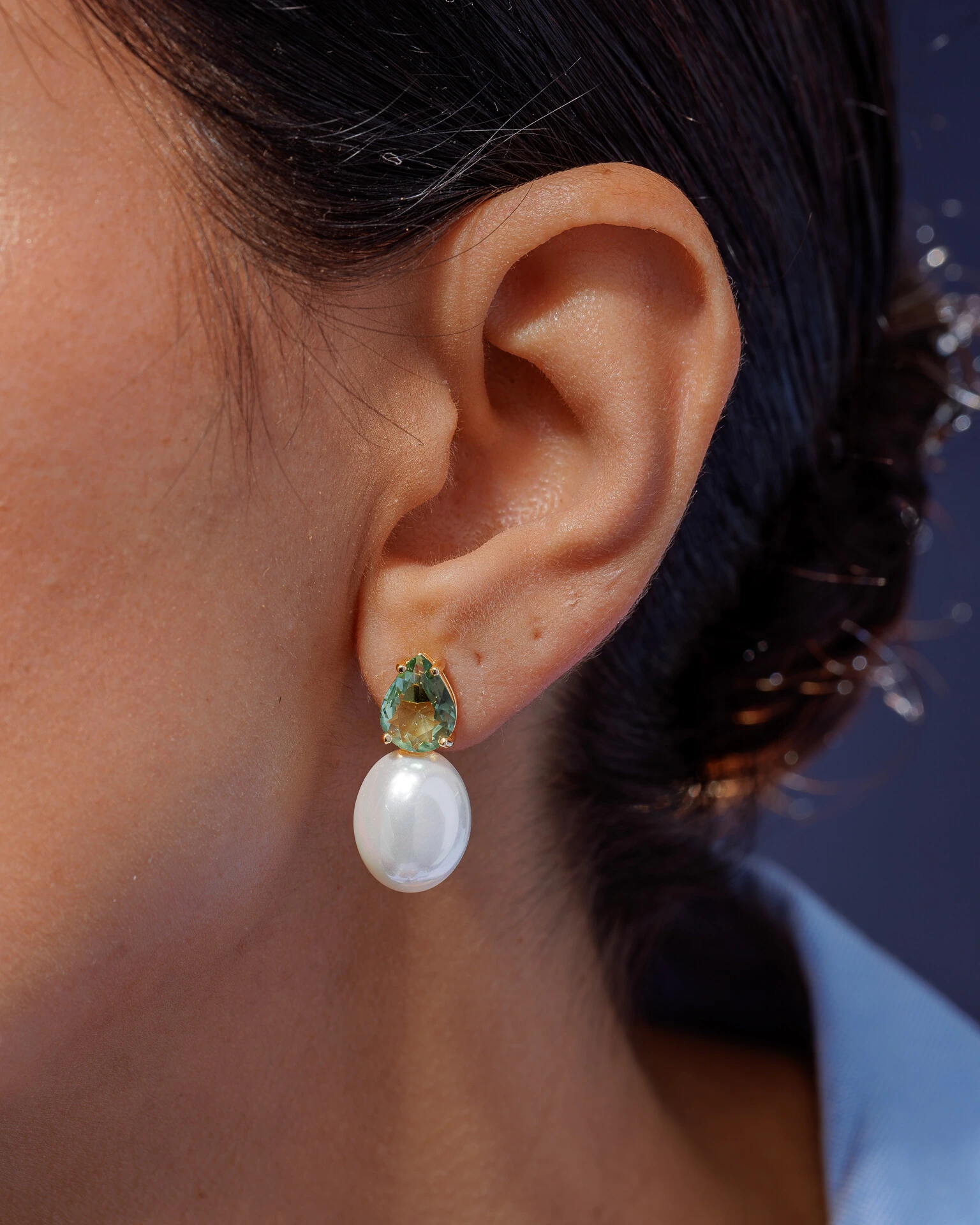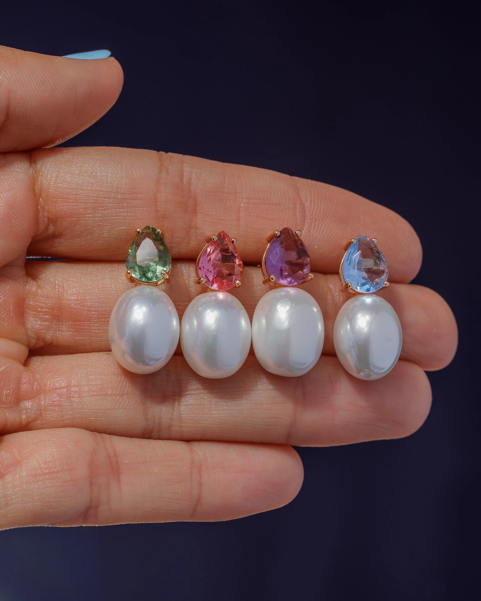 Brinco com banho de Ouro 18k com combinação de gota lapidada e pérola, trazendo brilho e delicadeza em uma peça moderna e versátil para qualquer ocasião.