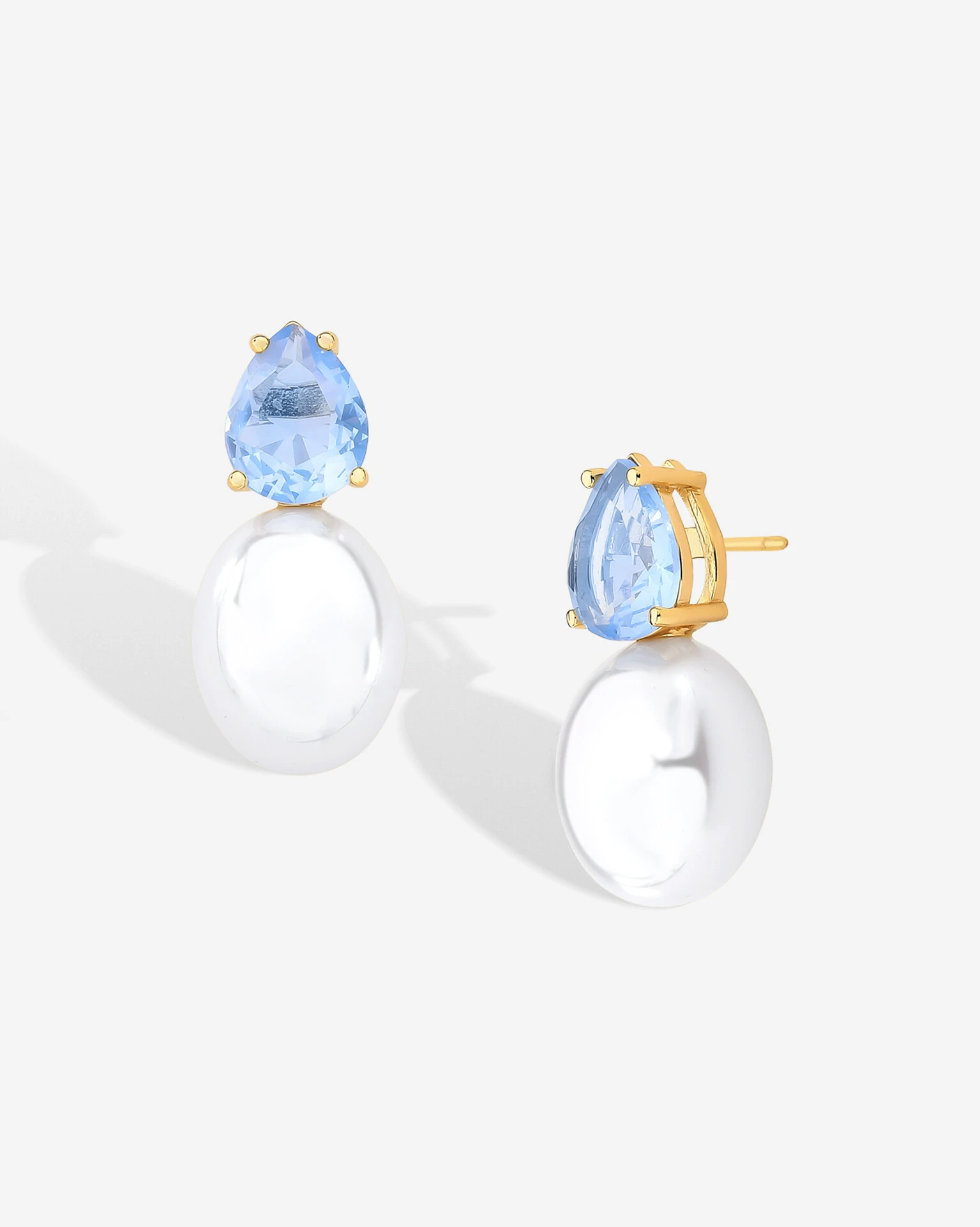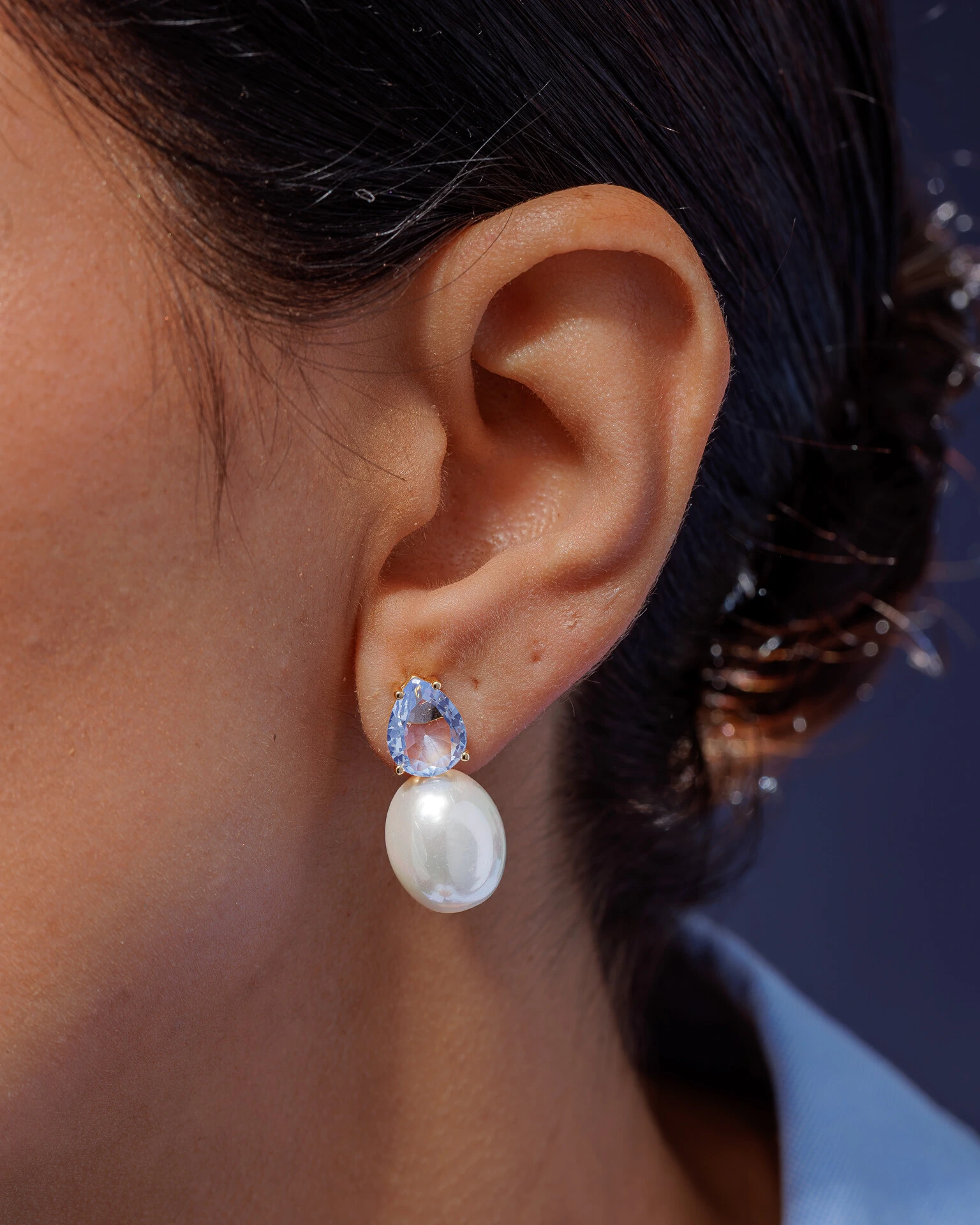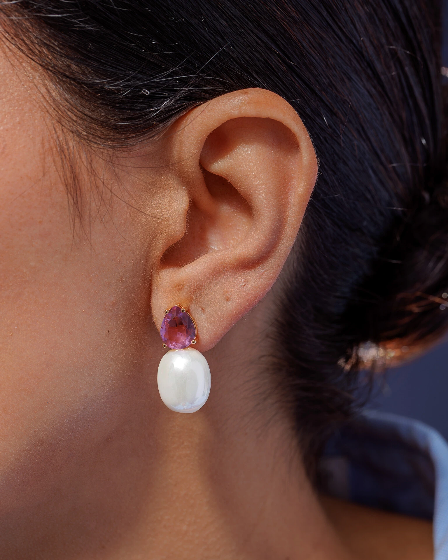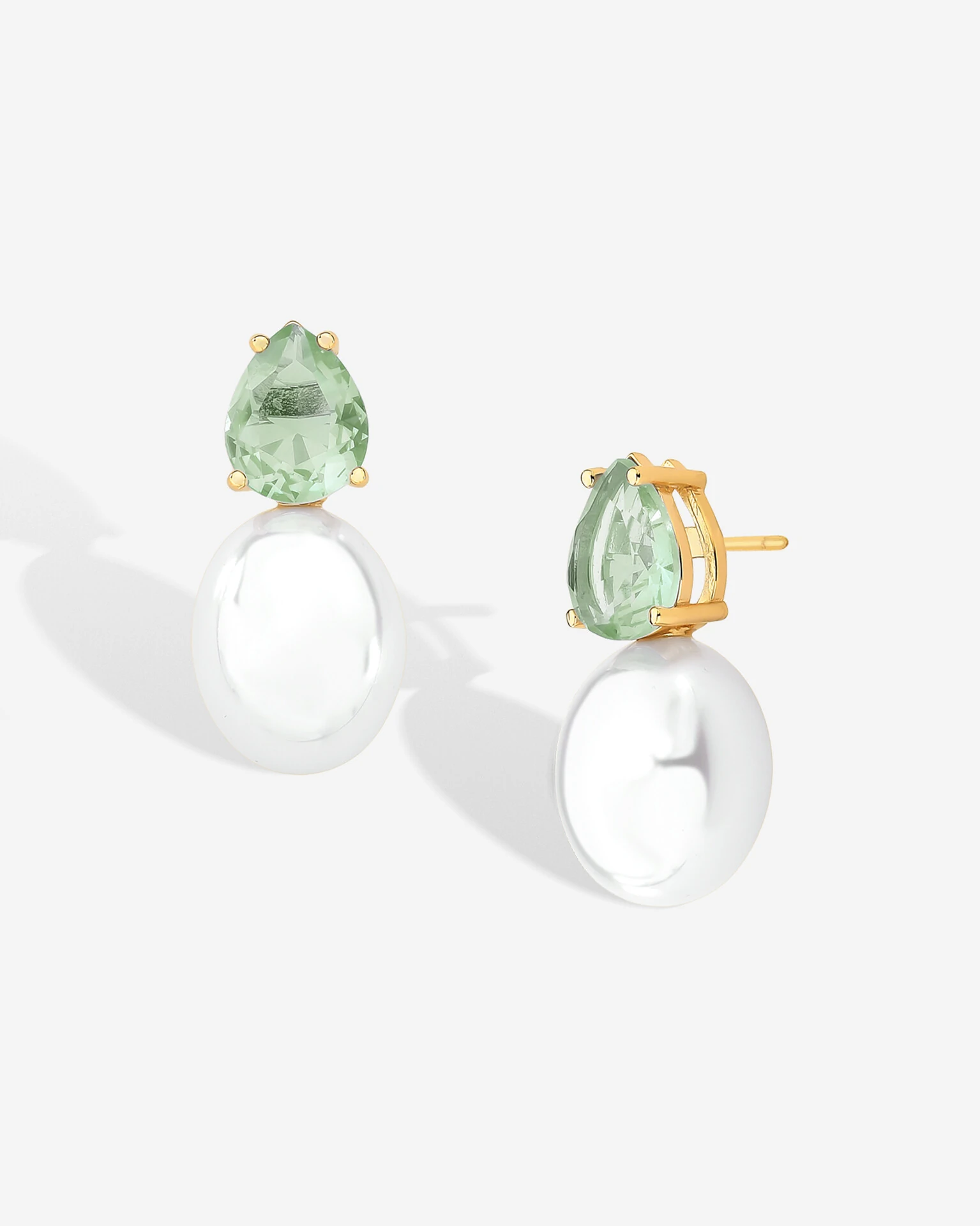 Brinco com banho de Ouro 18k com combinação de gota lapidada e pérola, trazendo brilho e delicadeza em uma peça moderna e versátil para qualquer ocasião.