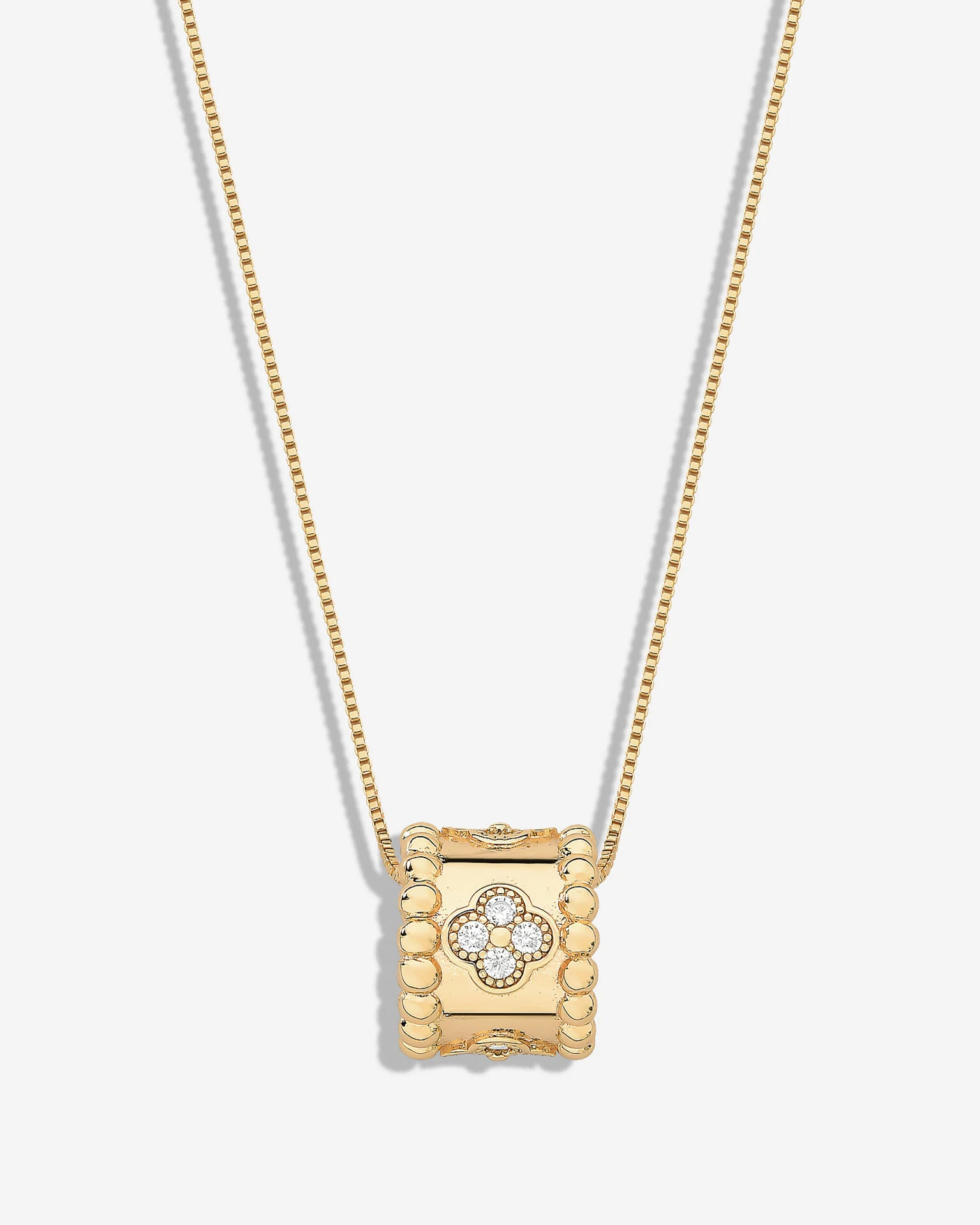 Colar Louis, em banho de ouro 18k, modelo delicado com um design sofisticado, a elegante corrente de elos Veneziana sustenta um pingente tipo carretel, trabalhado com pequenos trevos recobertos por zircônias cristais. Todo um luxo de detalhes que valorizam e embelezam qualquer look.C