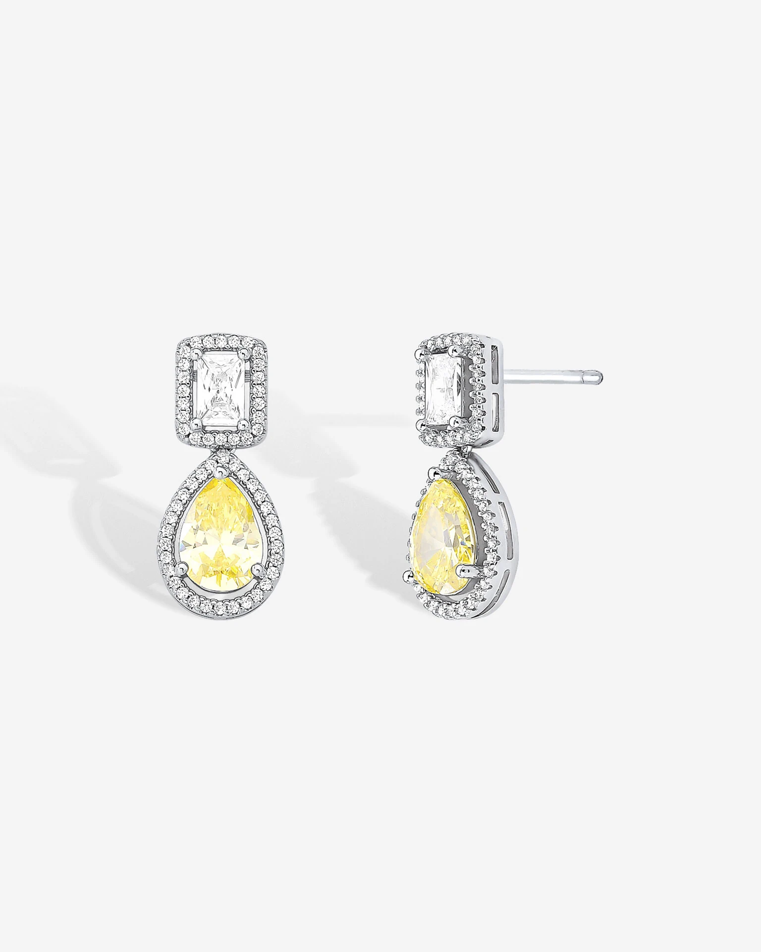 Brinco Marceline, composto por duas formas de zircônias sendo uma retângular cristal e outra em gota yellow fancy , com a mldura cravejado com microzircônias cristais.