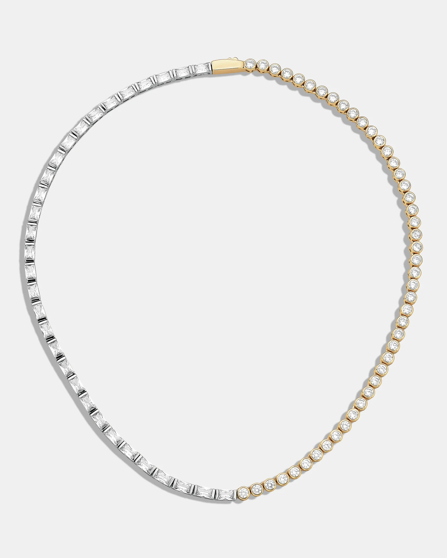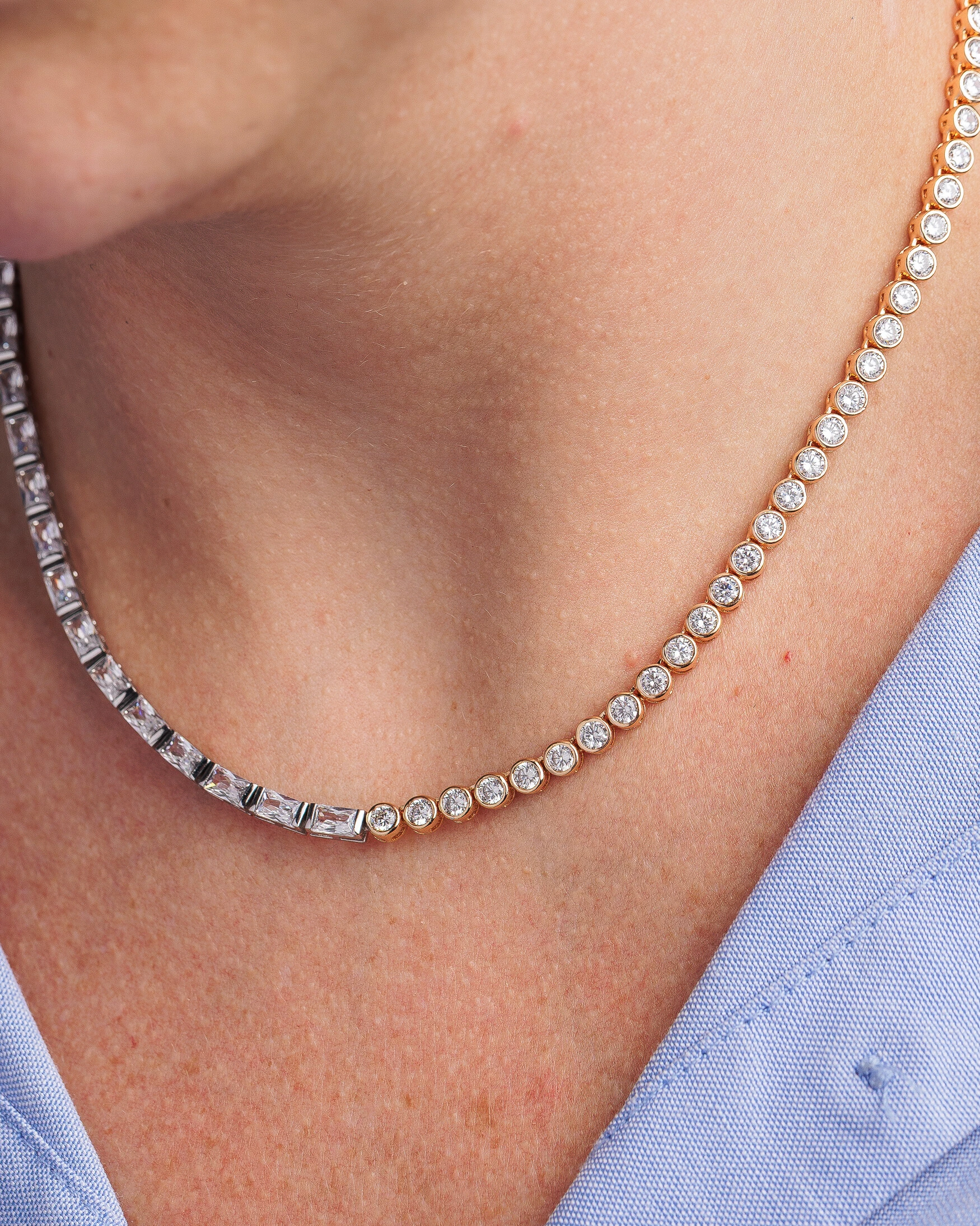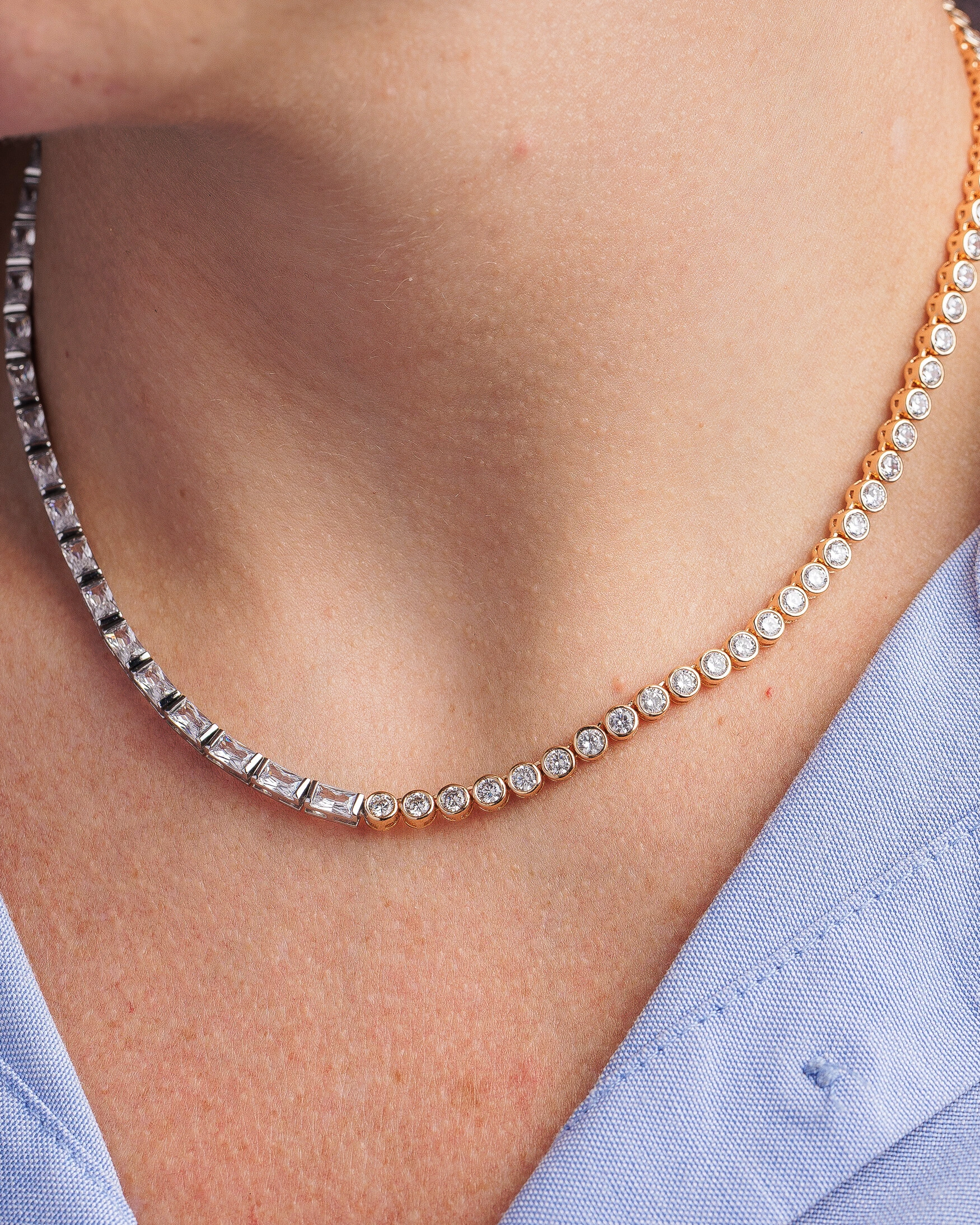 O Colar Riviera Martina, destaca a elegância da corrente com duo de banhos e o brilho maravilhoso de zircônias cristais em diferentes lapidações. Todo um toque de refinamento para valorizar seus momentos e destacar ainda mais a beleza de seus looks. Com banho de ouro 18k e ródio branco.