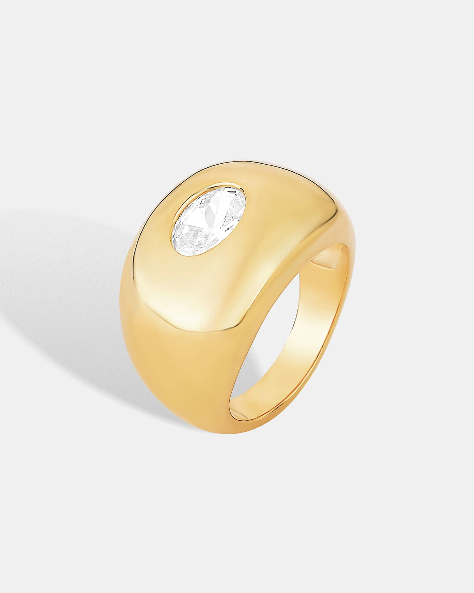 O brilho maravilhoso do banho de ouro 18k, envolve de elegância o volumoso aro abaulado do Anel Cecy, criando um belo contraste com o detalhe em zircônia cristal na lapidação Oval.