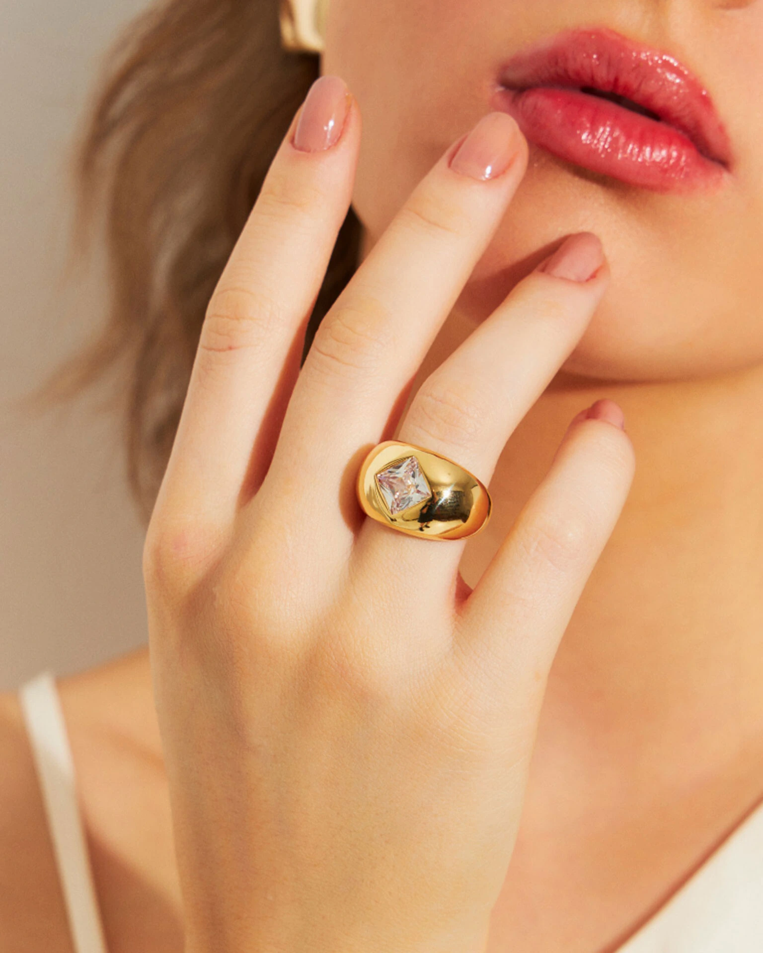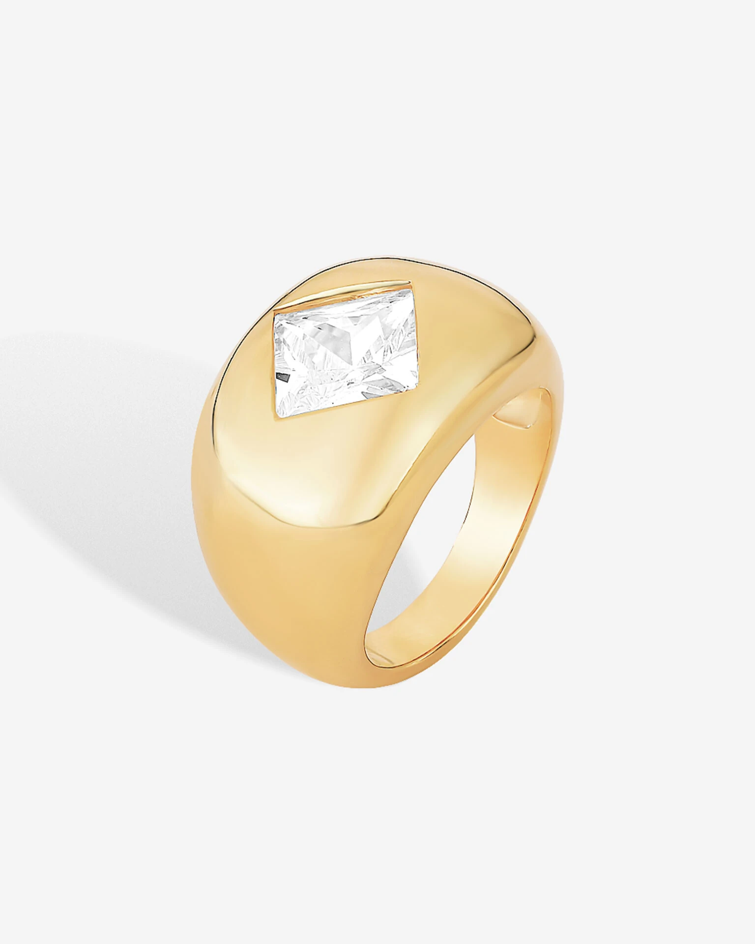 O brilho maravilhoso do banho de ouro 18k, envolve de elegância o volumoso aro abaulado do Anel Cecy - Square, criando um belo contraste com o detalhe em zircônia cristal na lapidação Quadrada.