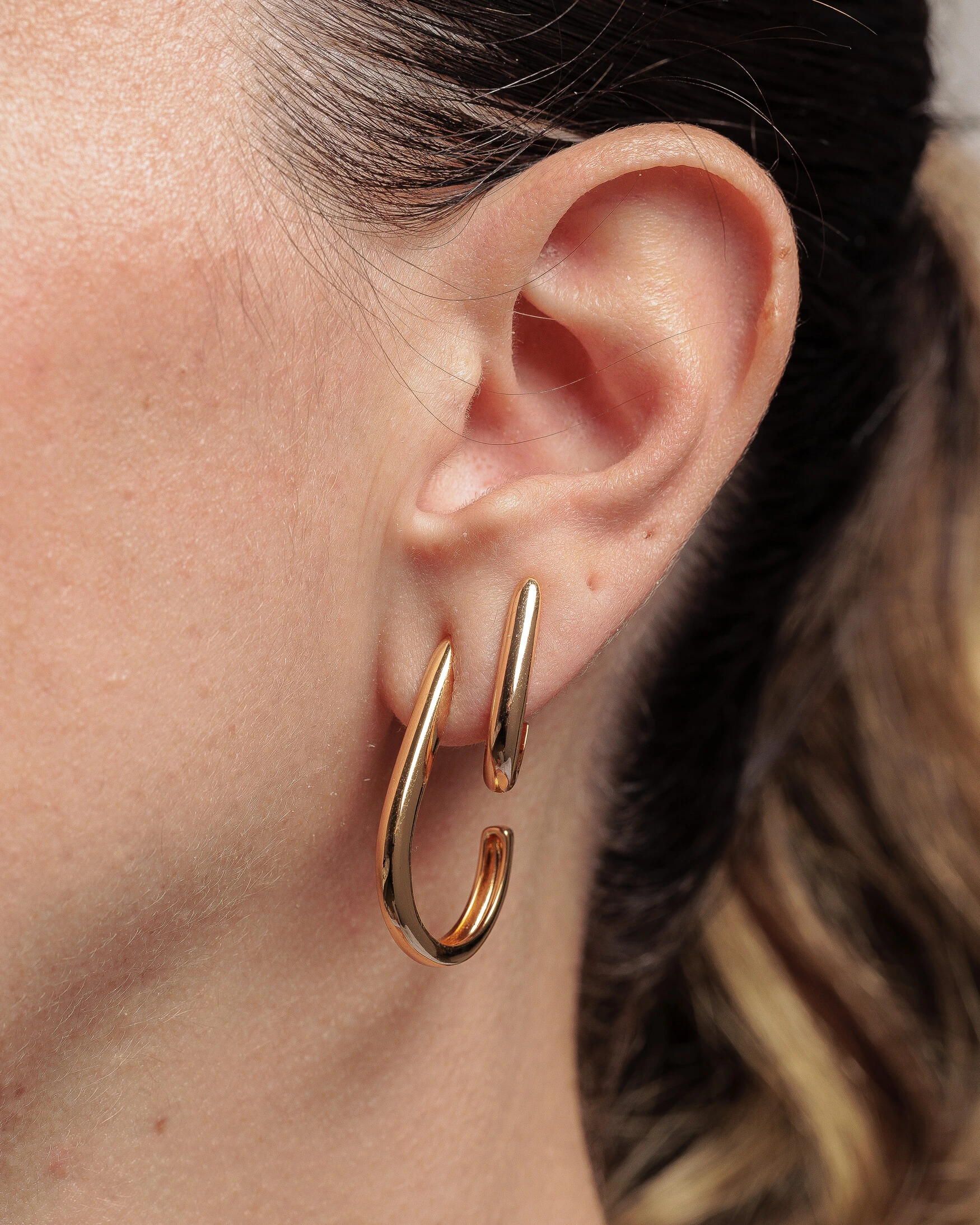 Modelo versátil de argola tipo gancho que une elegância e praticidade em sua linhas suaves, garantindo conforto e beleza para um look diário ou sofisticado. Disponível em banho de ouro 18k e ródio branco.
