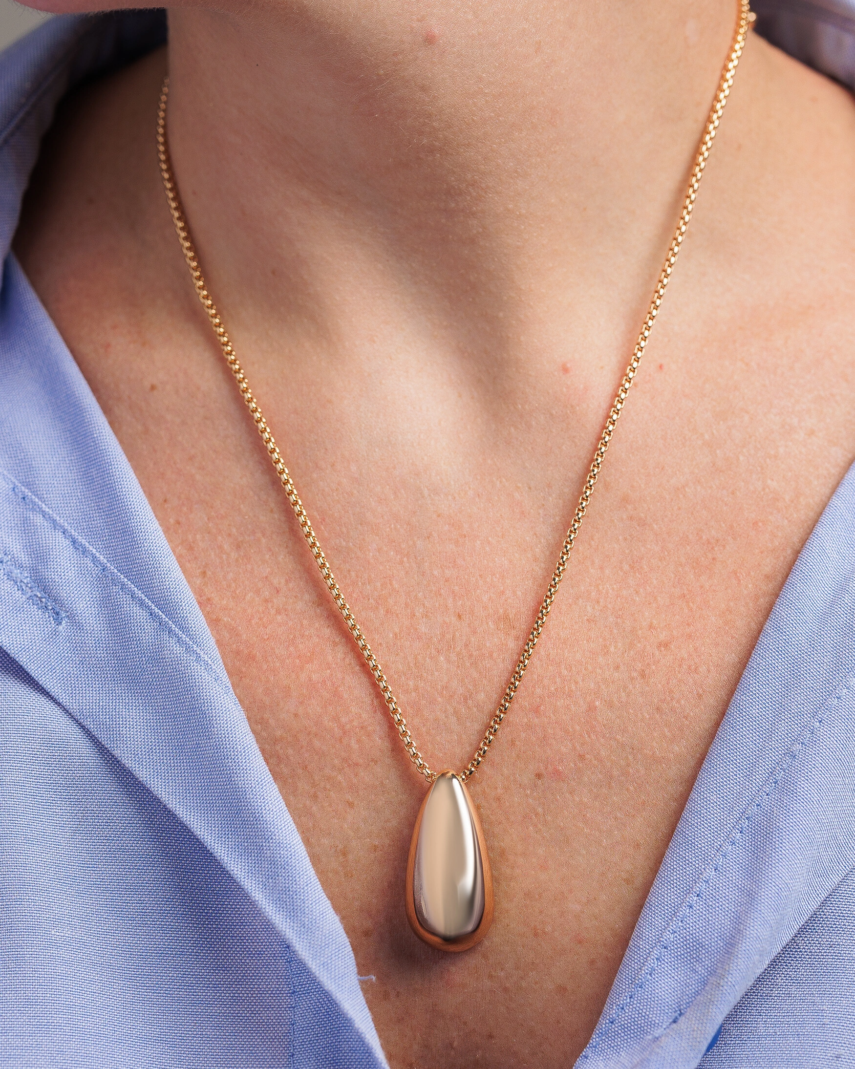 Marcante com seu pingente de gota alongada, o Colar Diva, é o tipo de acessório atemporal que impõe um estilo repleto de personalidade e elegância. Ele se destaca pela beleza de sua corrente grossa de malha Veneziana, que combina maravilhosamente com o formato volumoso de seu pingente, refletindo o brilho sofisticado do banho de ouro 18k.