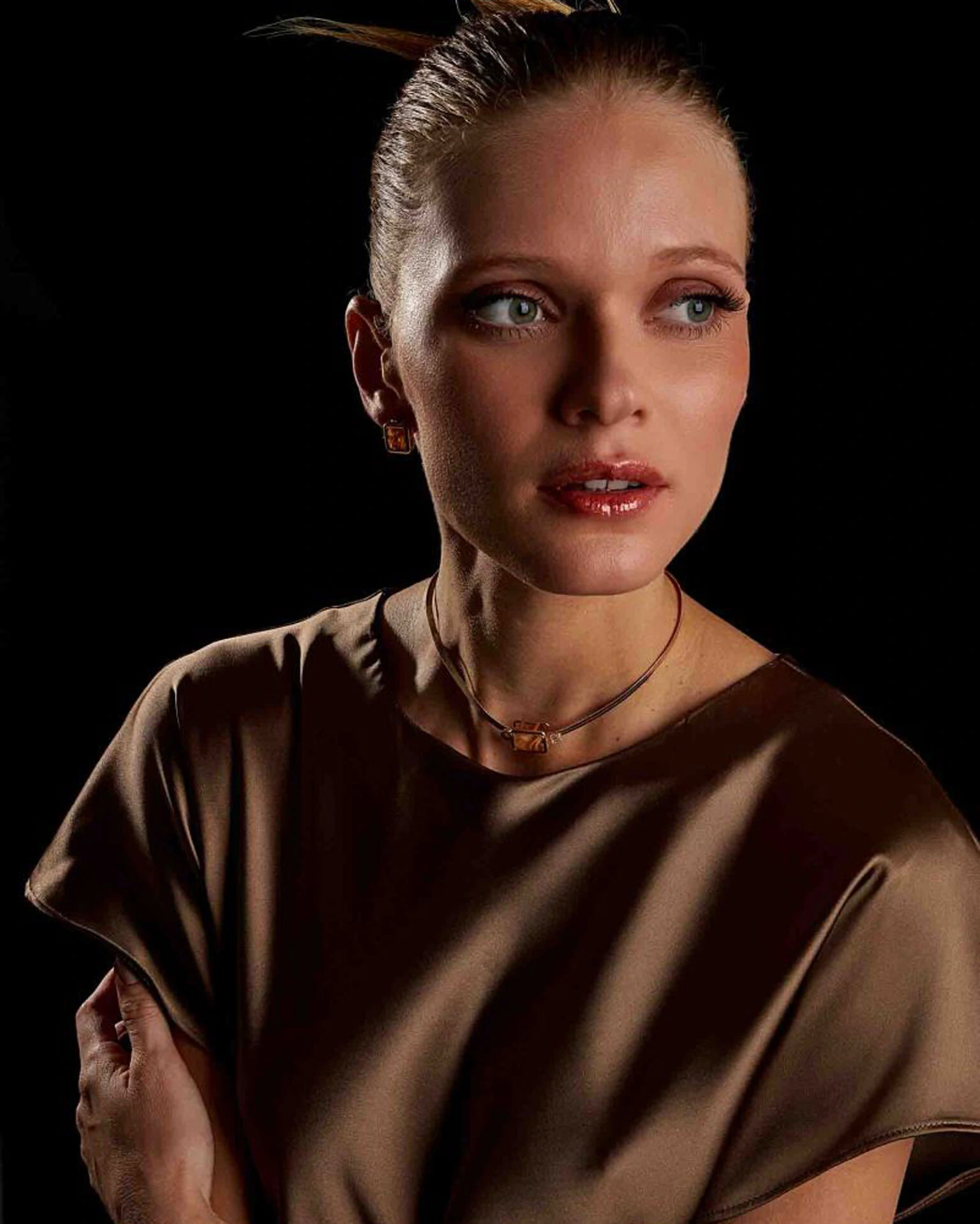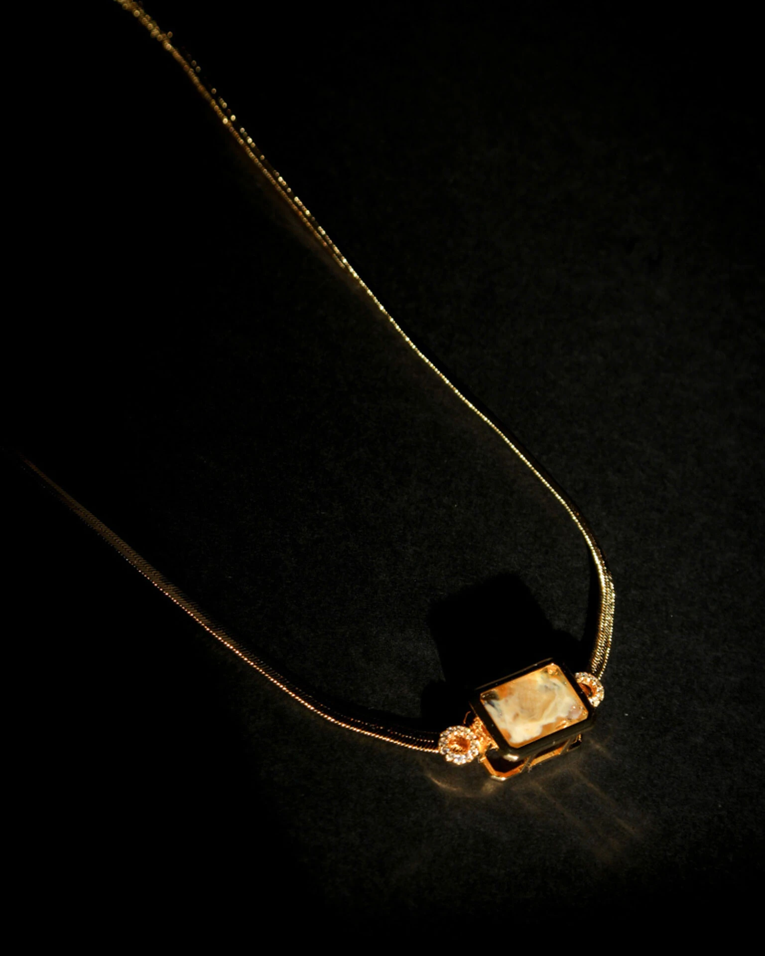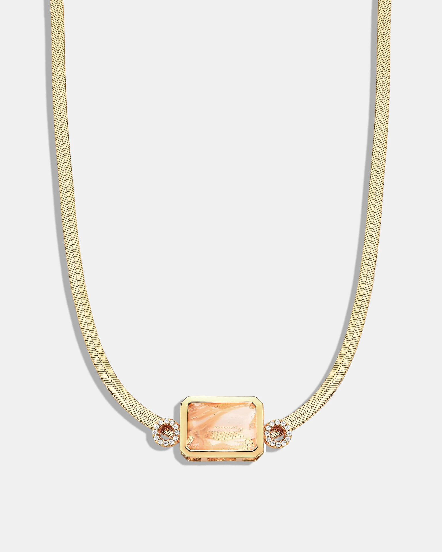 Todo um conjunto de detalhes transformam a Choker Leah, em banho de ouro 18k, em um acessório divinamente elegante. Sua corrente de malha é delicadamente envolvida pelo pingente de Morganita retangular na cravação Inglesa, a composição é finalizada por dois pequenos aros recobertos por pontos de luz em micro zircônias cristais.